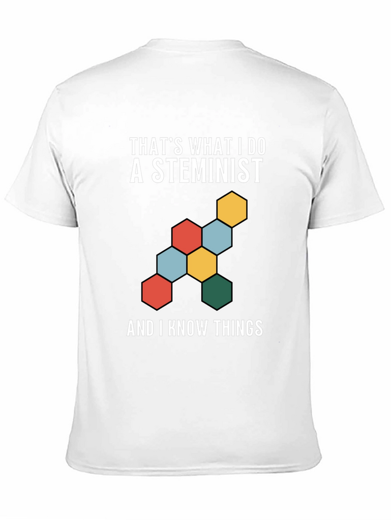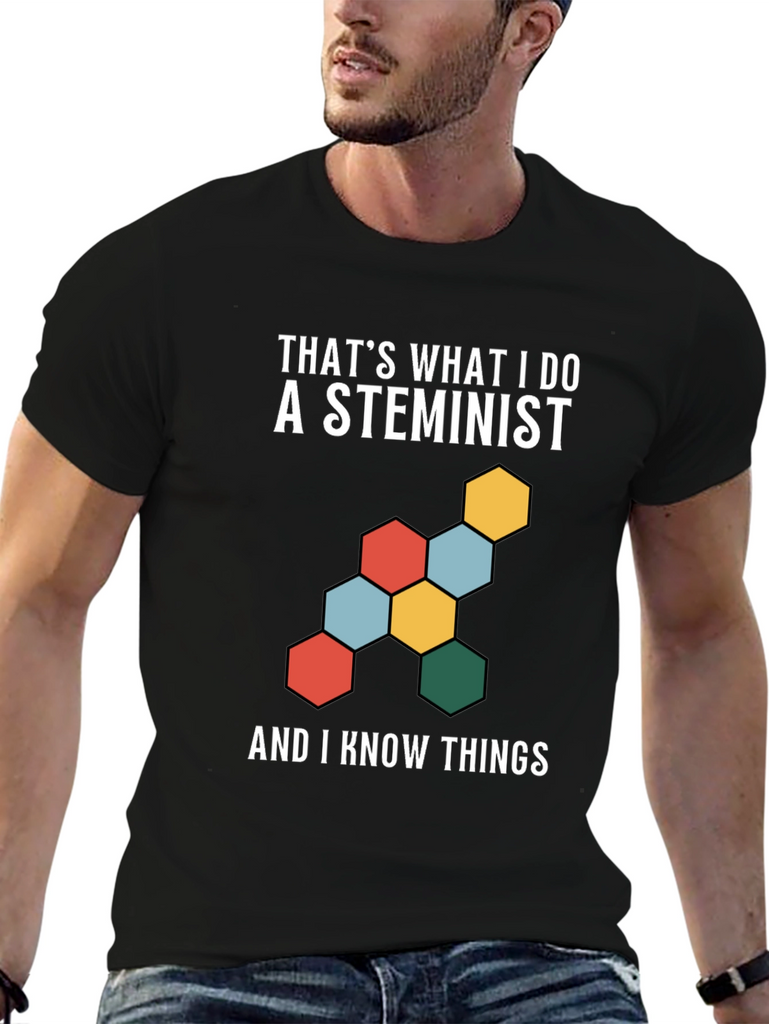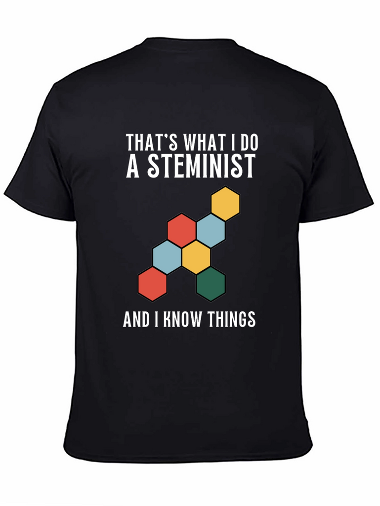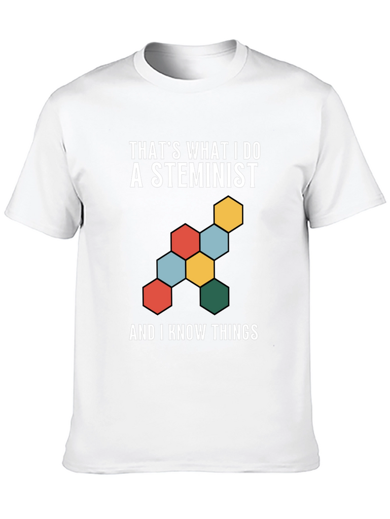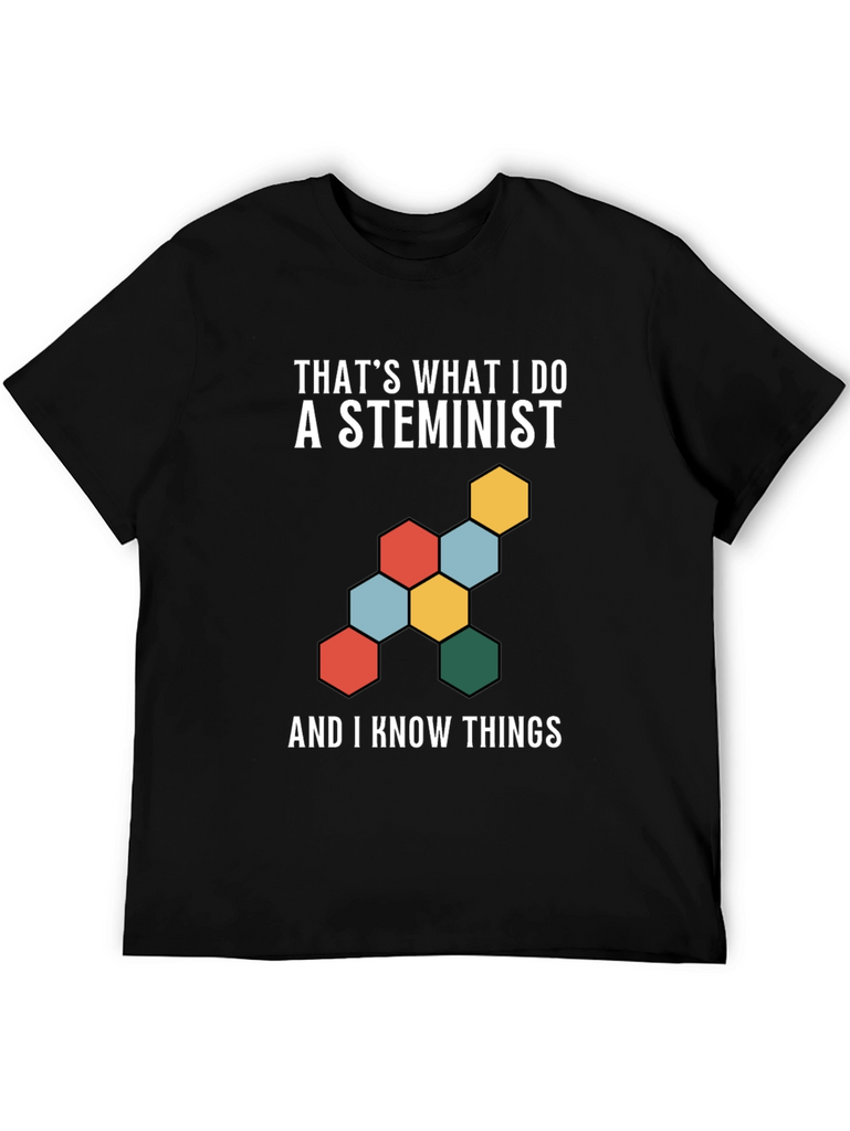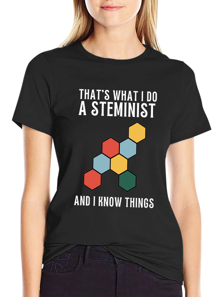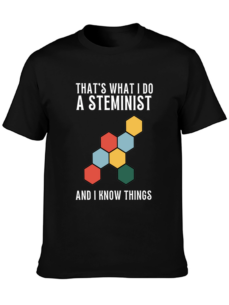 Show off your passion for science and feminism with this unique STEMinist t-shirt! This black tee features a playful design with colorful geometric shapes resembling molecular structures. The witty text "THAT'S WHAT I DO A STEMINIST AND I KNOW THINGS" adds a touch of humor and intelligence. Perfect for scientists, students, or anyone who appreciates a clever and stylish statement piece. Made from a comfortable material, this t-shirt is ideal for casual wear, science events, or as a gift for the STEM enthusiast in your life. Get yours today and embrace your inner STEMinist!