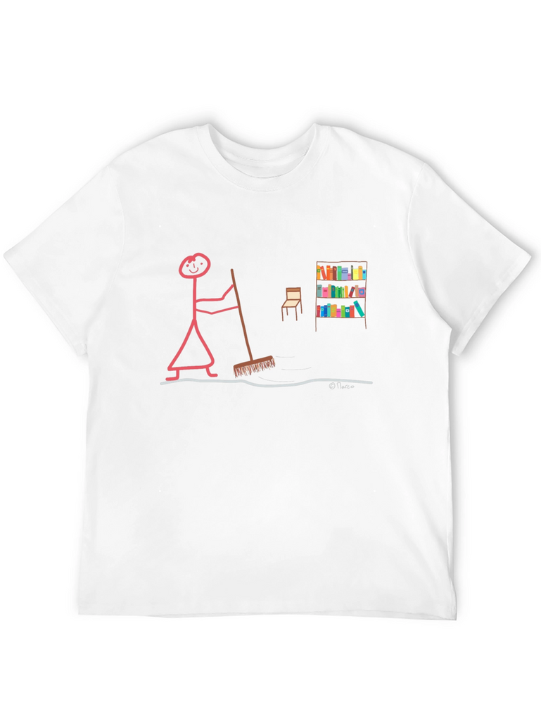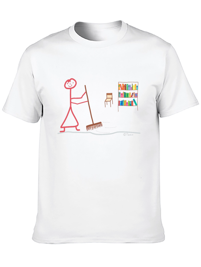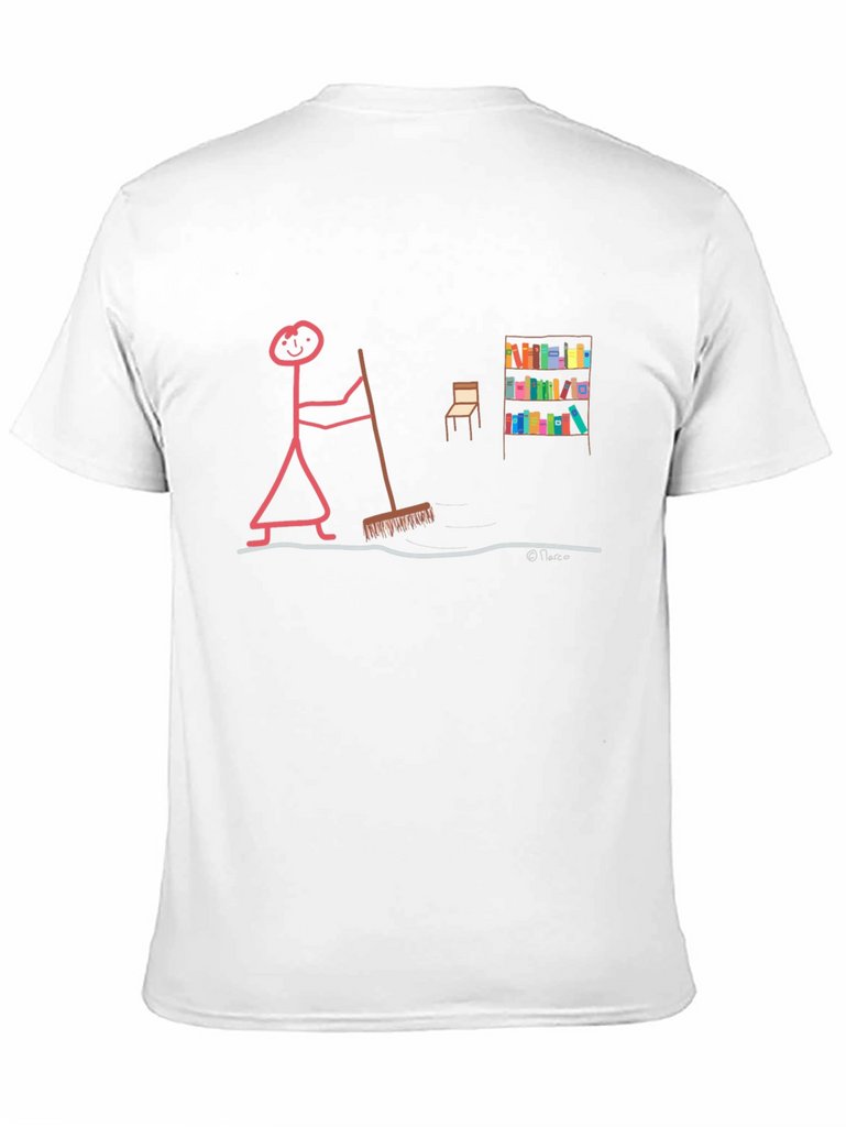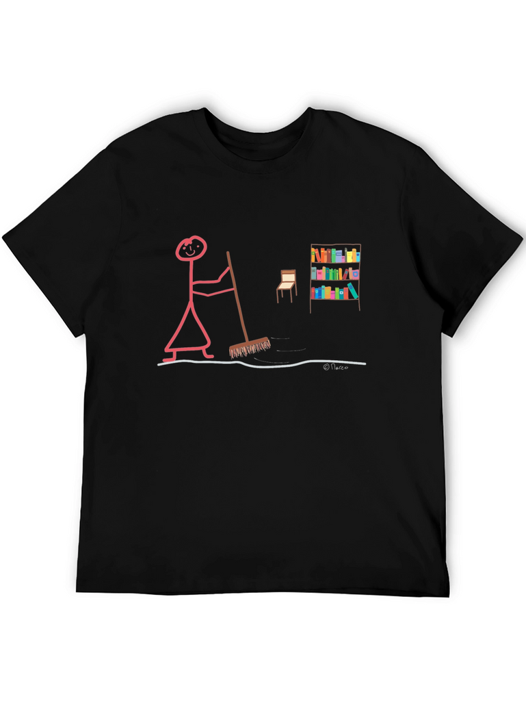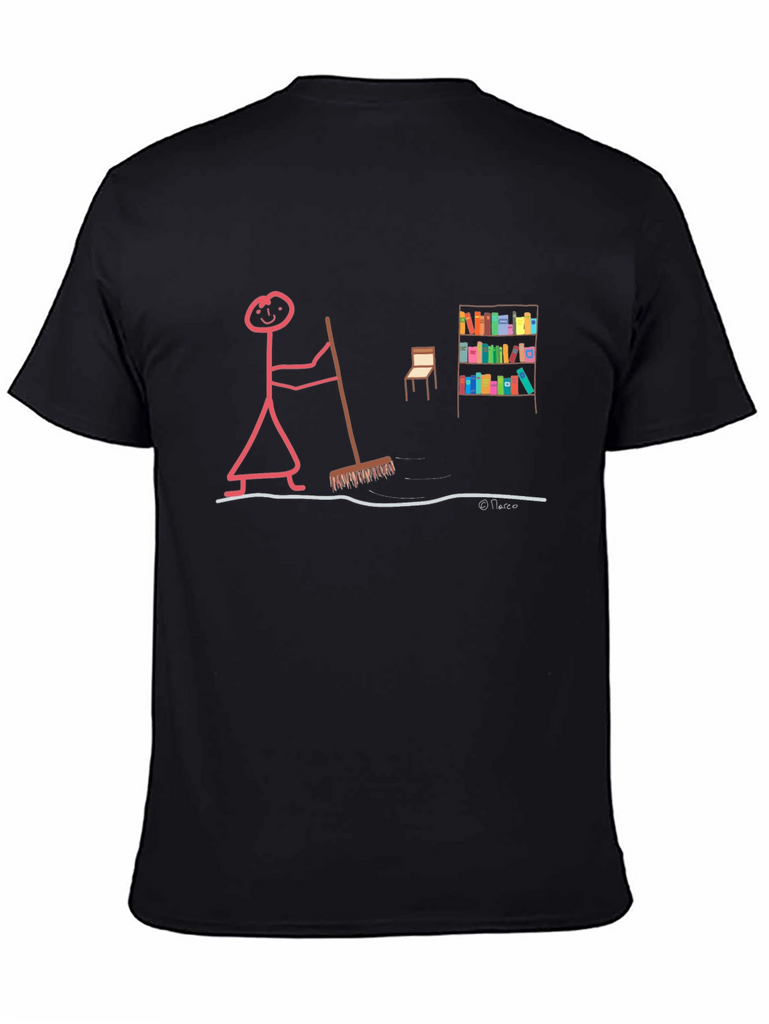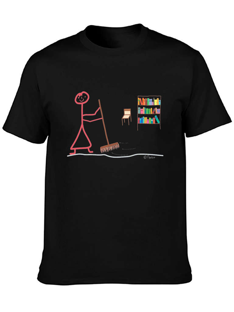 Show off your quirky side with this unique black t-shirt. The shirt features a whimsical graphic of a stick figure character sweeping with a broom, inside what appears to be a book-filled room. Made from a comfortable-looking fabric, this tee is perfect for casual wear, library visits, or showcasing your playful personality. Its minimalist design adds a touch of artistic flair to your wardrobe, making it a conversation starter wherever you go. This graphic tee makes a fun, lighthearted statement.