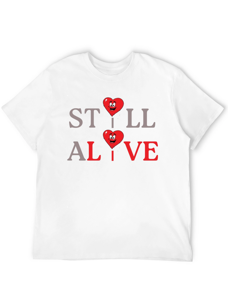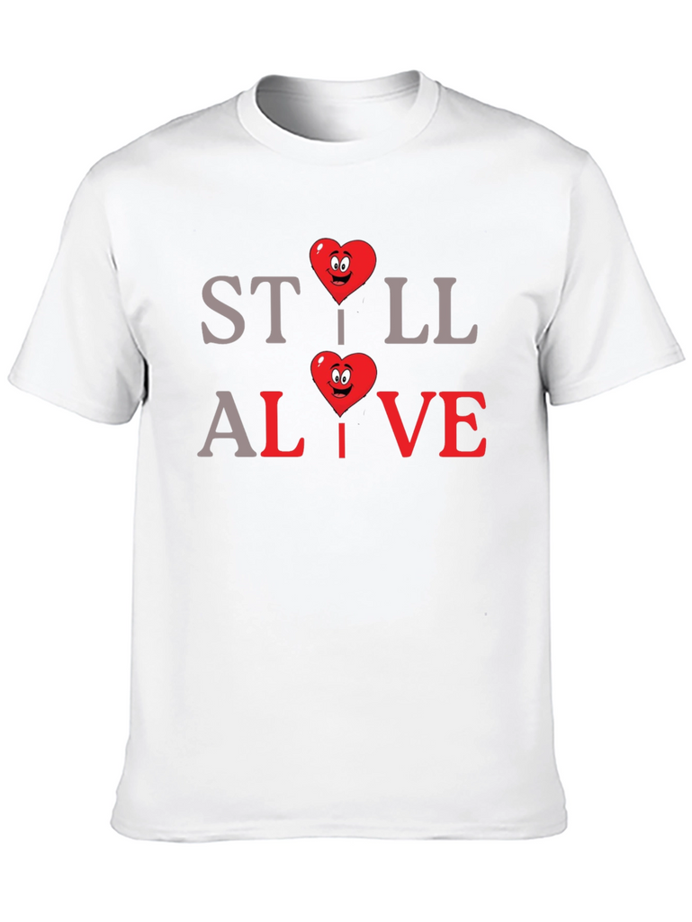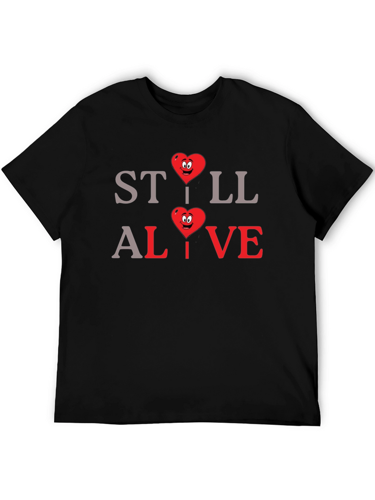 Show your playful side with this unique black t-shirt! Featuring the phrase 'Still Alive' with adorable heart characters replacing the 'I's', this tee is sure to spark conversation. The design is printed in a stylish combination of gray and red on a soft, comfortable fabric. This eye-catching shirt is perfect for casual wear, themed events, or adding a touch of whimsy to your everyday wardrobe. It's a great way to express your positive outlook and fun-loving personality. Pair it with jeans, shorts, or leggings for a relaxed and stylish look.