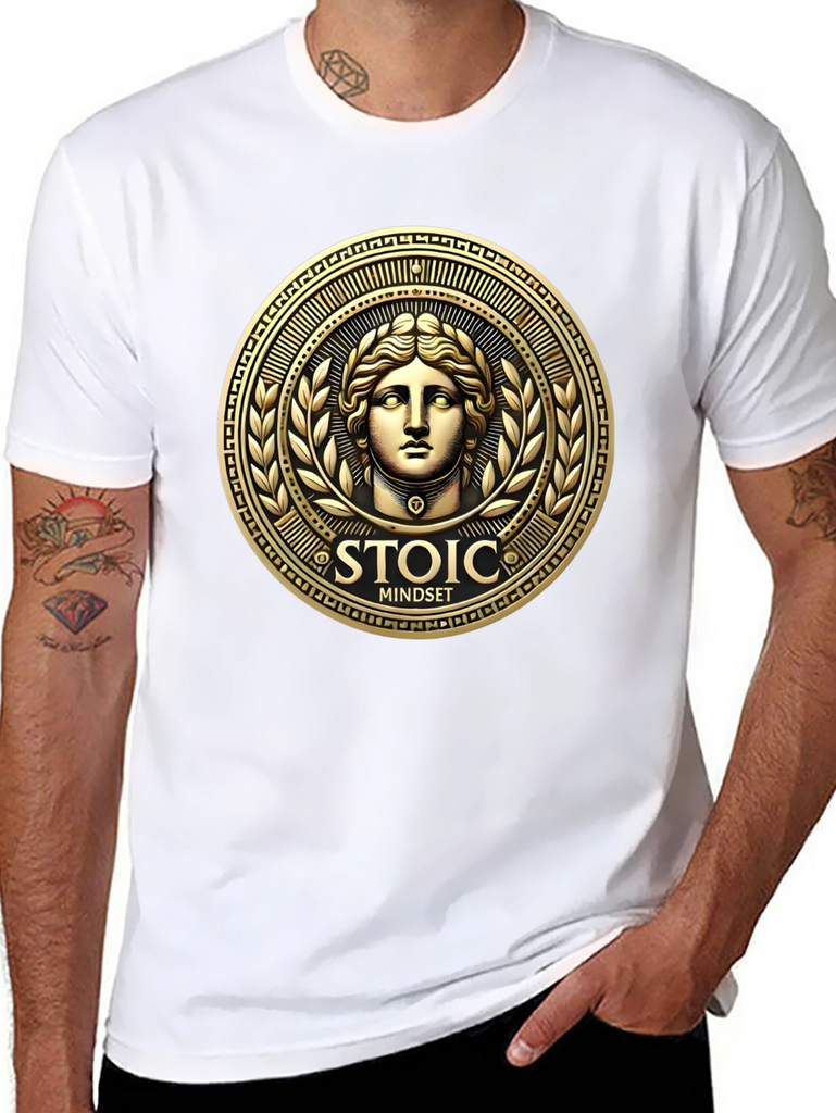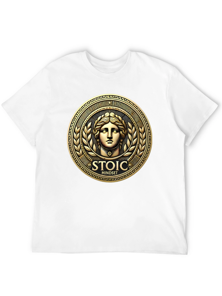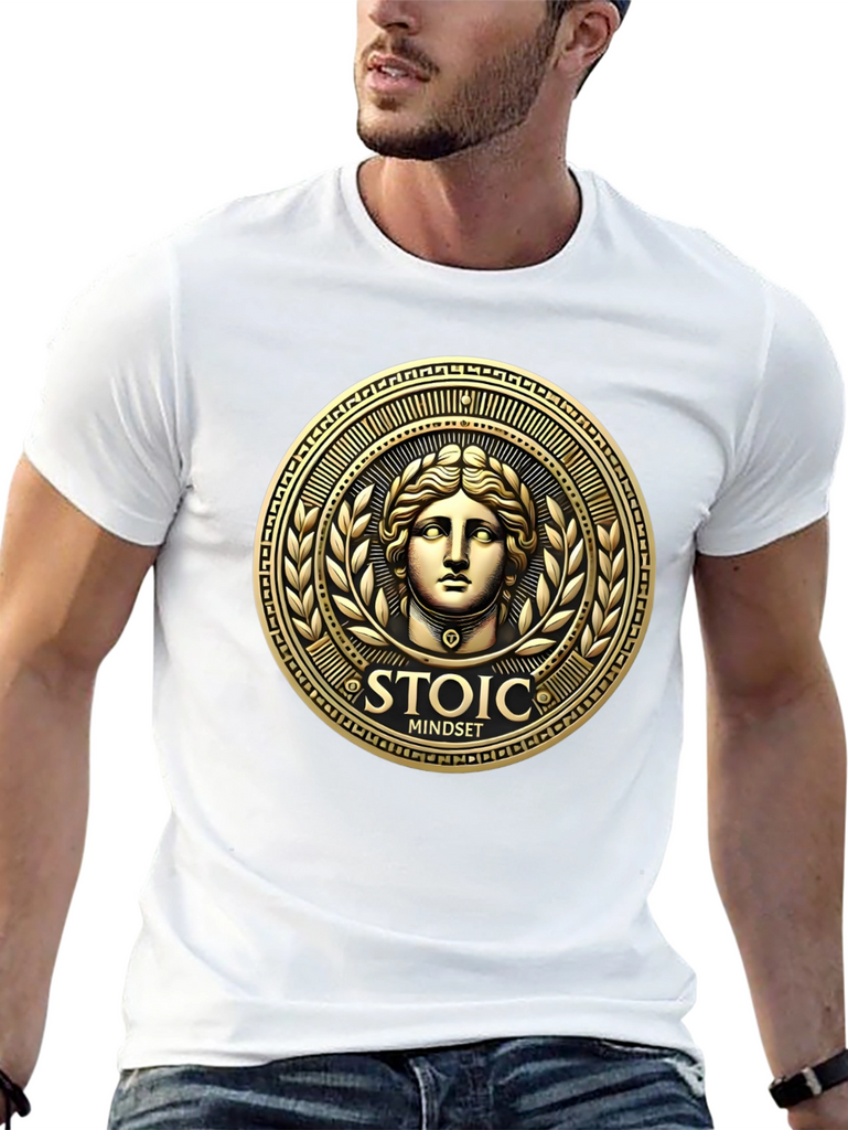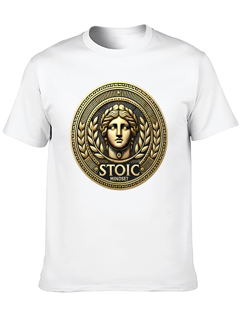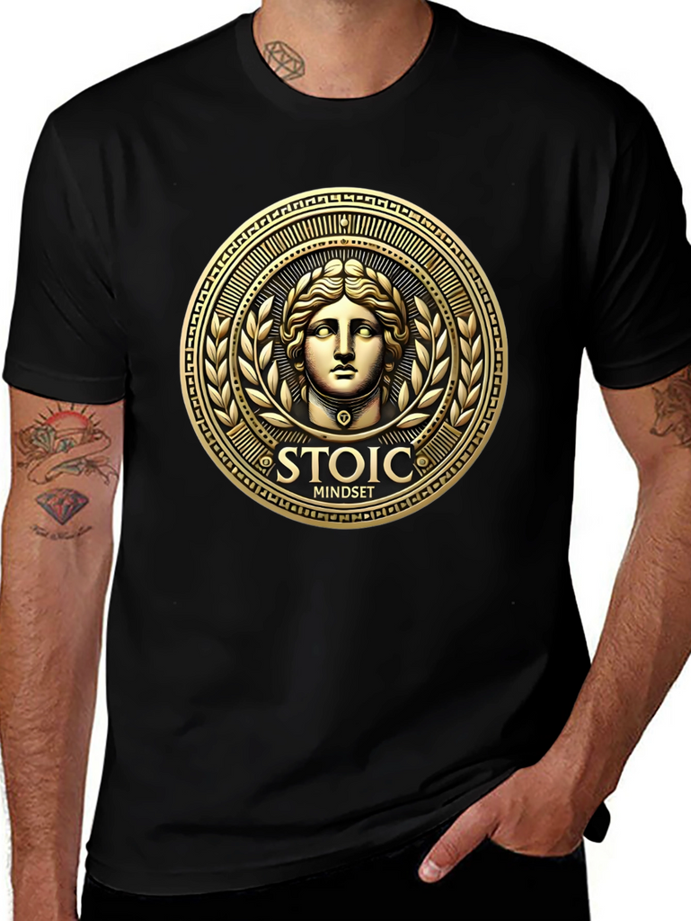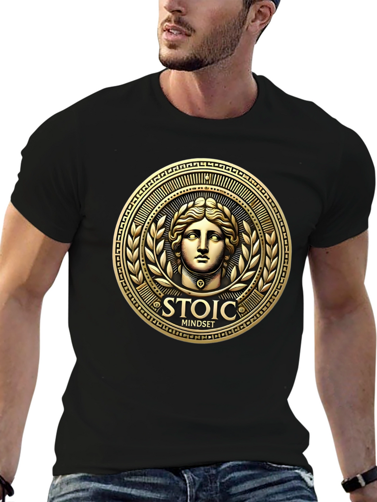 Embrace inner peace with this striking black t-shirt. Featuring a unique golden design of a classical figure surrounded by laurel wreaths and the words "STOIC MINDSET", this tee combines style and philosophical inspiration. Made from a comfortable fabric blend, this shirt is perfect for everyday wear, casual outings, or as a statement piece for those who appreciate wisdom and resilience. Show off your stoic side and start meaningful conversations with this eye-catching shirt. Ideal for gifting to philosophy enthusiasts, students, or anyone seeking a reminder of inner strength.