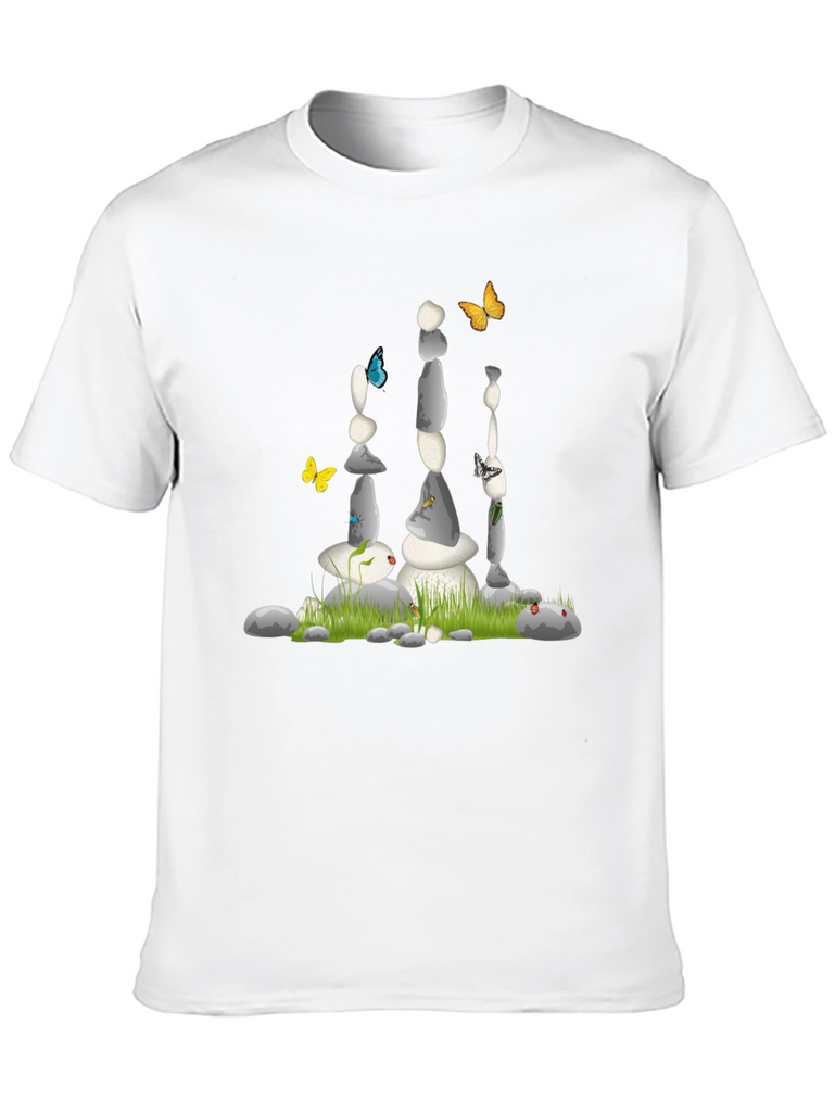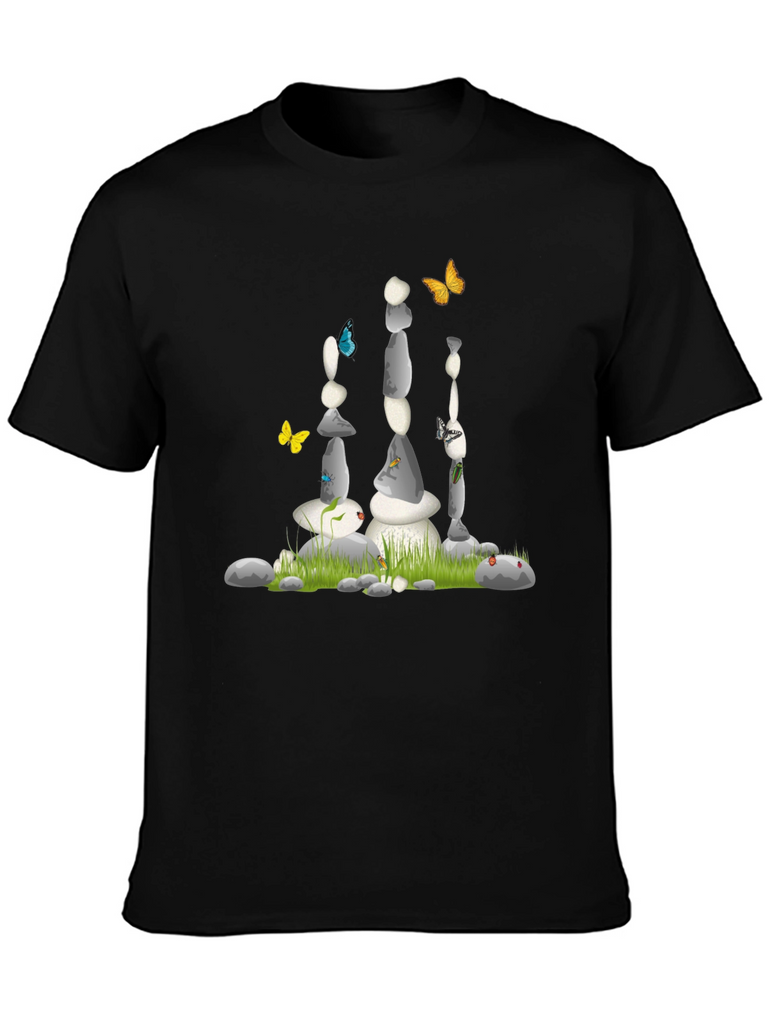 Embrace tranquility with this unique black t-shirt featuring a zen-inspired stone balancing art design. The graphic showcases meticulously stacked stones amidst lush green grass, complemented by delicate butterflies adding a touch of whimsy. Crafted from a soft, comfortable fabric, this tee is perfect for everyday wear, yoga sessions, or casual outings. Its captivating design sparks conversation and reflects a mindful, nature-loving lifestyle. A stylish and meaningful addition to your wardrobe, expressing peace and harmony.
