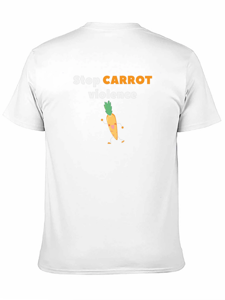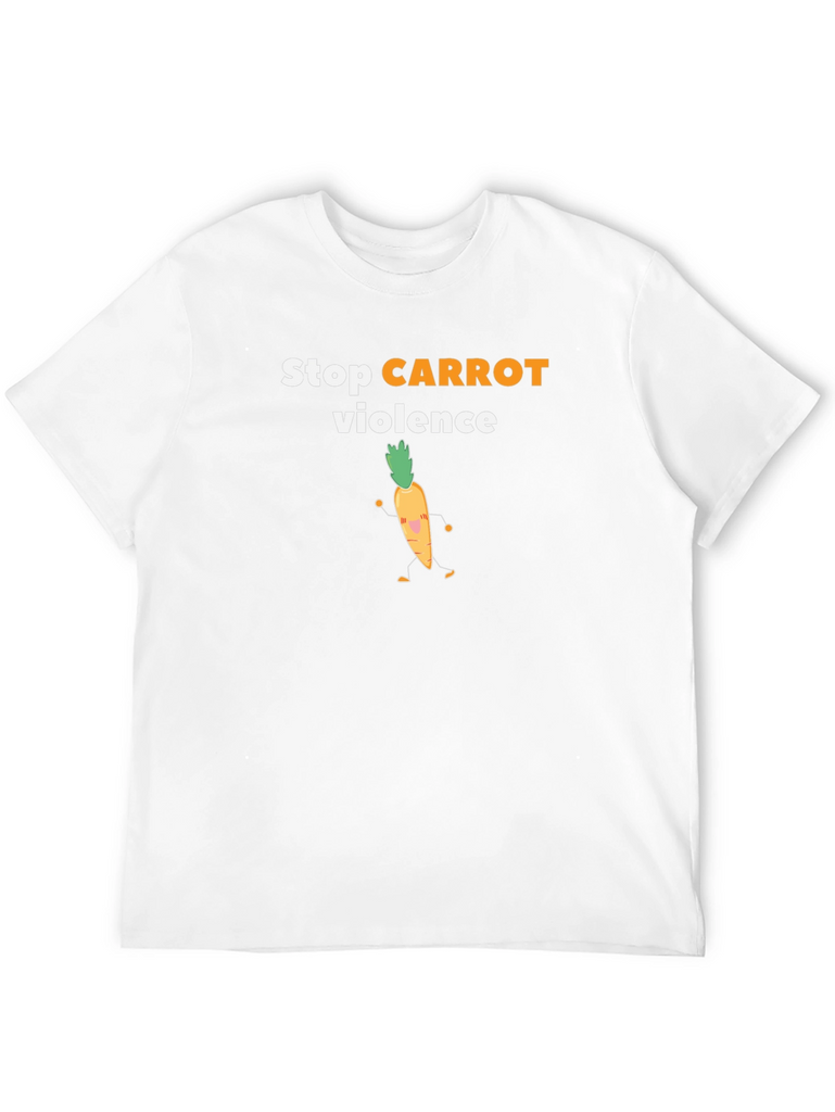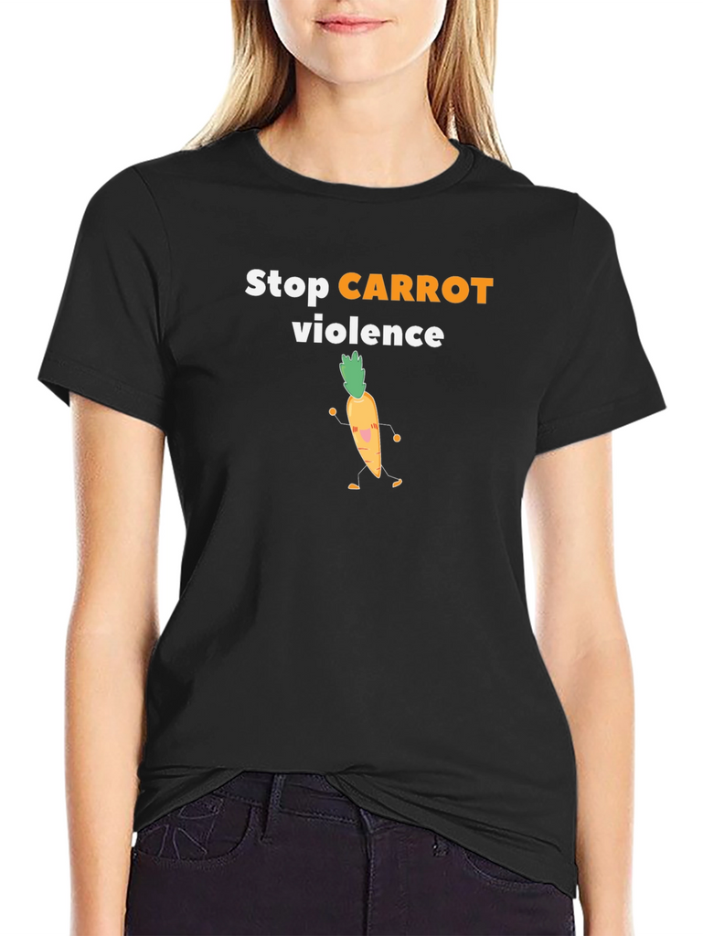 This eye-catching black t-shirt features a playful design promoting "Stop CARROT Violence." A cartoon carrot character adds a touch of humor. The shirt appears to be made from a soft, comfortable fabric, ideal for everyday wear. Its classic fit and short sleeves make it versatile for various casual occasions. Show your support for a quirky cause and make a statement with this unique graphic tee. Perfect for veggie lovers and those with a sense of humor. Style it with jeans or shorts for a fun, relaxed look.