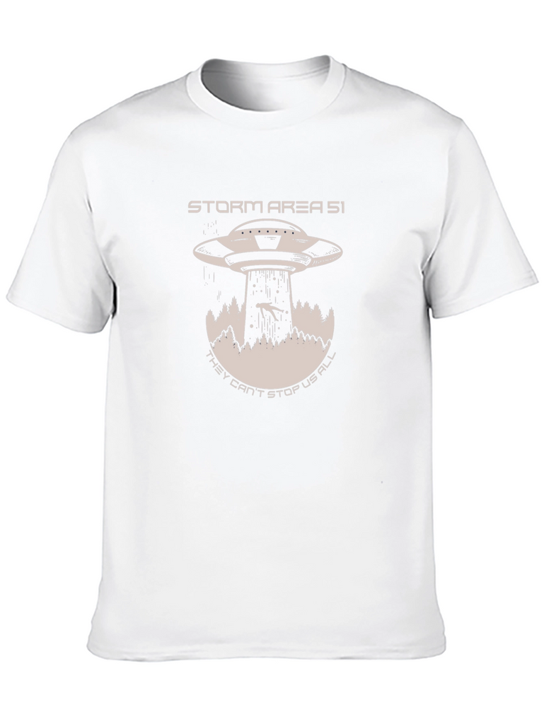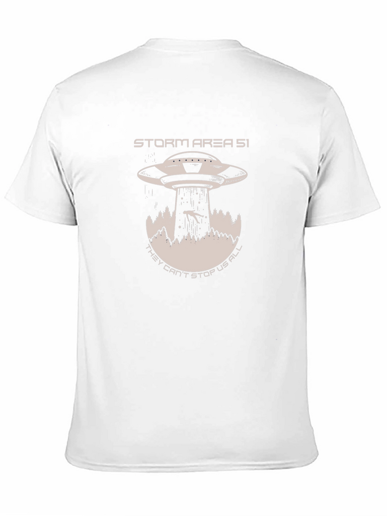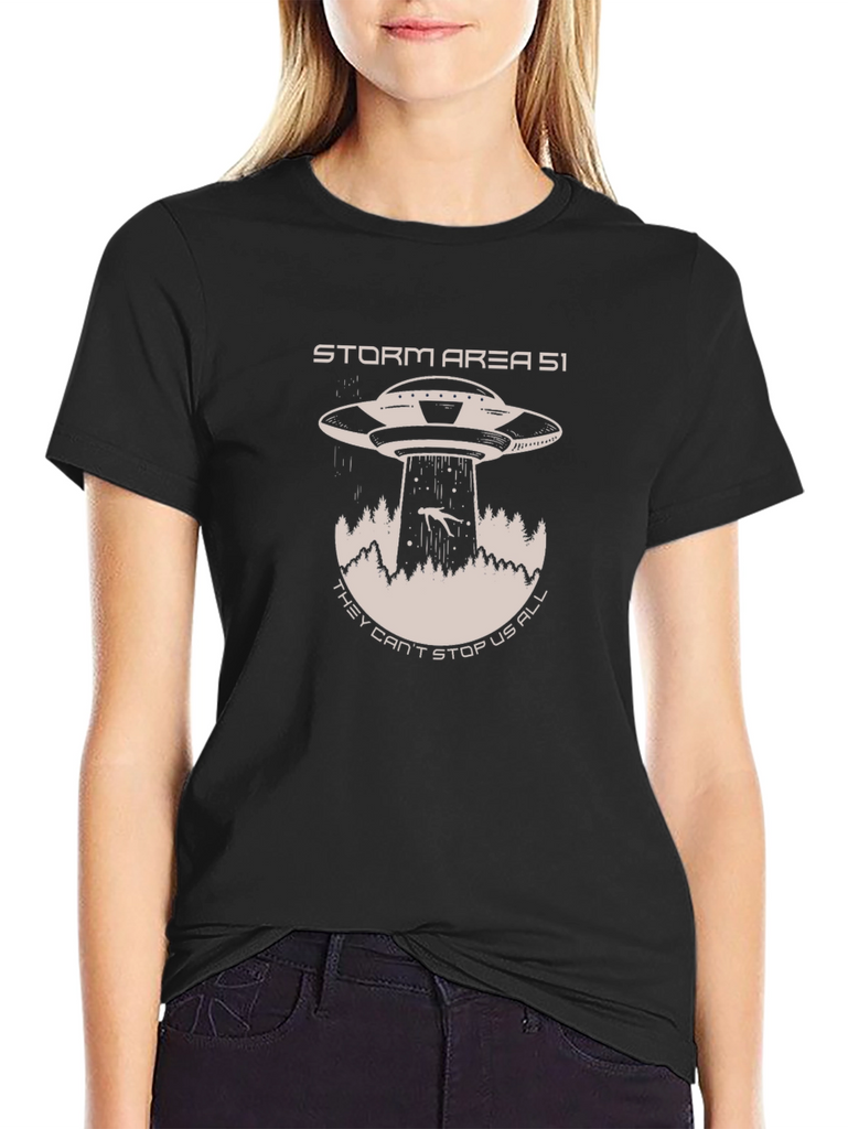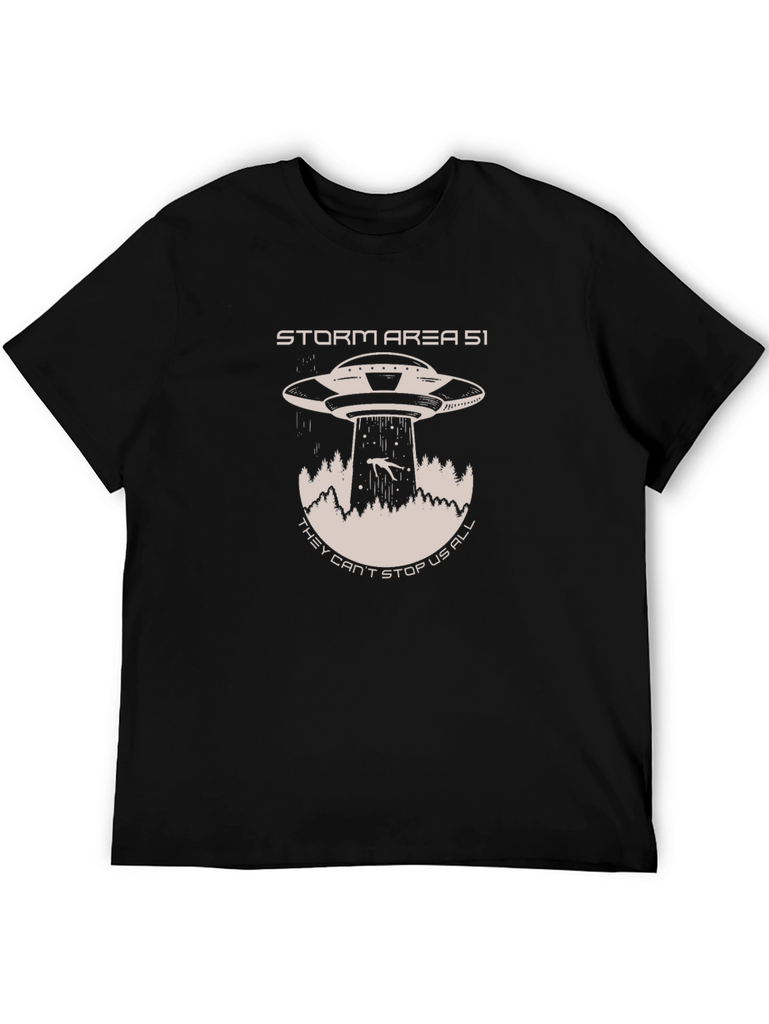 Embrace your inner conspiracy theorist with this bold black t-shirt. Featuring a striking graphic of a classic UFO abducting a person amidst a forest landscape, and the text "STORM AREA 51 THEY CAN'T STOP US ALL", this tee is perfect for sparking conversations and making a statement. Made from a comfortable-looking material, it's ideal for casual wear, sci-fi conventions, or simply expressing your unique sense of humor. Let your passion for the unknown shine with this eye-catching t-shirt!