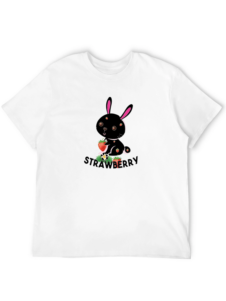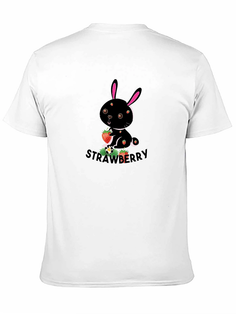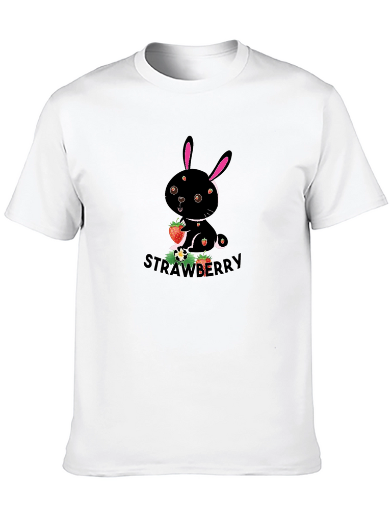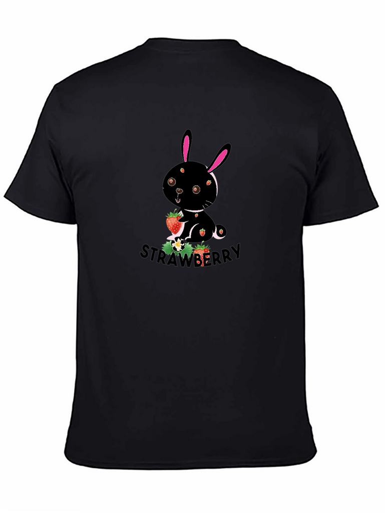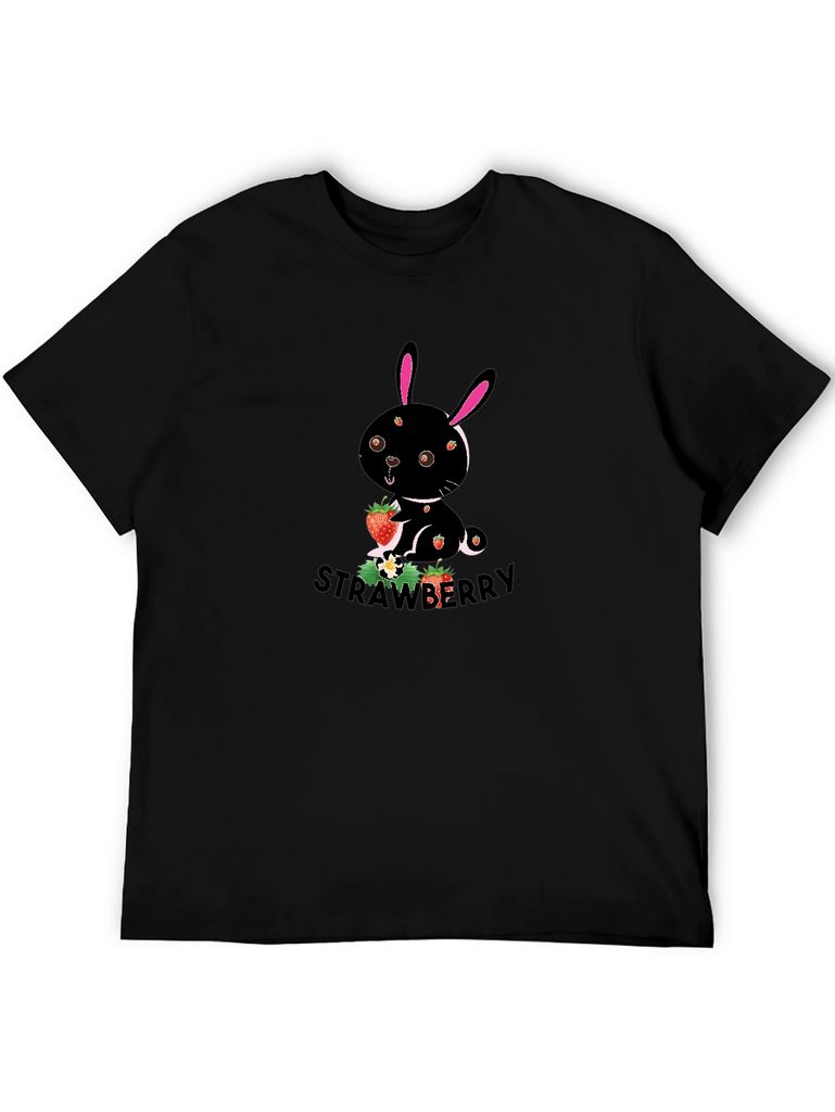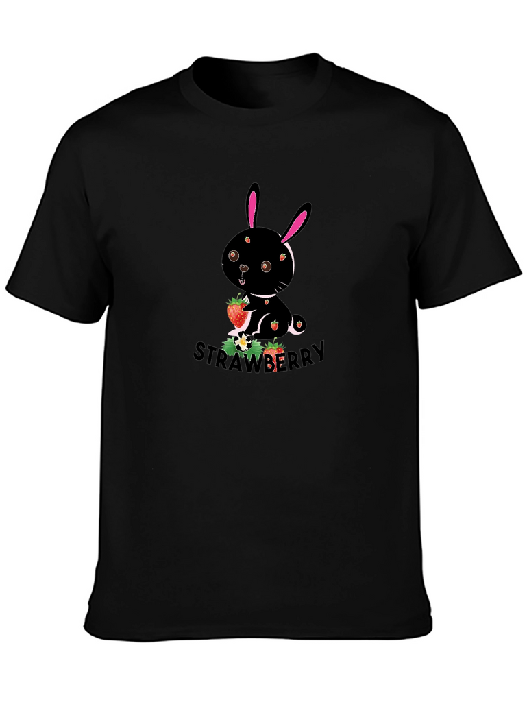 This unique black t-shirt features a cute black bunny graphic surrounded by strawberries. The bunny is adorned with strawberry-themed accents on its ears and body. Made from a soft and comfortable fabric, this tee is perfect for casual wear. The playful design adds a touch of whimsy to any outfit, making it a great conversation starter. Ideal for bunny and strawberry lovers, this shirt is a fun and stylish way to express your personality. Whether you're running errands or hanging out with friends, this graphic t-shirt is sure to turn heads. Get yours today and add a dash of sweetness to your wardrobe!