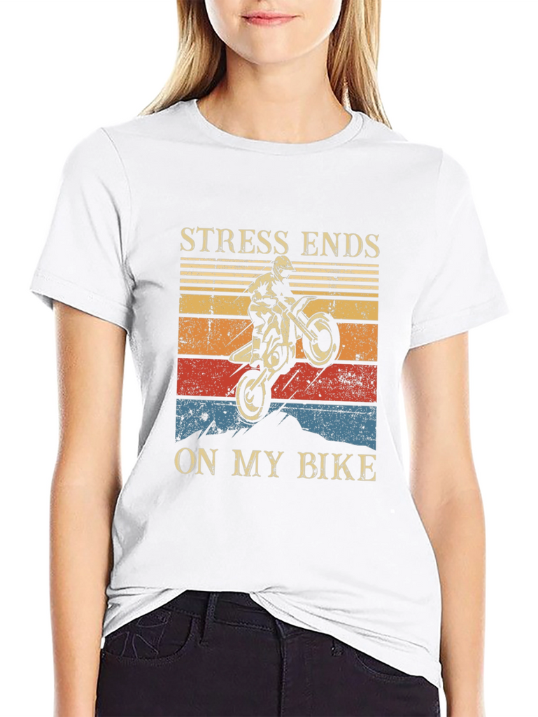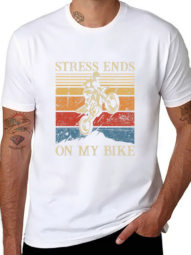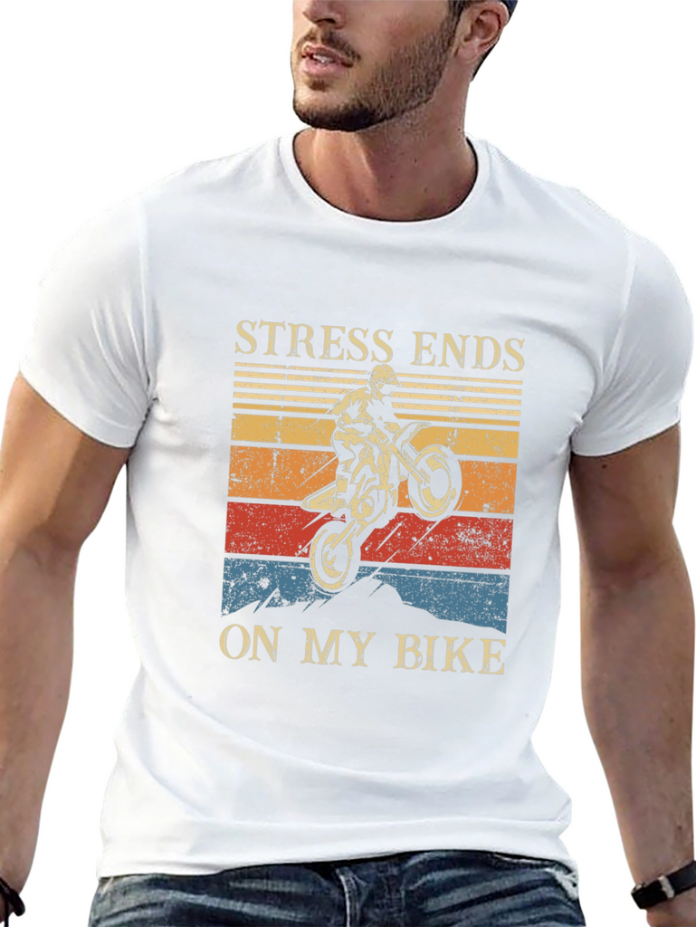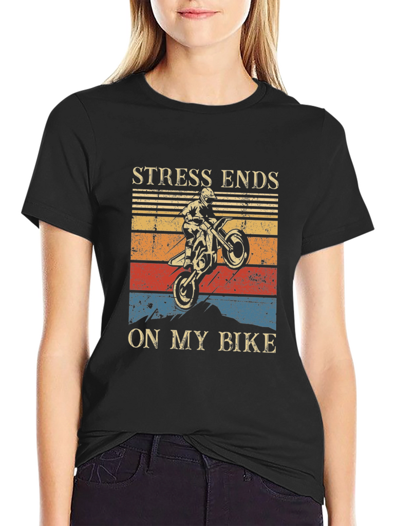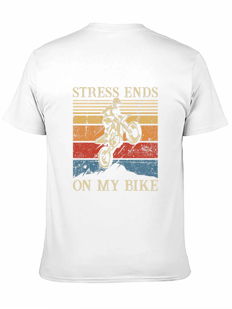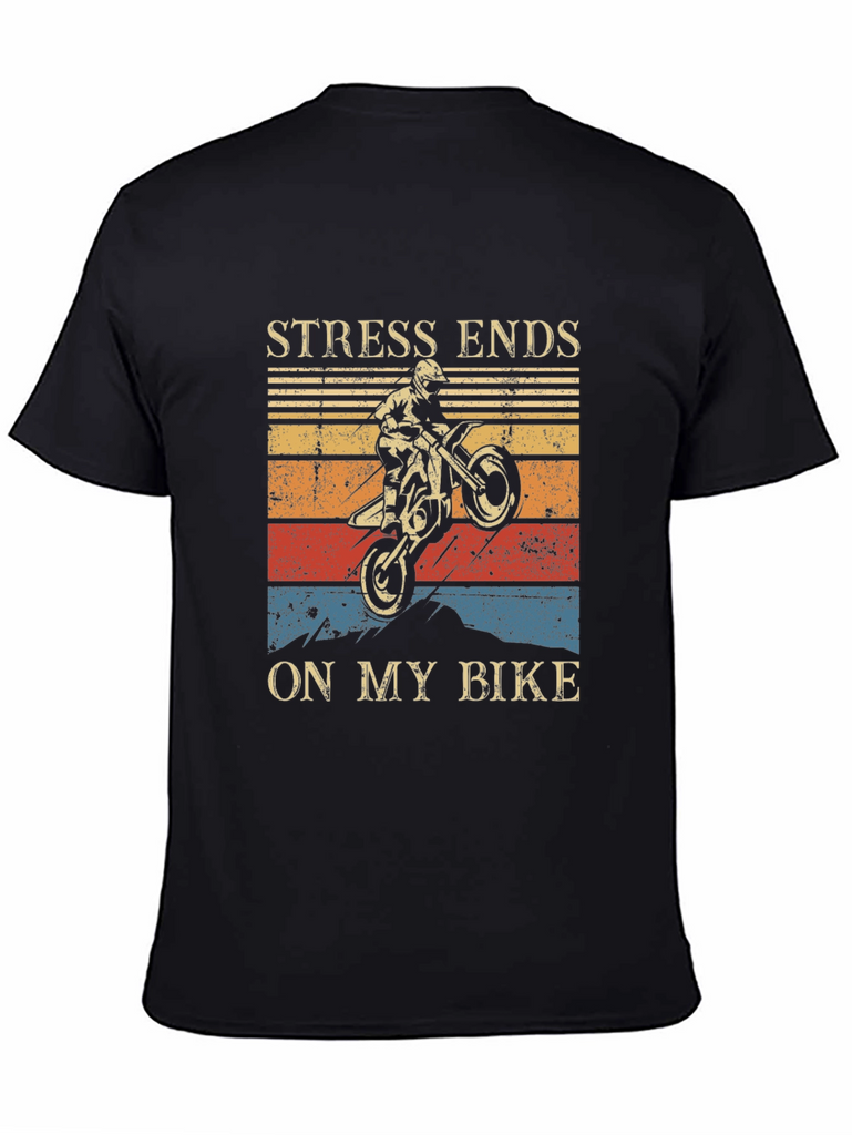 Show off your love for motocross with this bold graphic tee! Made from a soft, comfortable black fabric, this shirt features a striking design with a dirt bike rider performing a wheelie against a vintage-style sunset backdrop. The phrase "STRESS ENDS ON MY BIKE" is prominently displayed above and below the graphic. Perfect for casual wear, riding, or showing your passion for motorsports. Makes a great gift for motorcycle enthusiasts!