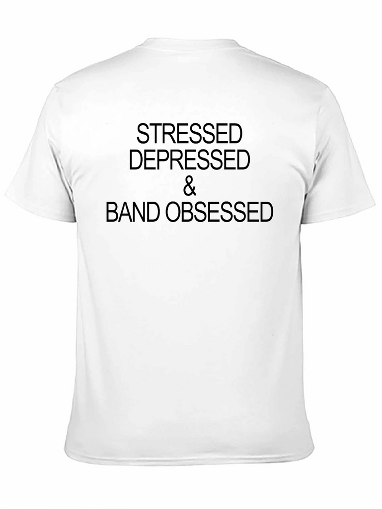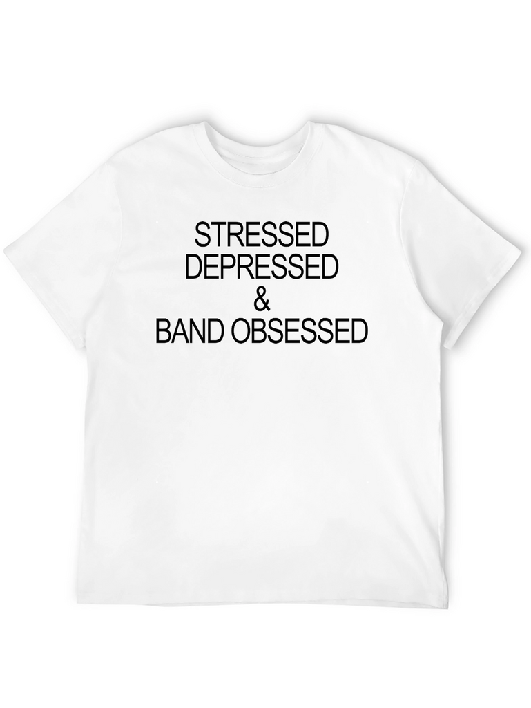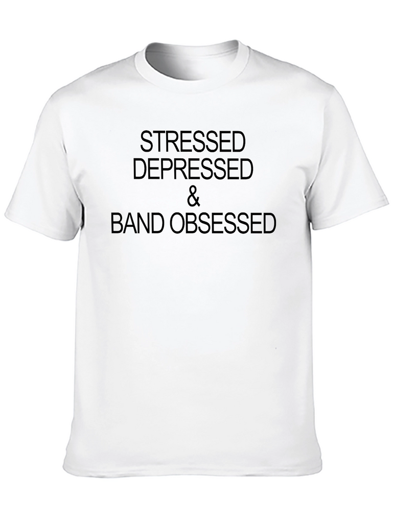 Show off your personality with this unique t-shirt! This black t-shirt features the words "Stressed Depressed & Band Obsessed" printed across the chest. Made from a comfortable, soft fabric, this shirt is perfect for casual wear, concerts, or expressing your mood. The classic fit and short sleeves make it a versatile addition to any wardrobe. Pair it with jeans, shorts, or a skirt for an effortlessly cool look. A must-have for music lovers and those who embrace their individuality. Express yourself with this one-of-a-kind tee!