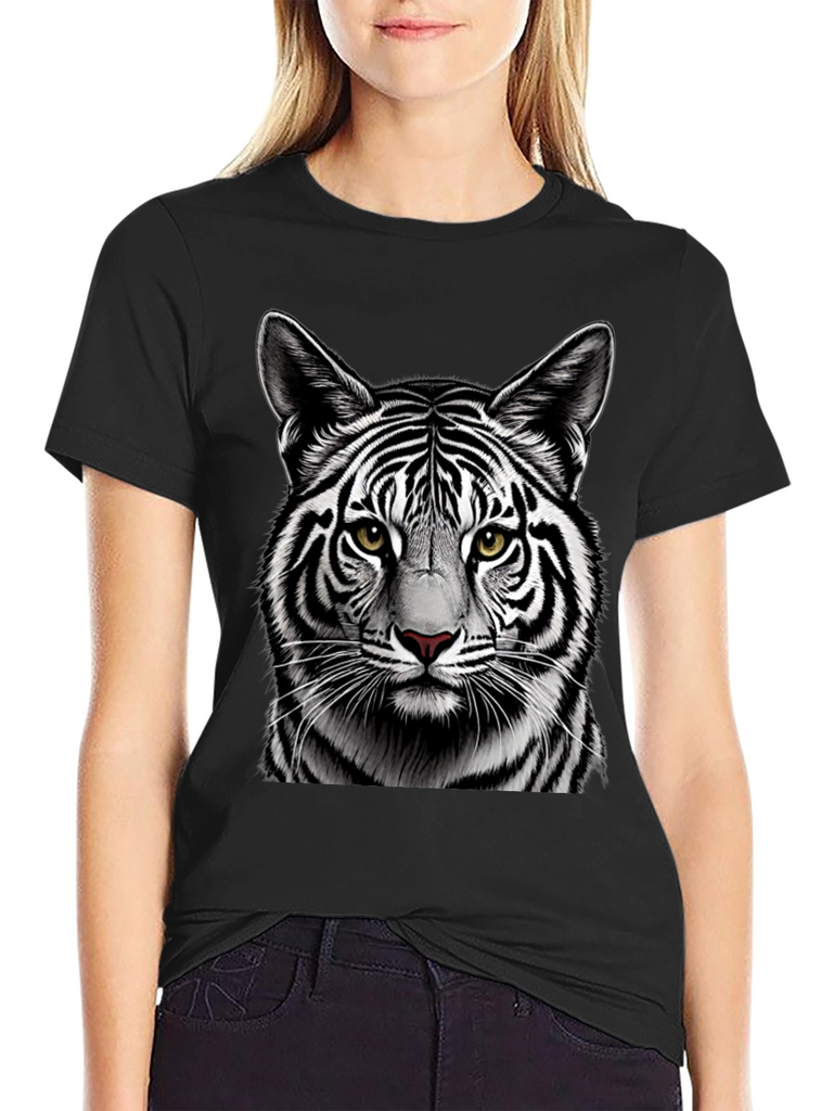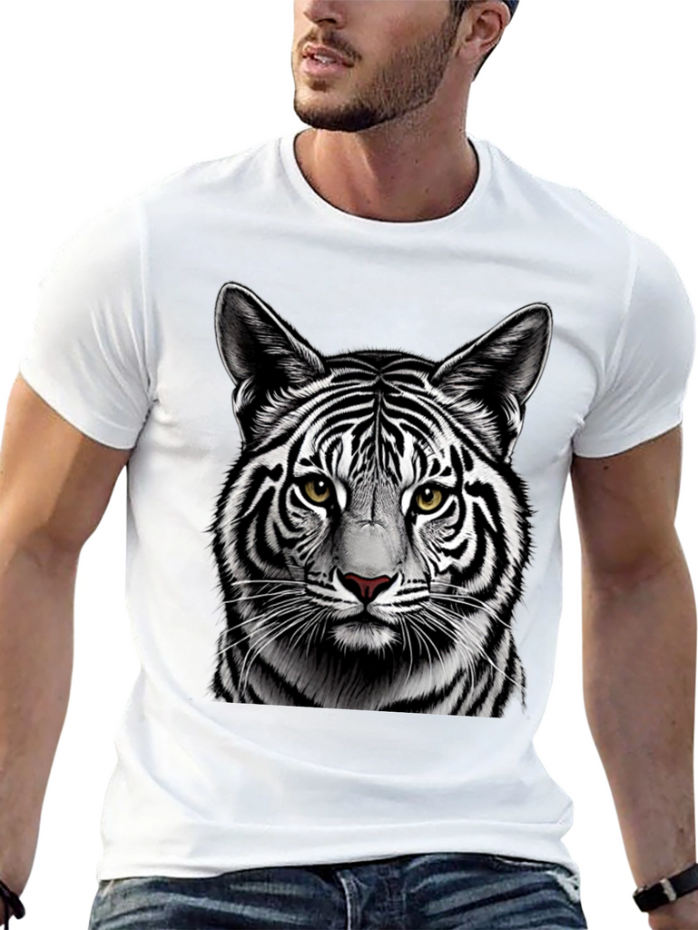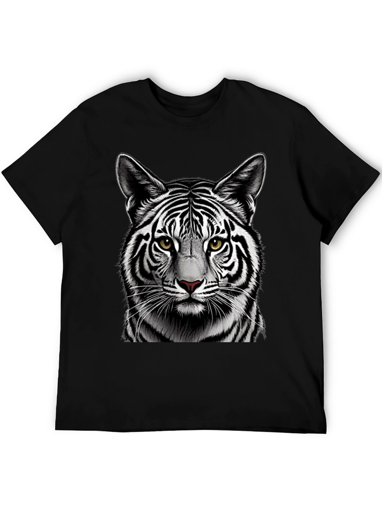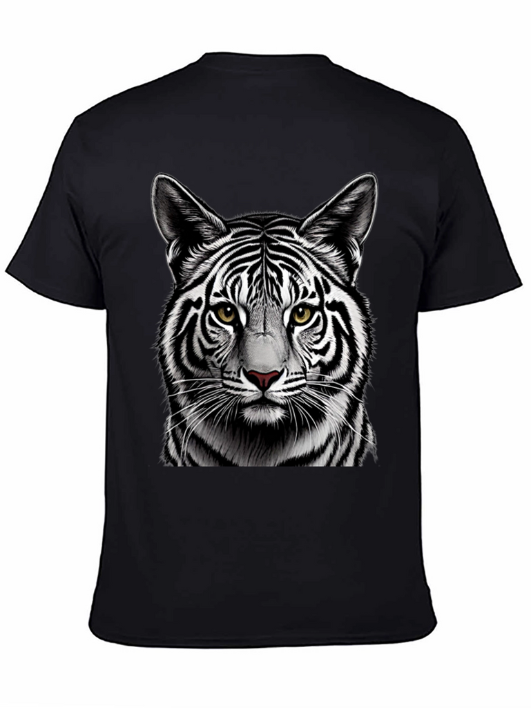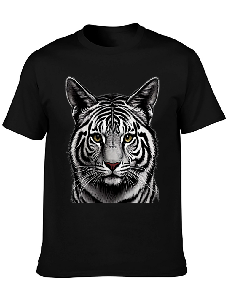 Make a bold statement with this eye-catching black t-shirt featuring a detailed graphic of a white tiger's face. The striking contrast of the black shirt and the tiger's black and white stripes creates a visually stunning design. Crafted from comfortable, breathable fabric, this tee is perfect for everyday wear. The high-quality print ensures the tiger's realistic features, including its piercing yellow eyes and intricate fur details, remain vibrant wash after wash. Ideal for animal lovers and those who appreciate unique graphic designs. Add a touch of wild style to your wardrobe with this must-have t-shirt.
