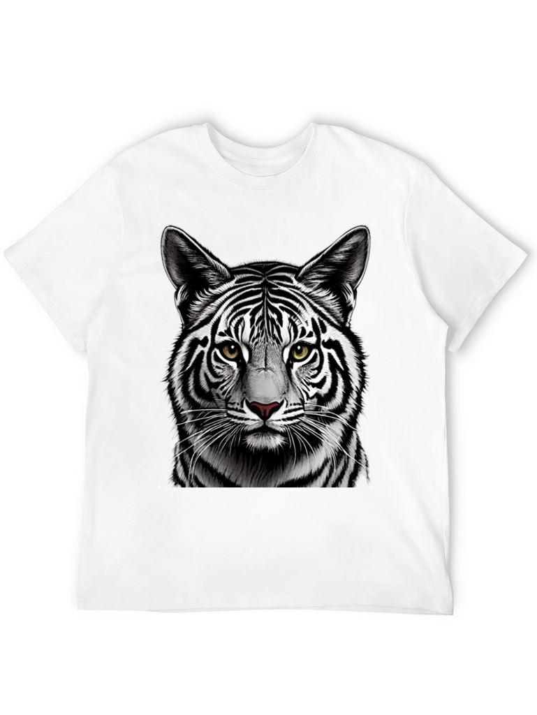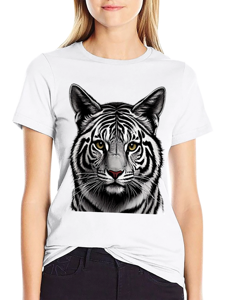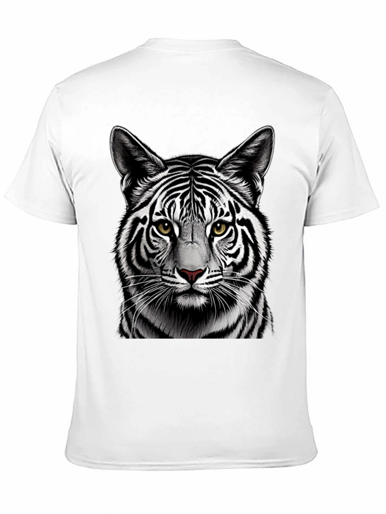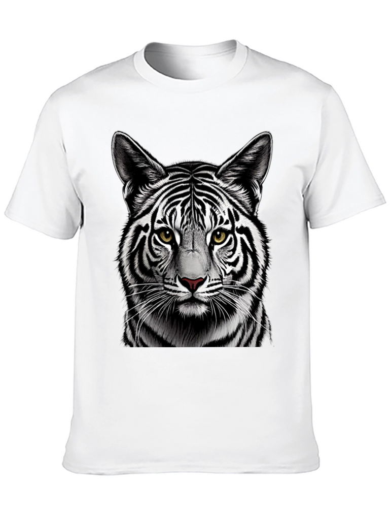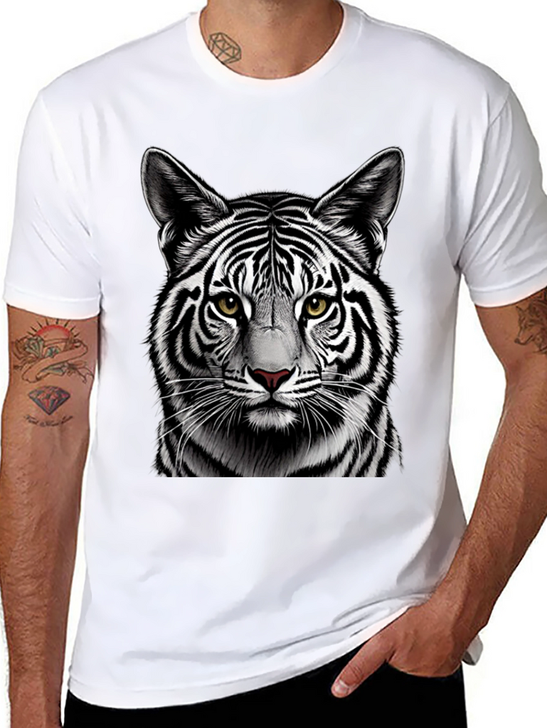 Make a bold statement with this eye-catching black t-shirt featuring a detailed graphic of a white tiger's face. The striking contrast of the black shirt and the tiger's black and white stripes creates a visually stunning design. Crafted from comfortable, breathable fabric, this tee is perfect for everyday wear. The high-quality print ensures the tiger's realistic features, including its piercing yellow eyes and intricate fur details, remain vibrant wash after wash. Ideal for animal lovers and those who appreciate unique graphic designs. Add a touch of wild style to your wardrobe with this must-have t-shirt.