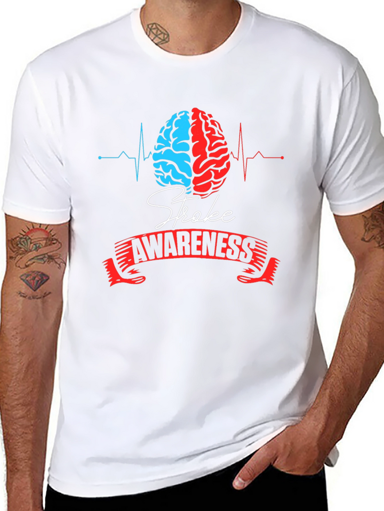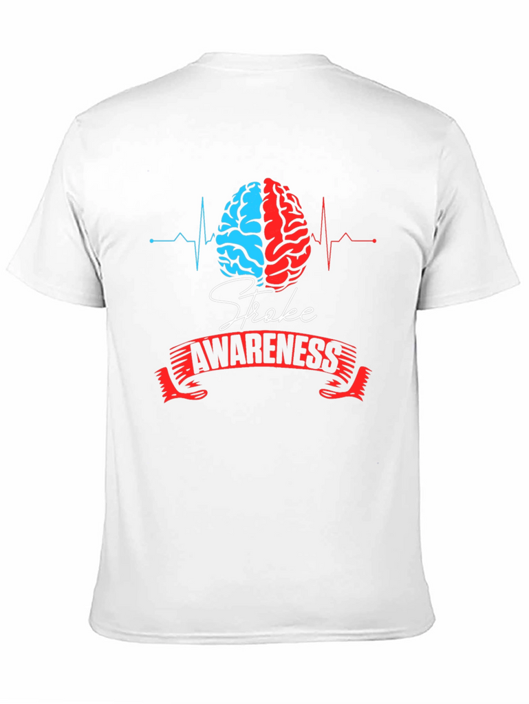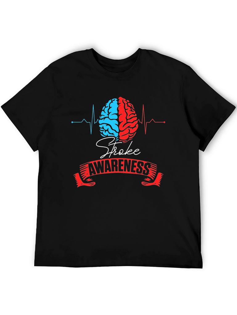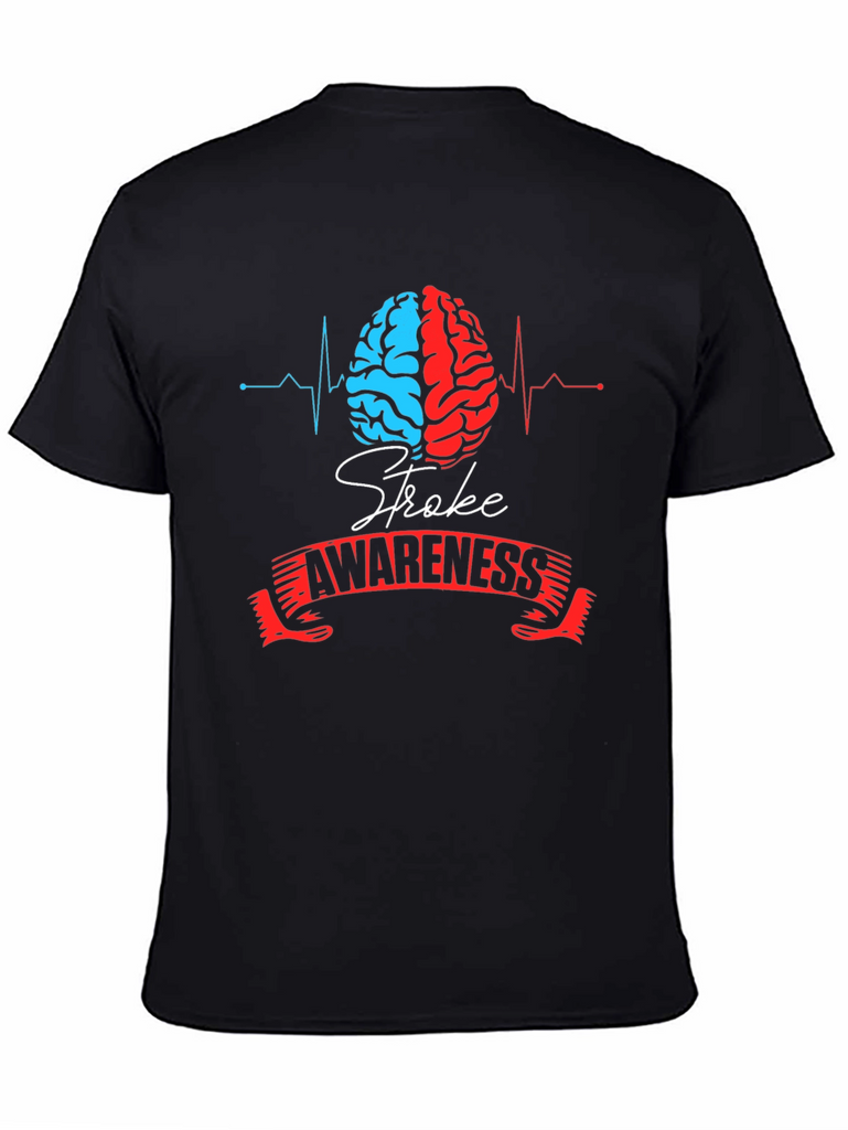 Show your support for stroke awareness with this impactful t-shirt. The design features a brain graphic split into red and blue halves, with a heartbeat line and the words "Stroke Awareness" on a red banner. Made from comfortable, breathable fabric, this black t-shirt is perfect for raising awareness and starting conversations. Wear it to support a loved one, participate in awareness walks, or simply spread the message in your daily life. The striking graphic and clear message make this a meaningful and stylish addition to your wardrobe.