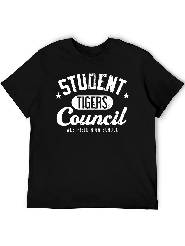 Show your school spirit with this classic black t-shirt. Featuring a prominent white graphic, this shirt displays "Student Tigers Council" and "Westfield High School." The bold text and star accents create a vintage-inspired design. Made from a comfortable, breathable fabric, this tee is perfect for students, alumni, or anyone who wants to represent their school. Wear it to games, spirit week, or everyday casual outings to proudly display your school pride. Get yours today and roar with the Tigers!