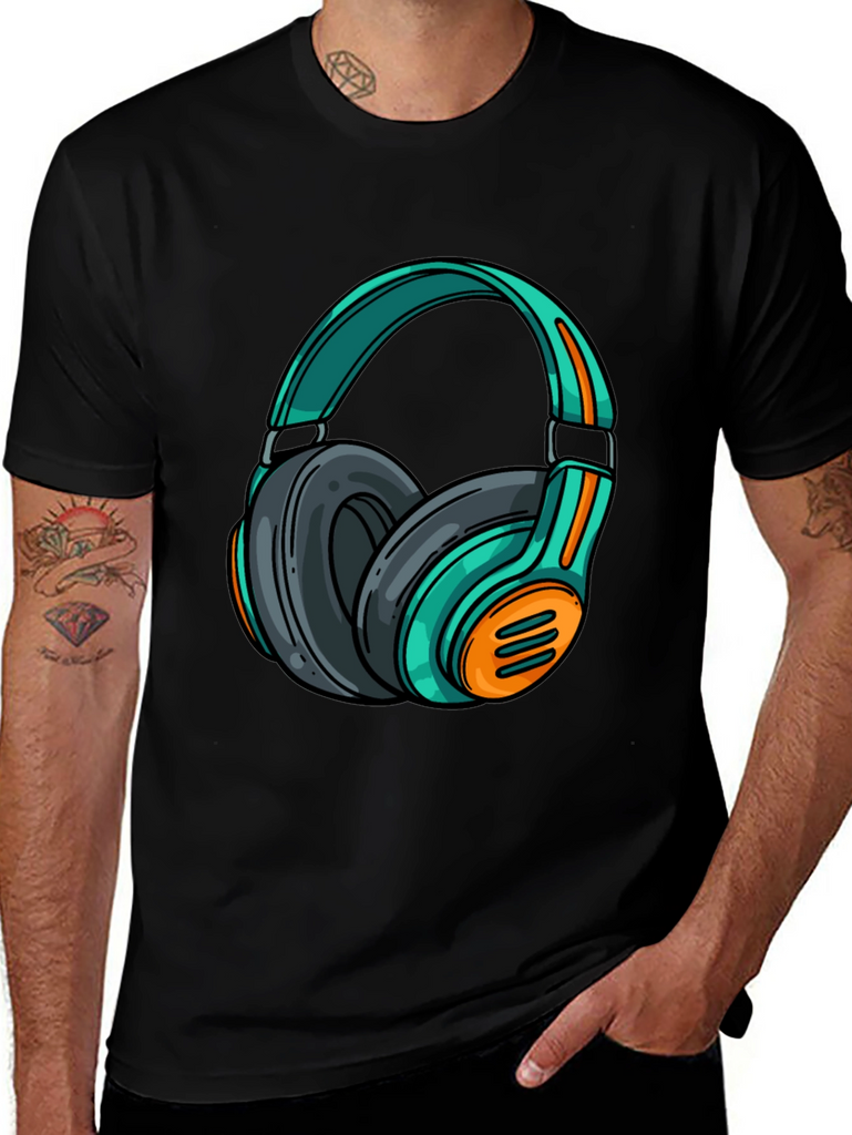 Rock your style with this trendy black t-shirt featuring a vibrant headphone graphic. The design boasts a teal and orange color scheme that pops against the dark background. Made from a comfortable fabric, this tee is perfect for casual wear, music lovers, or anyone who wants to make a statement. Pair it with jeans or shorts for an effortless, cool look. The bold graphic adds a touch of personality to your wardrobe and makes it a standout piece.