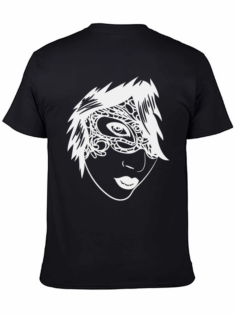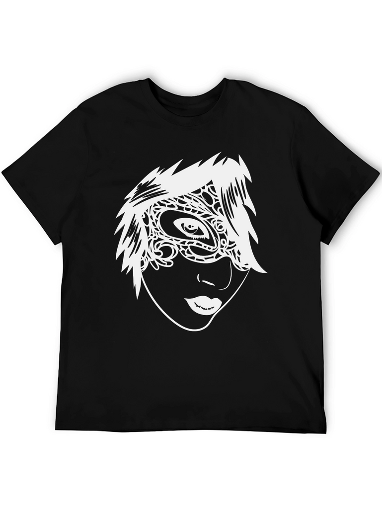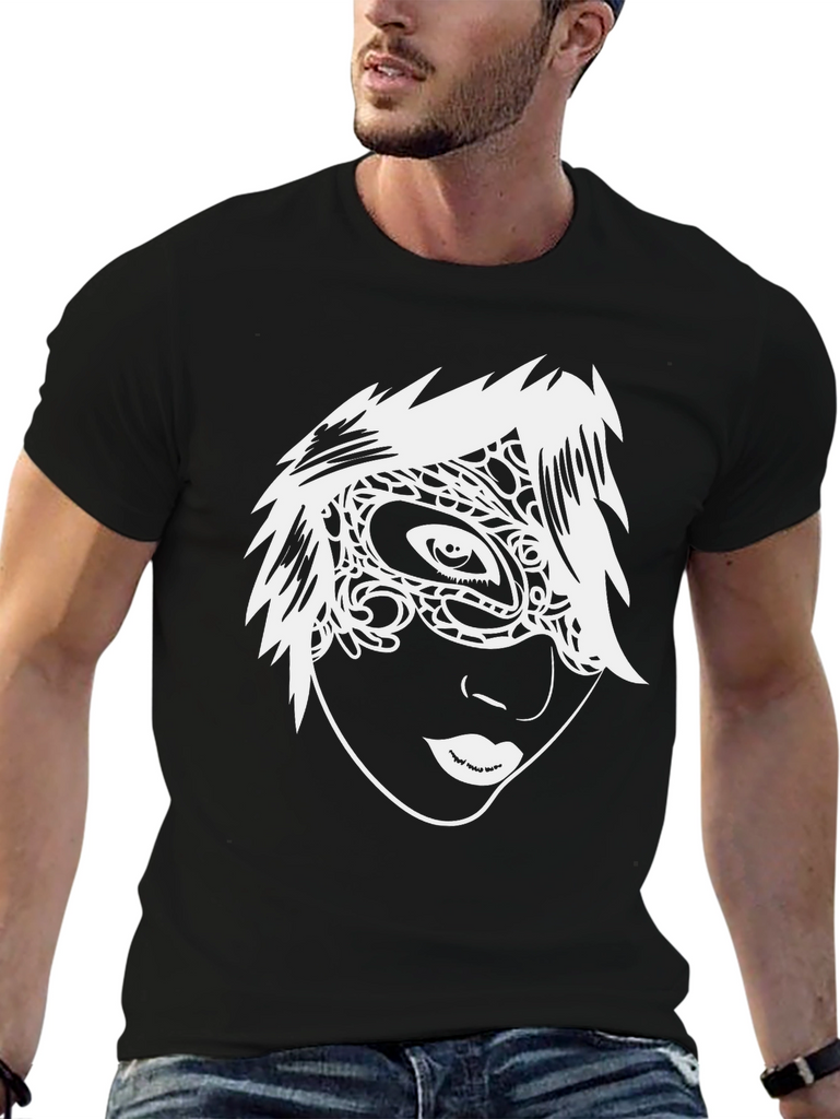 Elevate your casual wardrobe with this sleek black t-shirt. Featuring a striking white graphic design of a stylized mask with intricate details, this shirt is a statement piece. The clean lines of the design contrast beautifully against the dark fabric, creating a modern and eye-catching look. Perfect for everyday wear, concerts, or casual outings, this tee offers both comfort and style. Pair it with jeans, shorts, or layer it under a jacket for a versatile outfit. Made from comfortable materials, this shirt ensures you'll look and feel great all day long. Add a touch of artistry to your attire with this unique t-shirt.