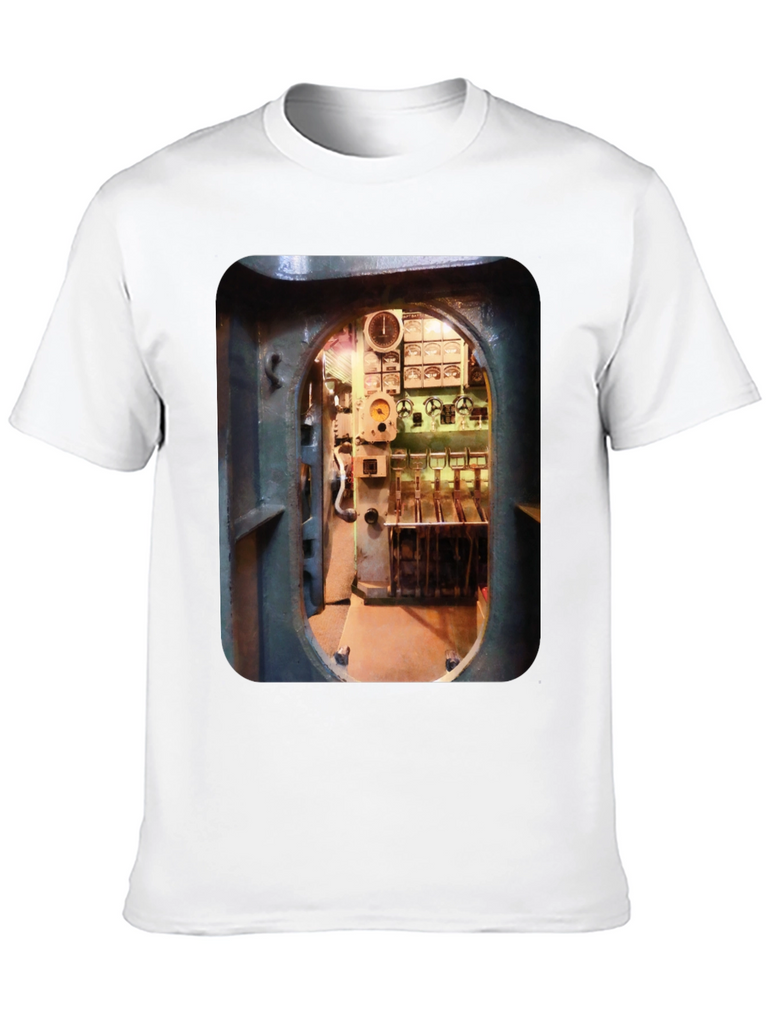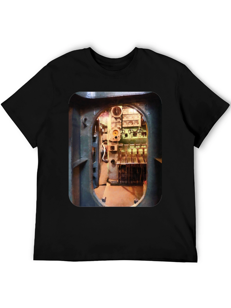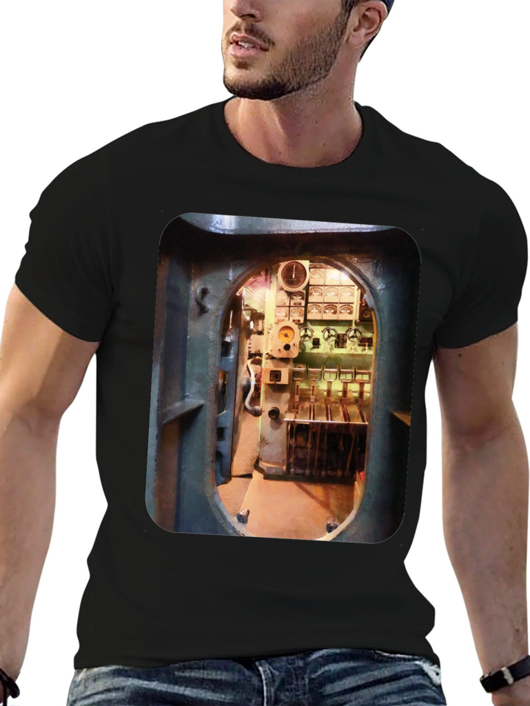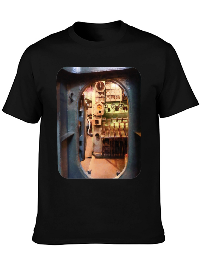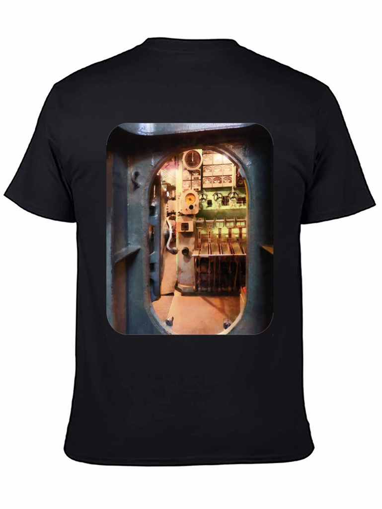 Dive into unique style with this black T-shirt featuring a captivating graphic print. The print showcases an interior view of a vintage submarine's control room, complete with gauges, valves, and intricate machinery, set behind a heavy submarine door. The design offers a glimpse into the nautical past. Made from soft, breathable fabric, this tee ensures comfort and durability. Perfect for history buffs, naval enthusiasts, or anyone seeking a standout casual look. Pair it with jeans or shorts for an effortlessly cool outfit. Show off your unique style with this eye-catching submarine graphic tee.