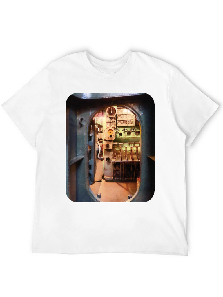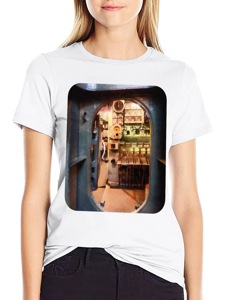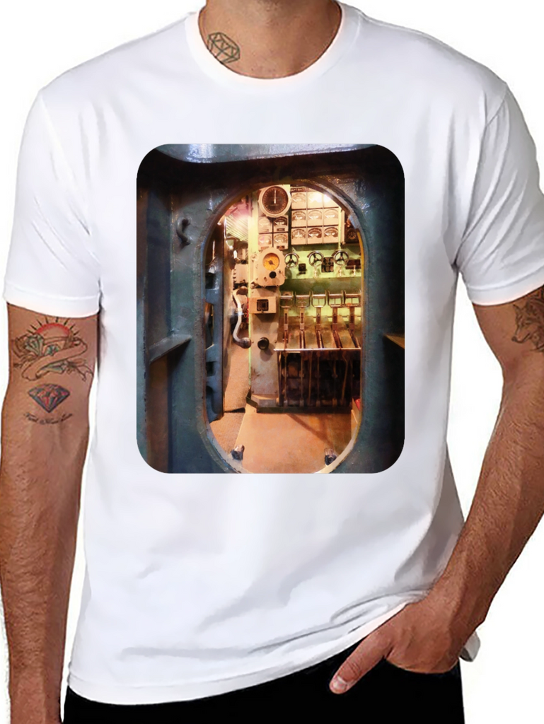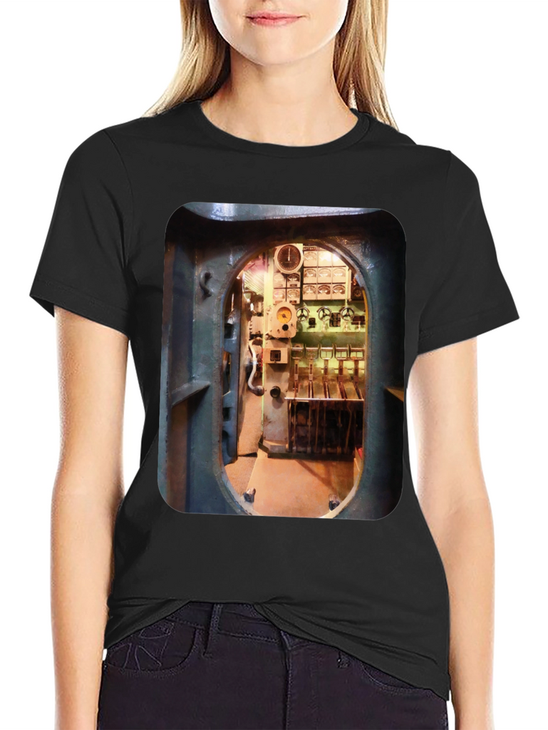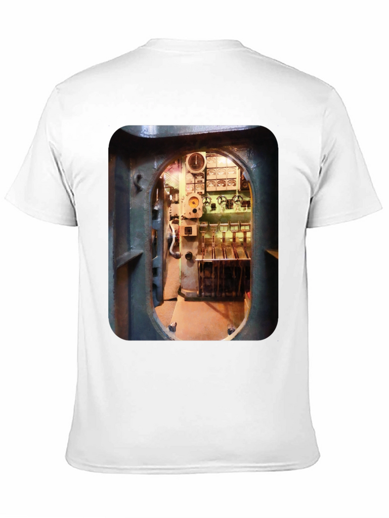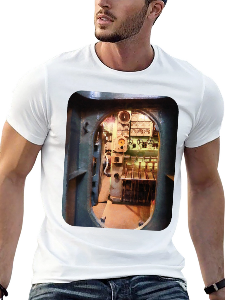 Dive into unique style with this black T-shirt featuring a captivating graphic print. The print showcases an interior view of a vintage submarine's control room, complete with gauges, valves, and intricate machinery, set behind a heavy submarine door. The design offers a glimpse into the nautical past. Made from soft, breathable fabric, this tee ensures comfort and durability. Perfect for history buffs, naval enthusiasts, or anyone seeking a standout casual look. Pair it with jeans or shorts for an effortlessly cool outfit. Show off your unique style with this eye-catching submarine graphic tee.