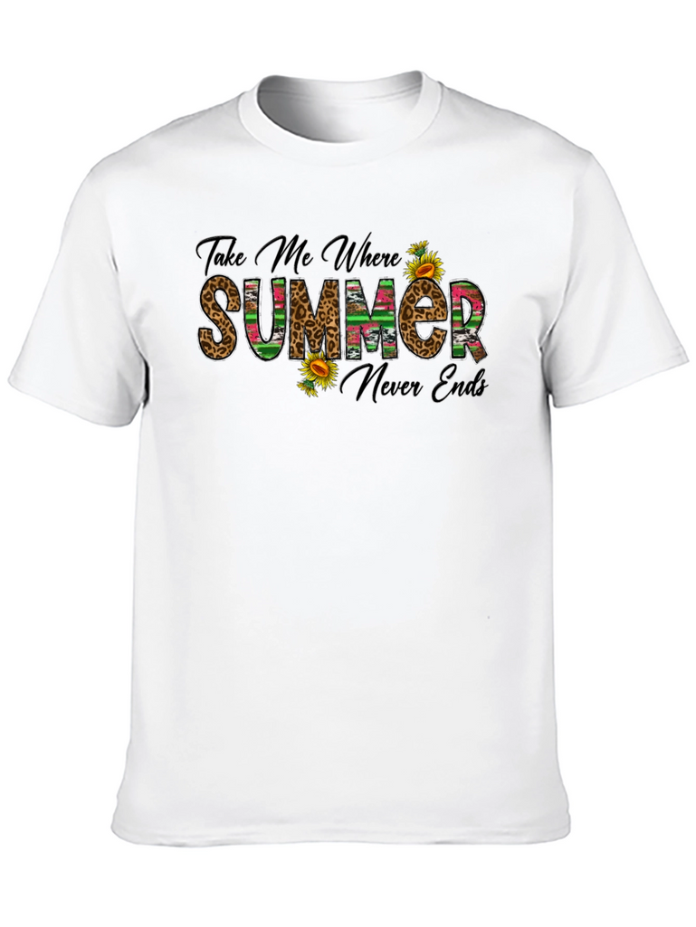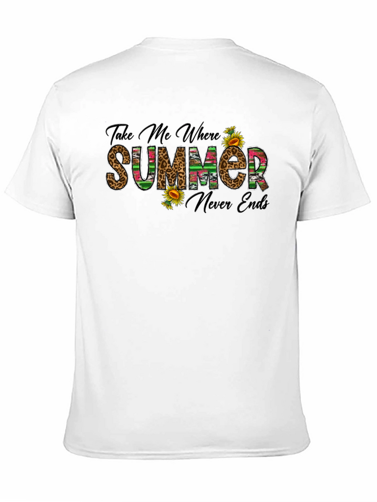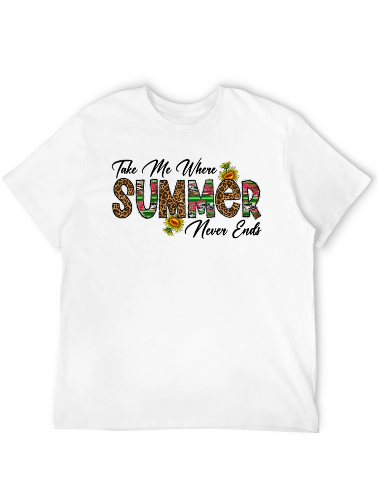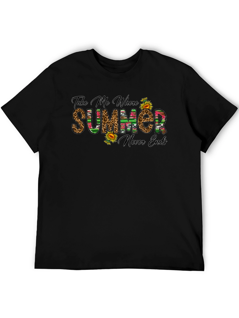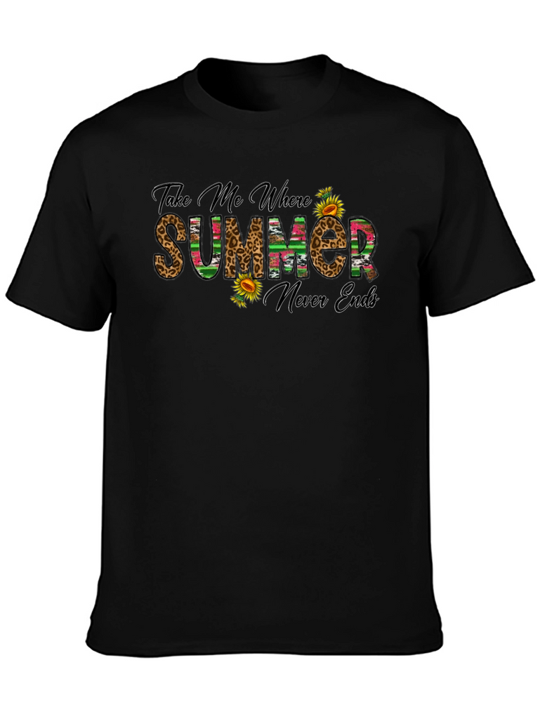 Embrace the sunshine with this stylish black graphic t-shirt. The design features the playful text "Take Me Where Summer Never Ends," rendered in a mix of leopard print and colorful striped patterns, accented with vibrant sunflowers. This tee is perfect for casual outings, vacation wear, or simply adding a touch of summer vibes to your everyday wardrobe. Made from comfortable materials, it offers a relaxed fit for all-day wear. Pair it with your favorite jeans, shorts, or skirt for a fun and effortless look.
