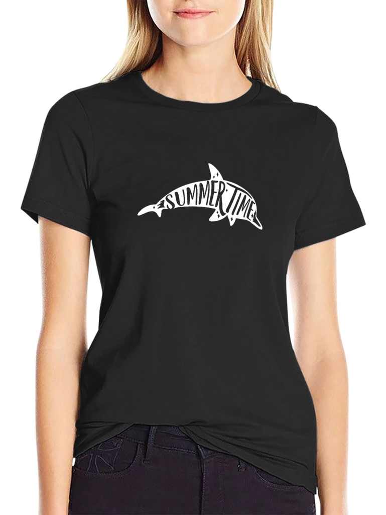 Dive into summer with this stylish black t-shirt featuring a unique dolphin graphic filled with the words "SUMMER TIME." Made from a comfortable-looking, soft fabric, this tee offers both style and comfort. The classic crew neck and short sleeves make it a versatile piece for casual wear. Perfect for beach outings, summer parties, or everyday wear, this t-shirt will surely make a splash. Show off your love for the ocean and the summer season with this eye-catching design! Great for men, the cut looks tailored and stylish.