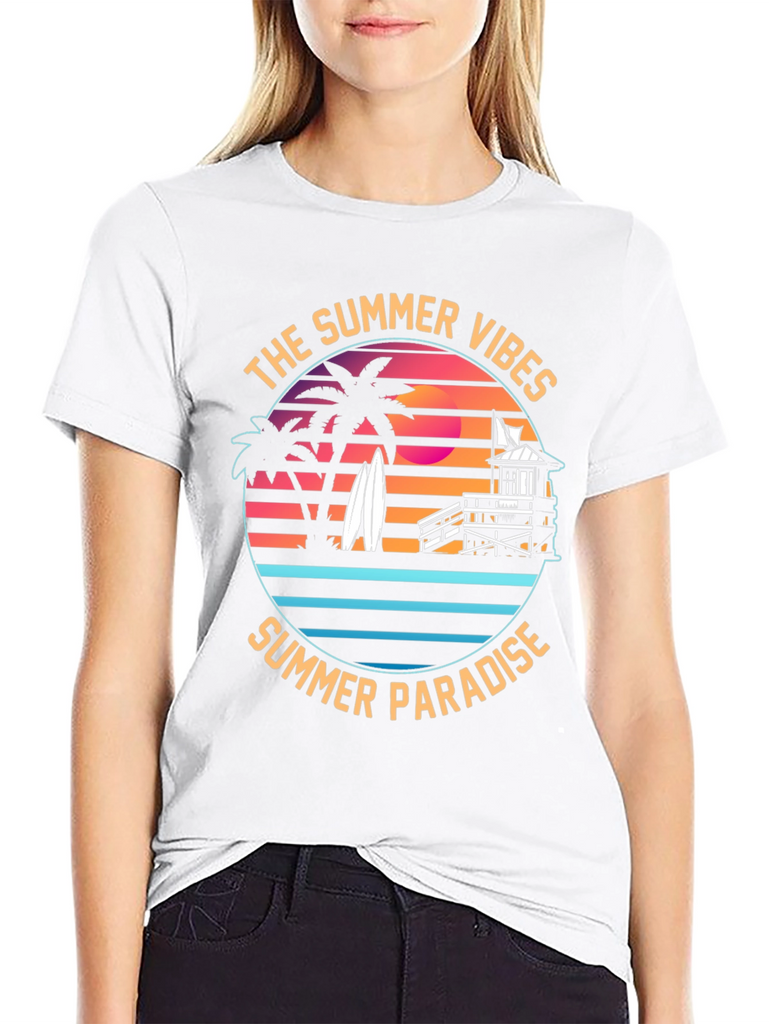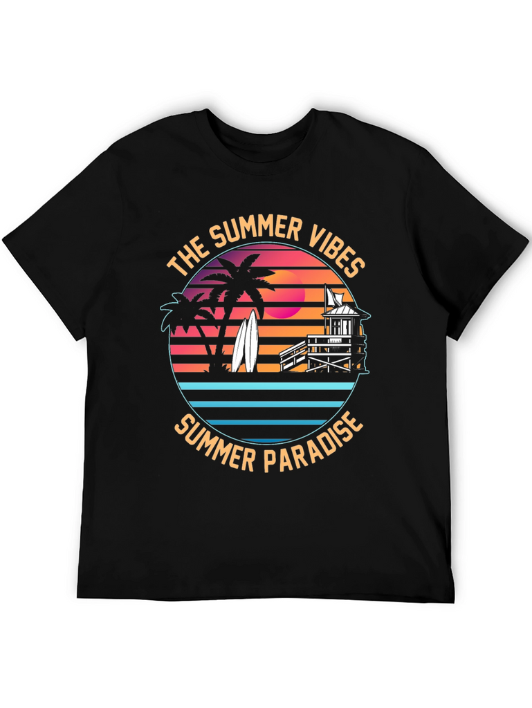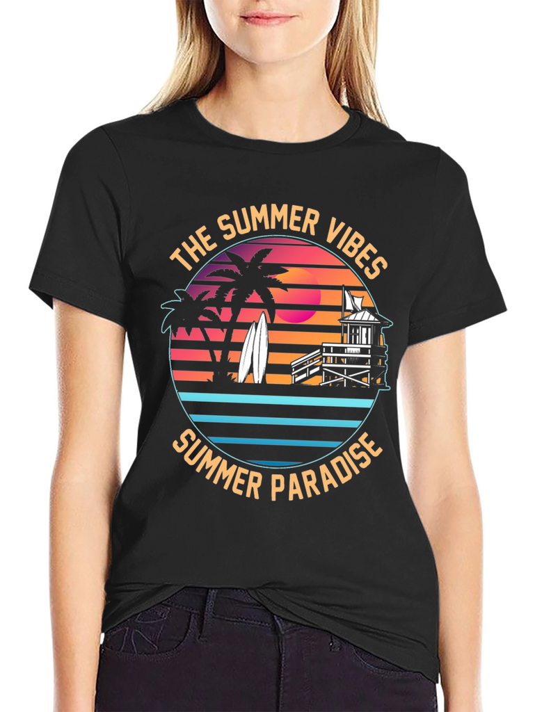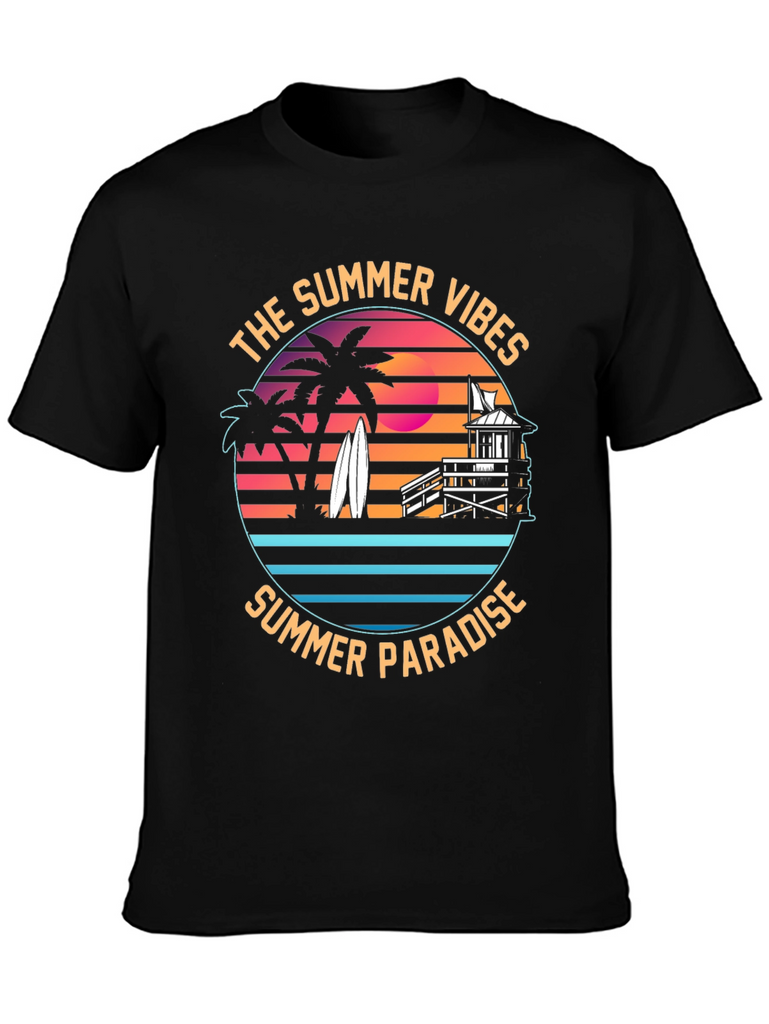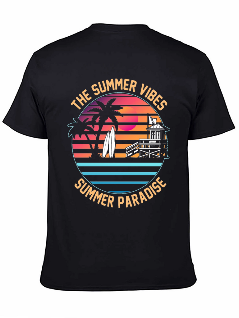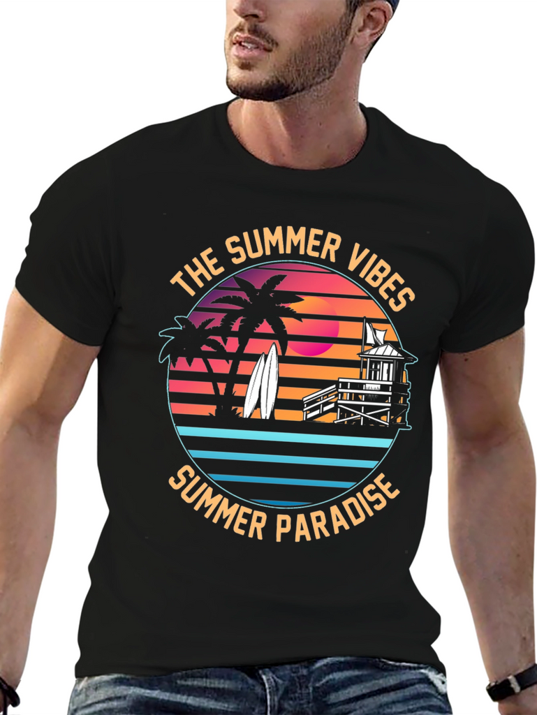 Embrace the summer vibes with this stylish black t-shirt featuring a vibrant graphic print. The design showcases a tropical summer paradise, complete with silhouetted palm trees, surfboards, a lifeguard tower, and a retro sunset backdrop. "The Summer Vibes" and "Summer Paradise" encircle the design, invoking a carefree beach spirit. Made from comfortable fabric, this tee is perfect for casual wear, beach outings, or summer parties. Show off your love for the sun, sand, and surf with this eye-catching and unique t-shirt. Makes a great gift for beach lovers!