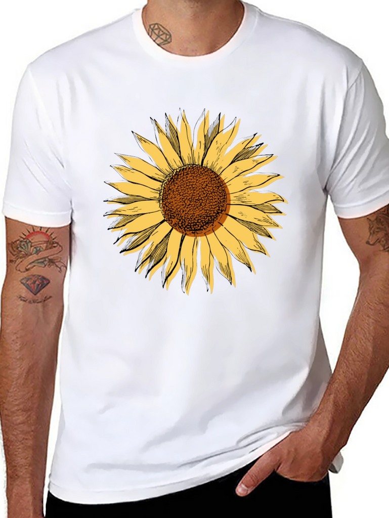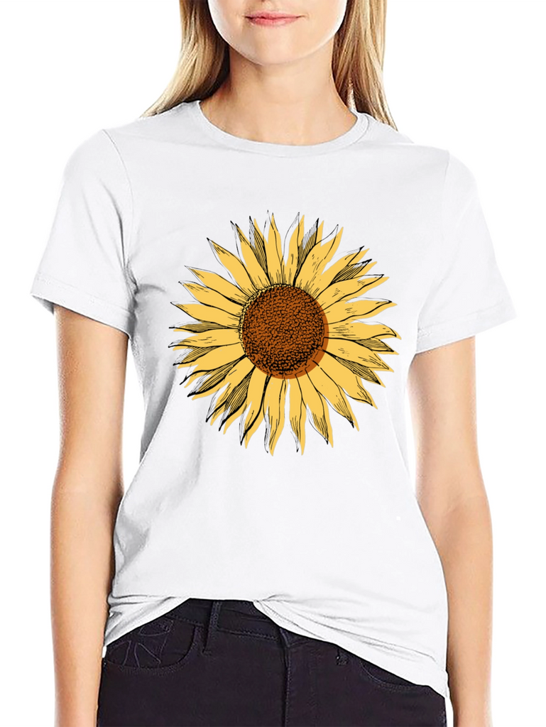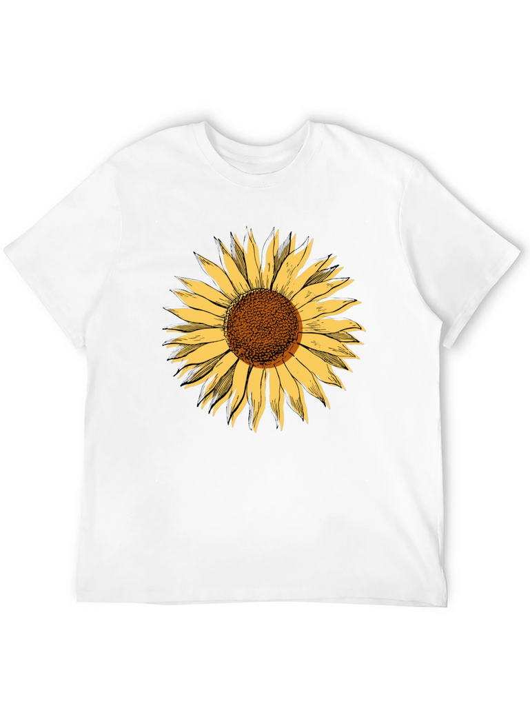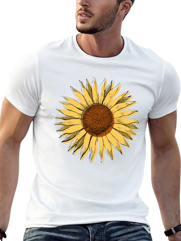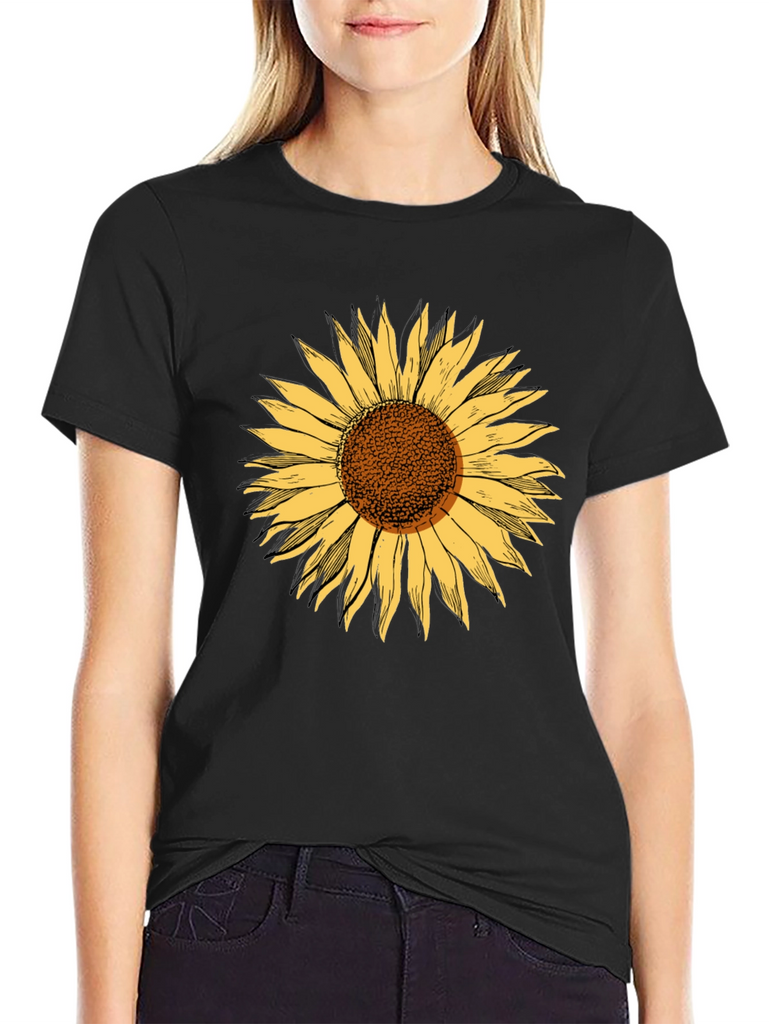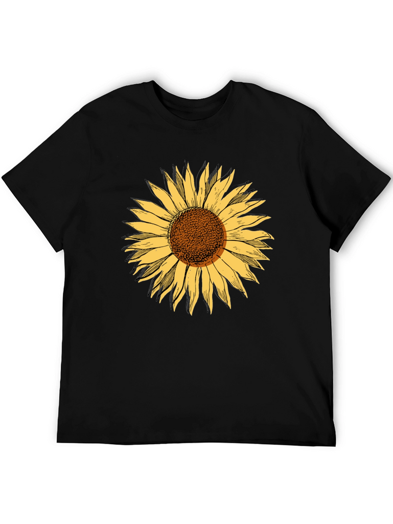 Elevate your casual wardrobe with this eye-catching black T-shirt featuring a vibrant sunflower graphic. The detailed design showcases the sunflower's petals and central disk in shades of yellow and brown, creating a bold and stylish statement. Made from what appears to be a soft, comfortable cotton fabric, this tee offers breathability and all-day wearability. Perfect for everyday wear, this T-shirt can be paired with jeans, shorts, or layered under a jacket for a cool and casual look. Whether you're heading to a summer festival, running errands, or simply relaxing at home, this sunflower tee is sure to add a touch of sunshine to your outfit. Its classic fit makes it a versatile addition to any wardrobe.