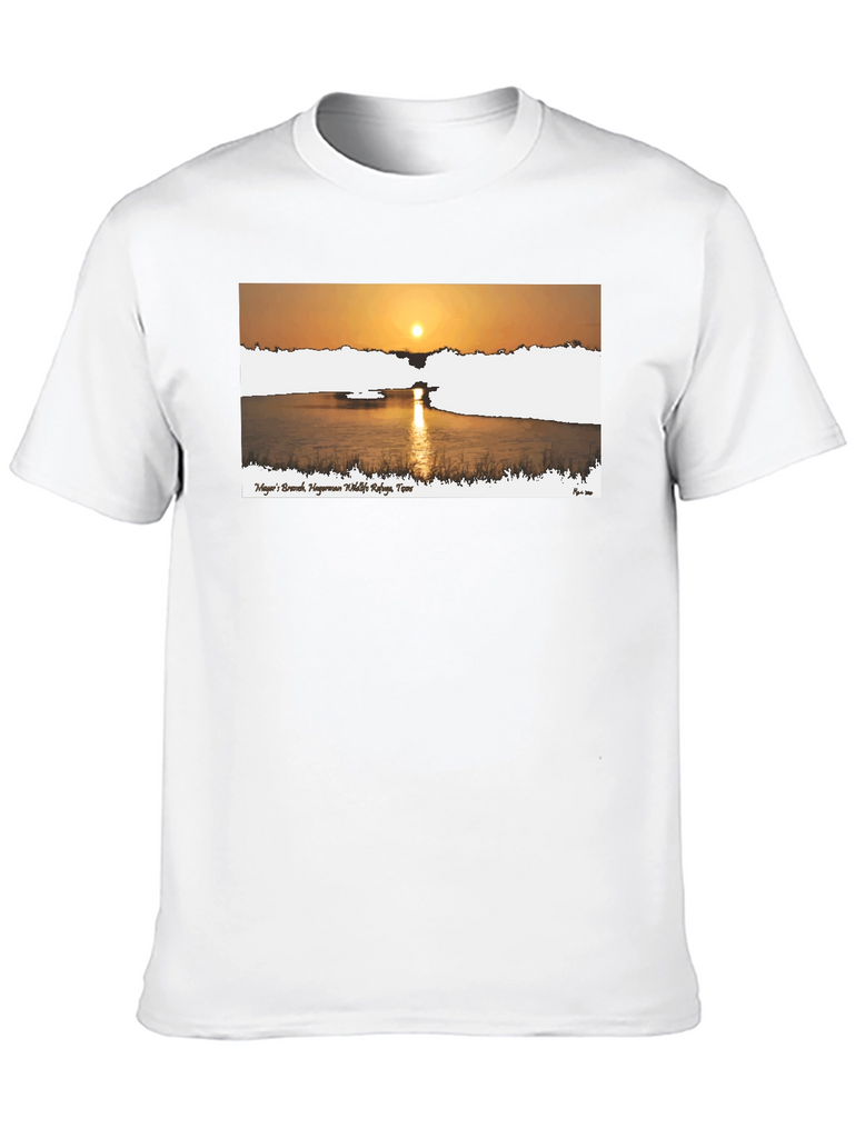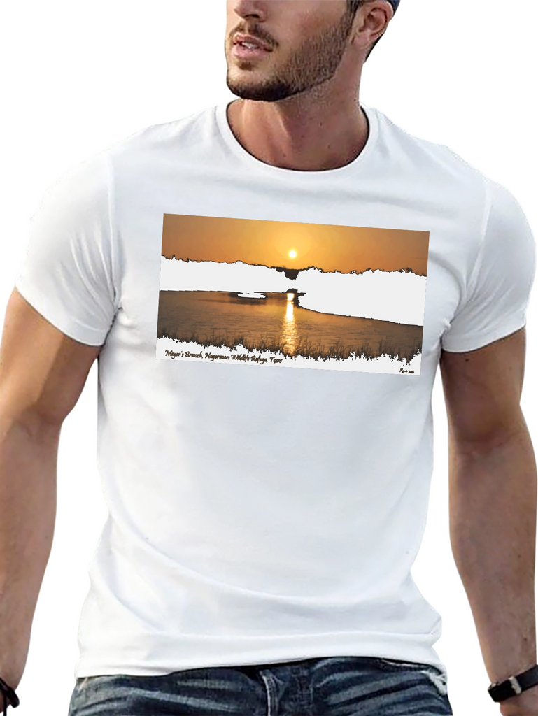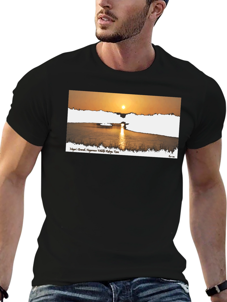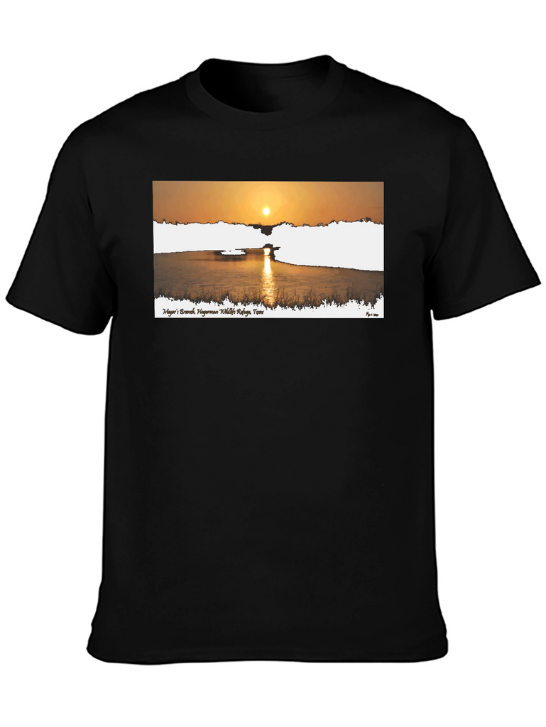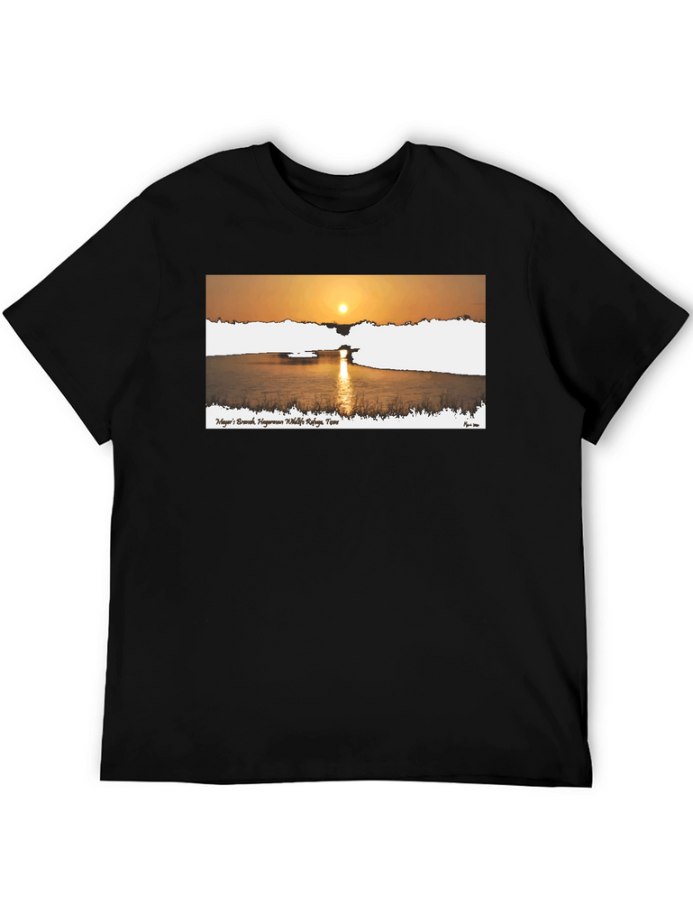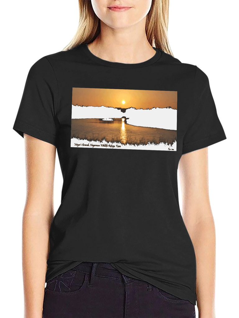 This stylish black t-shirt features a beautiful graphic print of a sunrise over a calm body of water. The design includes text, likely a place name, adding a touch of locality or personal significance. Made from a comfortable fabric, this tee is perfect for casual wear, whether you're running errands, meeting friends, or simply relaxing at home. The striking graphic makes it a versatile piece that can be paired with jeans, shorts, or even dressed up with a blazer. Showcase your love for nature and scenic views with this unique and eye-catching t-shirt.