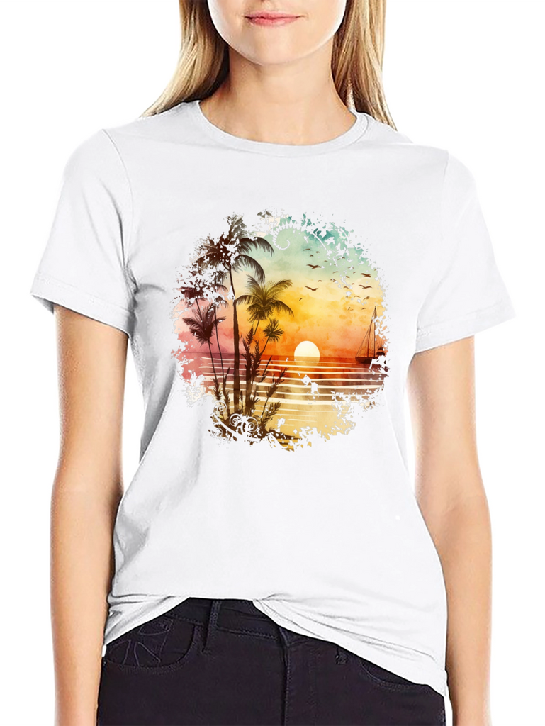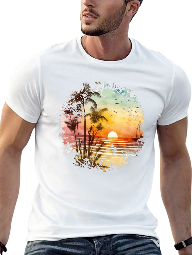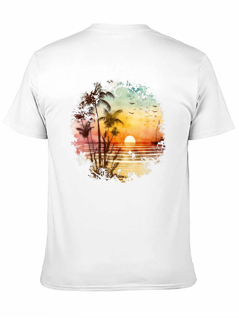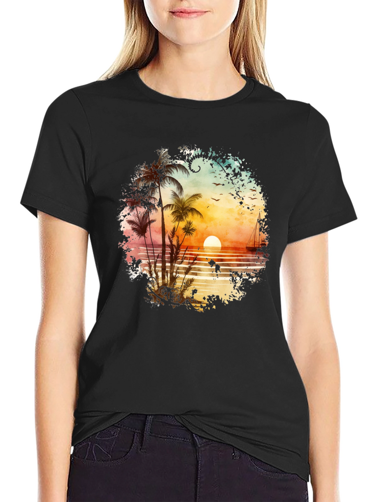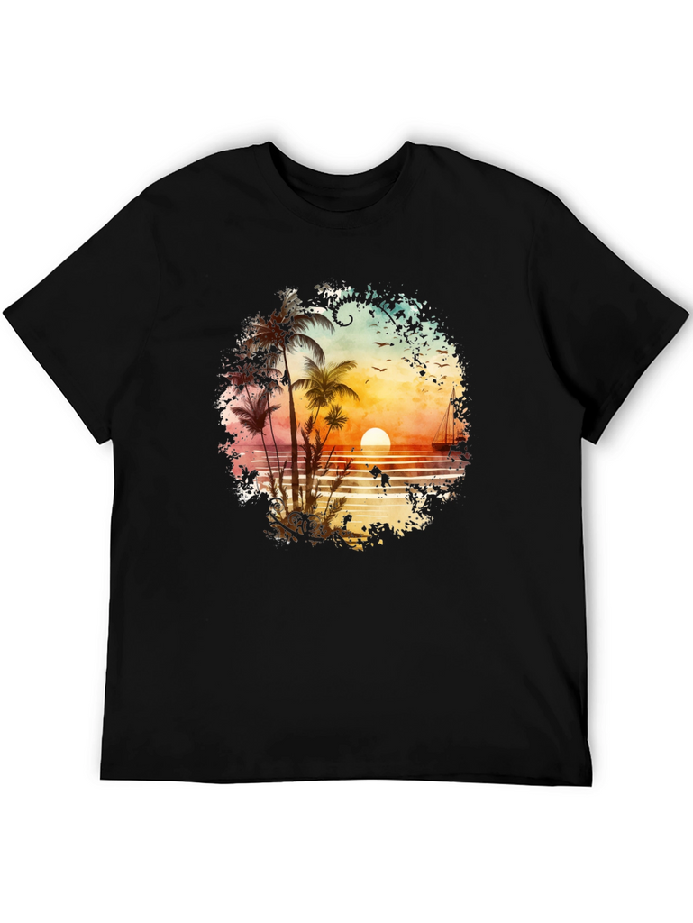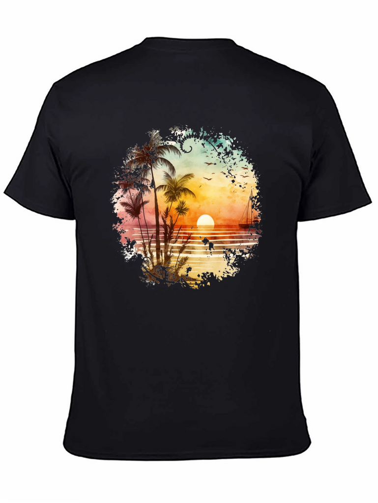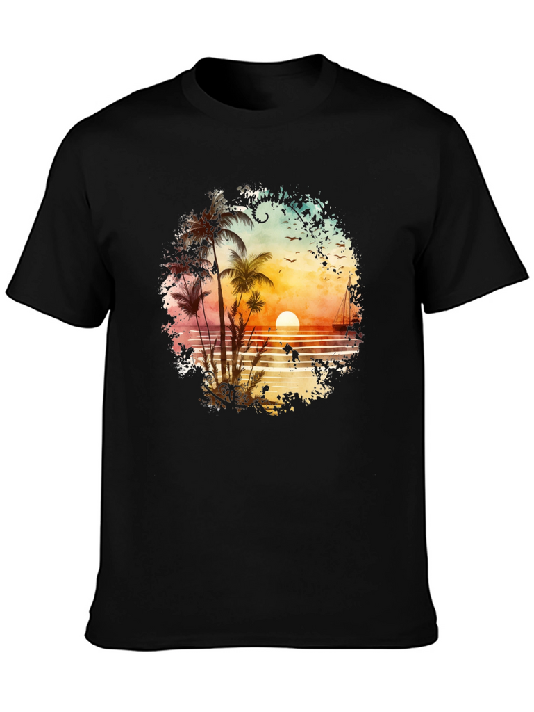 Embrace the serenity of a tropical sunset with this stylish black t-shirt. The eye-catching graphic features swaying palm trees silhouetted against a vibrant sunset, complete with tranquil water reflections and a distant sailboat. The design evokes feelings of relaxation and escape. Perfect for casual wear, beach outings, or simply adding a touch of summer to your everyday style. This comfortable tee is sure to become a wardrobe favorite, reminding you of warm breezes and picturesque shores. A must-have for anyone who loves the beach and vibrant artwork!