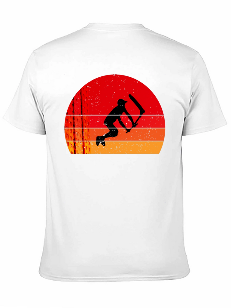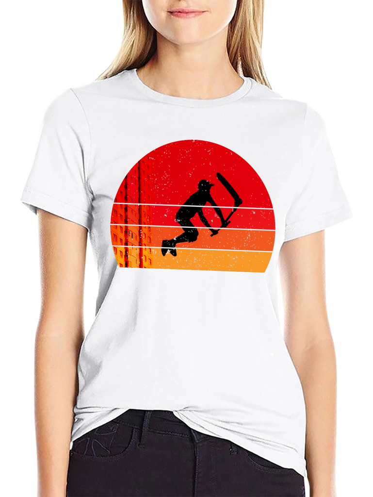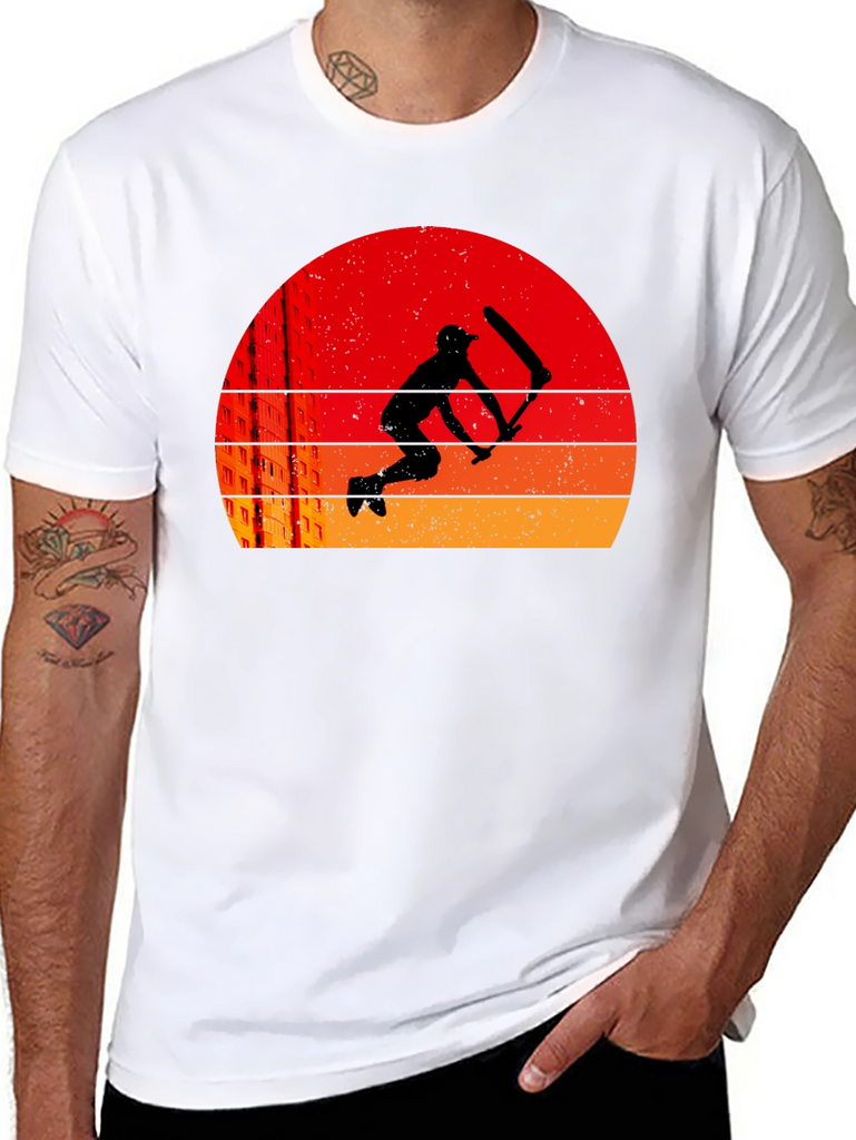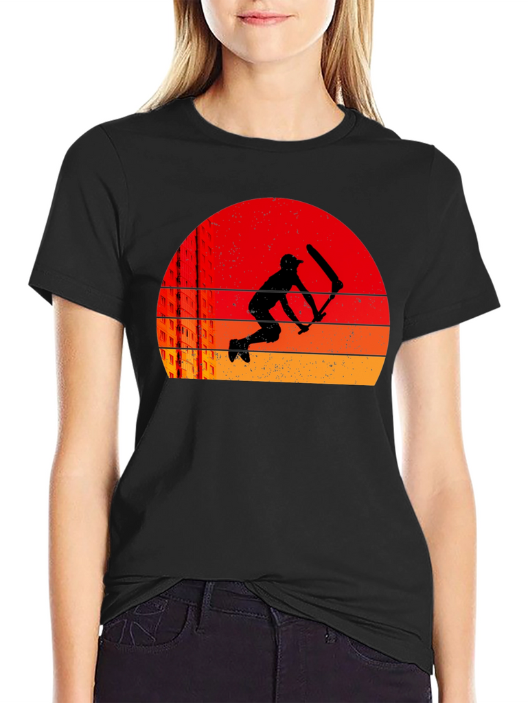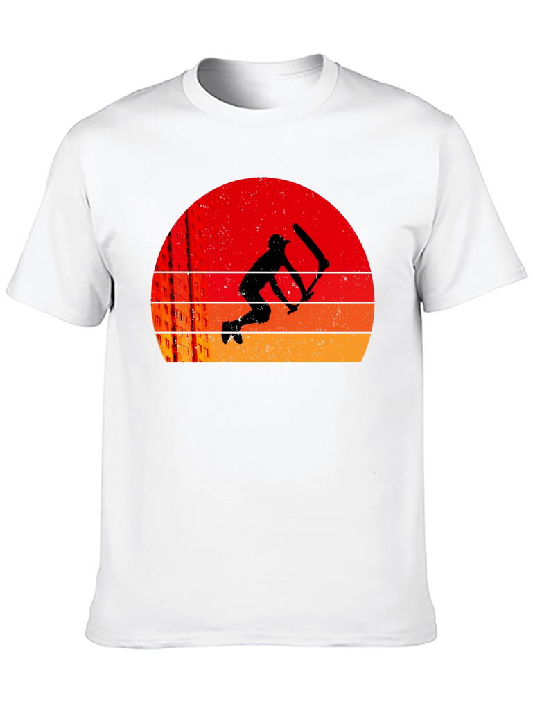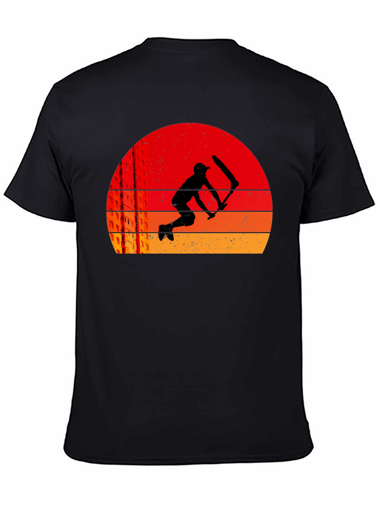 This black t-shirt features a striking graphic design of a cricket player in silhouette, set against a retro-style sunset background. The sunset consists of layered bands of red, orange, and yellow. The graphic also includes a suggestion of city buildings. The tee is a classic crew neck style, suitable for casual wear, sports, or cricket enthusiasts. It's a comfortable and stylish choice, perfect for expressing your love for cricket or simply adding a unique piece to your wardrobe. Ideal for everyday wear or as a gift for cricket lovers.