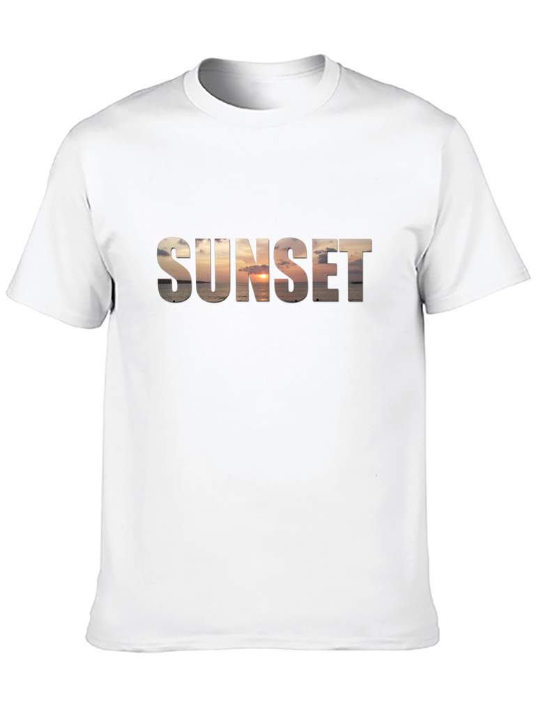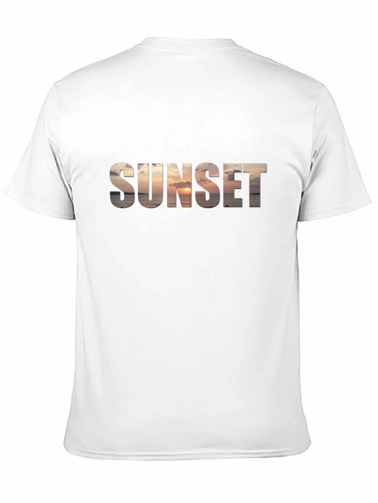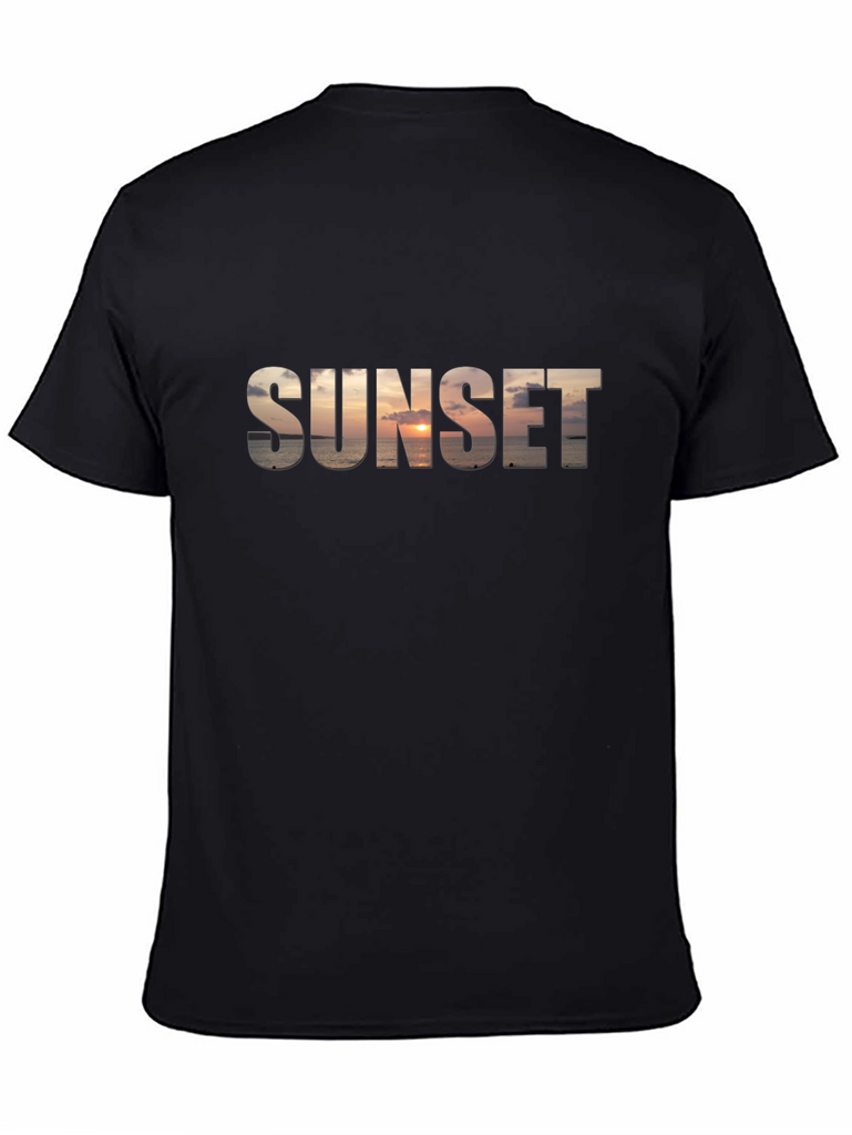 Capture the essence of a breathtaking sunset with this stylish black t-shirt. The word "SUNSET" is boldly emblazoned across the chest, filled with a stunning ocean sunset scene. This unique design blends comfort and style, making it a standout piece for casual wear. Perfect for everyday wear, beach outings, or casual evenings, this tee is sure to turn heads and spark conversations. The classic black color provides a versatile backdrop for the vibrant sunset graphic, making it easy to pair with jeans, shorts, or your favorite casual bottoms. Embrace the beauty of nature with this eye-catching t-shirt.