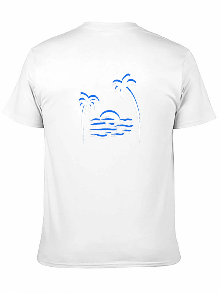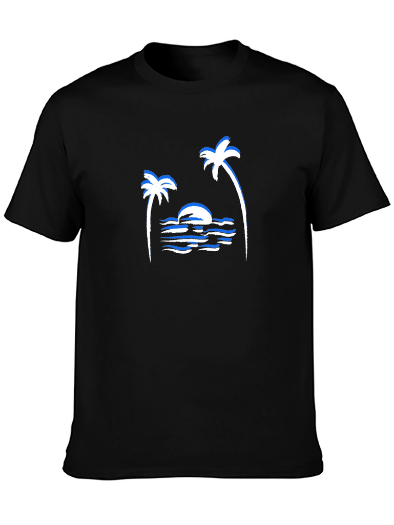 Capture the essence of island life with this stylish black t-shirt. Featuring a striking white graphic of a sunset scene with palm trees and ocean waves, this tee offers a relaxed and laid-back vibe. The design includes blue highlights adding depth and interest. Made from a comfortable-looking fabric, this shirt is perfect for casual wear, beach outings, or bringing a touch of vacation to your everyday style. Show off your love for tropical sunsets. This t-shirt is an ideal choice for any adventure.