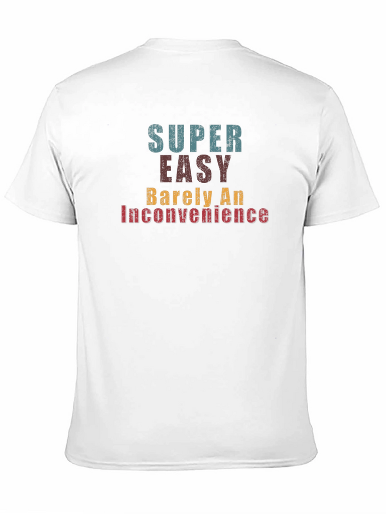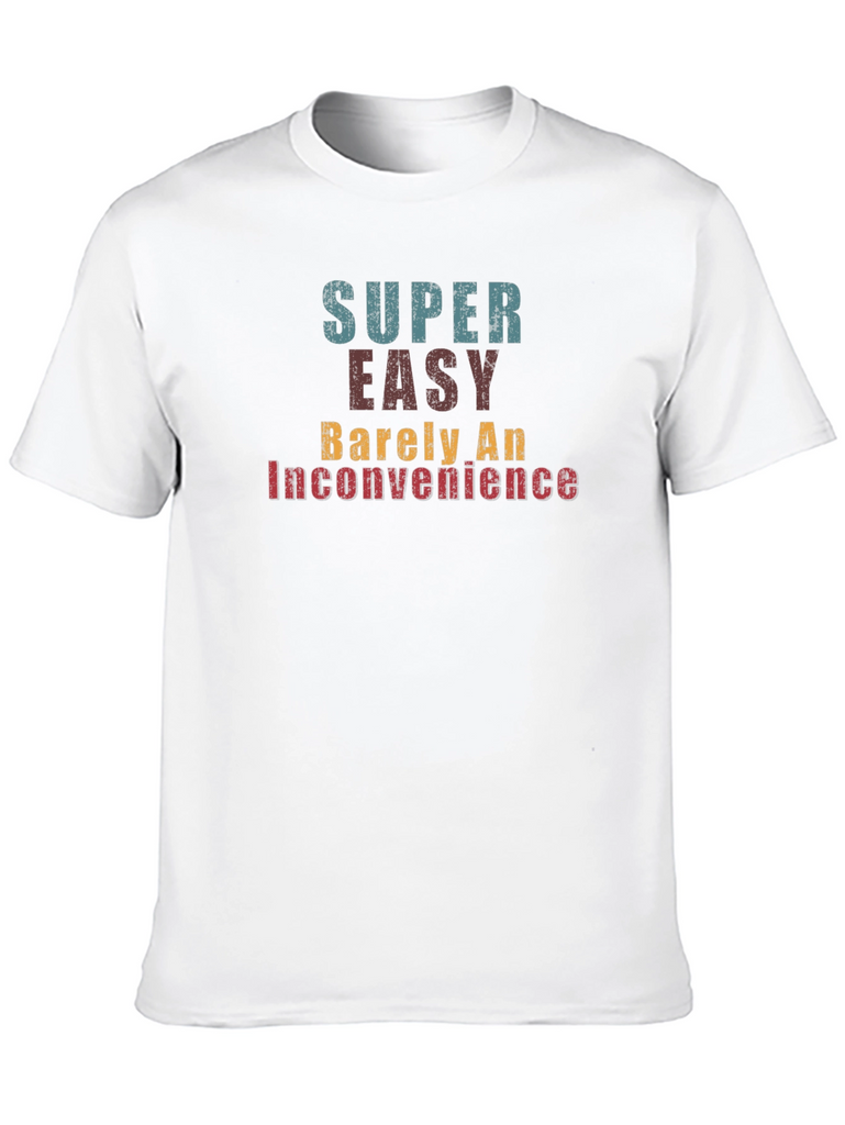 This classic tee features the phrase "Super Easy, Barely An Inconvenience" in a vintage, distressed font. The words are stacked on top of each other in varying shades of teal, brown and red. The shirt is a solid black color. It's casual enough for everyday wear but makes a statement about your easygoing attitude. Made from soft, breathable fabric, this tee provides all-day comfort. Perfect for casual outings, lounging at home, or expressing your sense of humor. Makes a great gift!
