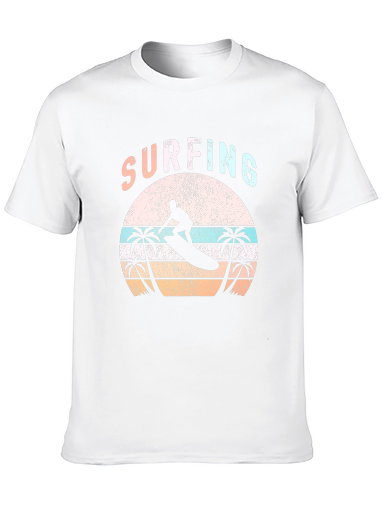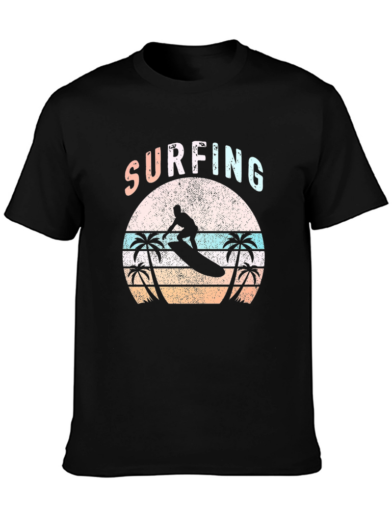 Catch some waves in style with this unique surfing graphic t-shirt! Featuring a vibrant retro sunset design with palm trees and a surfer silhouette, this tee is perfect for beach lovers and surfing enthusiasts. Made from a soft, comfortable fabric, it's ideal for casual wear, vacations, or simply showing off your passion for the surf lifestyle. The eye-catching design and relaxed fit make it a great addition to any wardrobe. Whether you're hitting the beach or hanging out with friends, this tee is sure to make a splash.