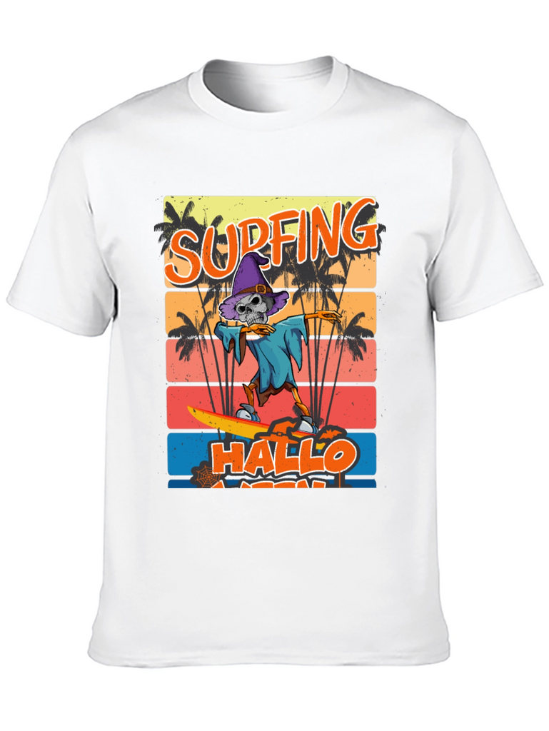 Ride the spooky waves with this unique Surfing Halloween Skeleton T-Shirt! This eye-catching tee features a vibrant, retro-inspired design of a skeleton sporting a witch's hat while shredding a surfboard. The "SURFING HALLO-WEEN" text adds a playful touch, perfect for adding some humor to your Halloween wardrobe. Set against a backdrop of tropical palm trees and sunset hues, this t-shirt is sure to turn heads. Made from comfortable material, this shirt is ideal for casual outings, Halloween parties, or a fun day at the beach. Get yours today and make a splash this Halloween!