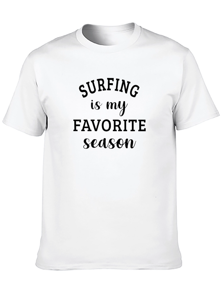 This classic black t-shirt features a bold statement: "Surfing is my favorite season." Made from what appears to be soft, breathable cotton, this tee offers both comfort and style. The clean design and straightforward message make it perfect for casual wear, whether you're hitting the beach or just relaxing at home. It's a great way to express your love for surfing. This versatile tee pairs well with shorts, jeans, or even a casual jacket. Show off your passion for the waves with this comfortable and stylish t-shirt!
