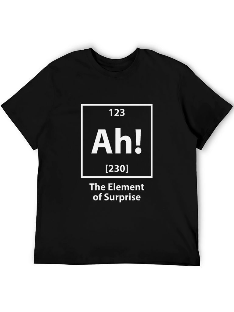Show off your nerdy side with this fun and unique t-shirt! This black t-shirt features a graphic resembling a periodic table element, but instead of a chemical symbol, it displays 'Ah!' in bold, making it a humorous 'Element of Surprise'. Made from a comfortable-looking fabric, this tee offers both style and comfort. Perfect for chemistry enthusiasts, science lovers, or anyone with a quirky sense of humor. Wear it casually, to school, or even to a science-themed event. Get ready for some laughs and attention with this conversation-starter tee!