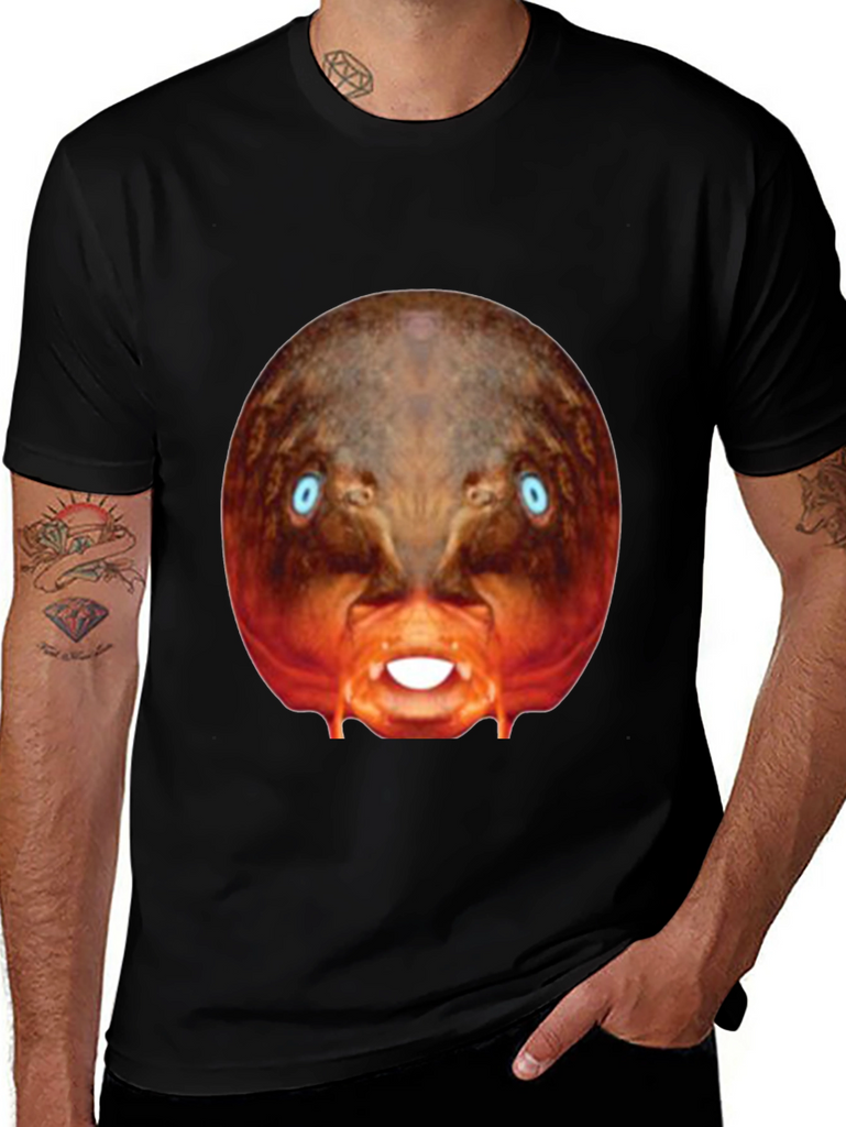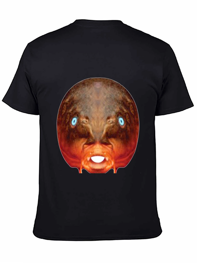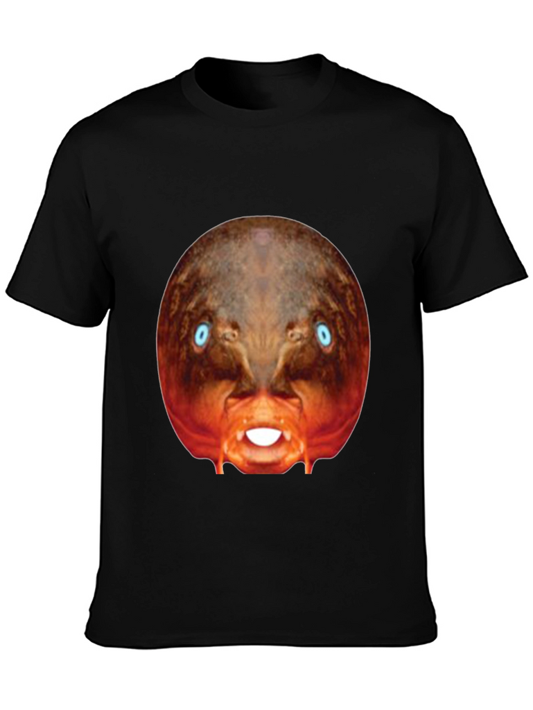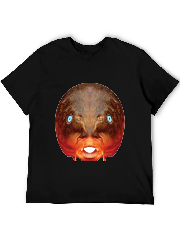 Make a bold statement with this eye-catching black t-shirt! This tee features a bizarre, digitally-rendered image of a creature with piercing blue eyes and exposed teeth, centered prominently on the chest. The surreal design stands out against the classic black backdrop. Made from what appears to be a soft, comfortable cotton blend, this shirt is perfect for casual wear, concerts, or adding a touch of the unexpected to your everyday style. Express your unique personality with this conversation-starting graphic tee. Perfect for those who appreciate distinctive designs and want to make a statement.