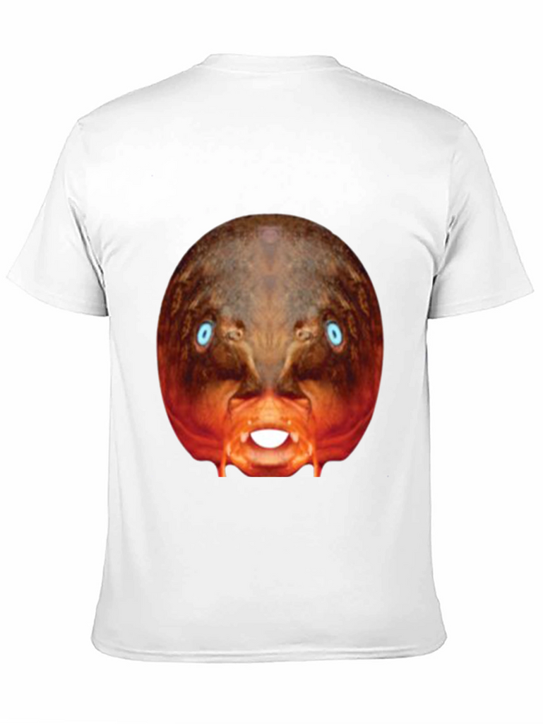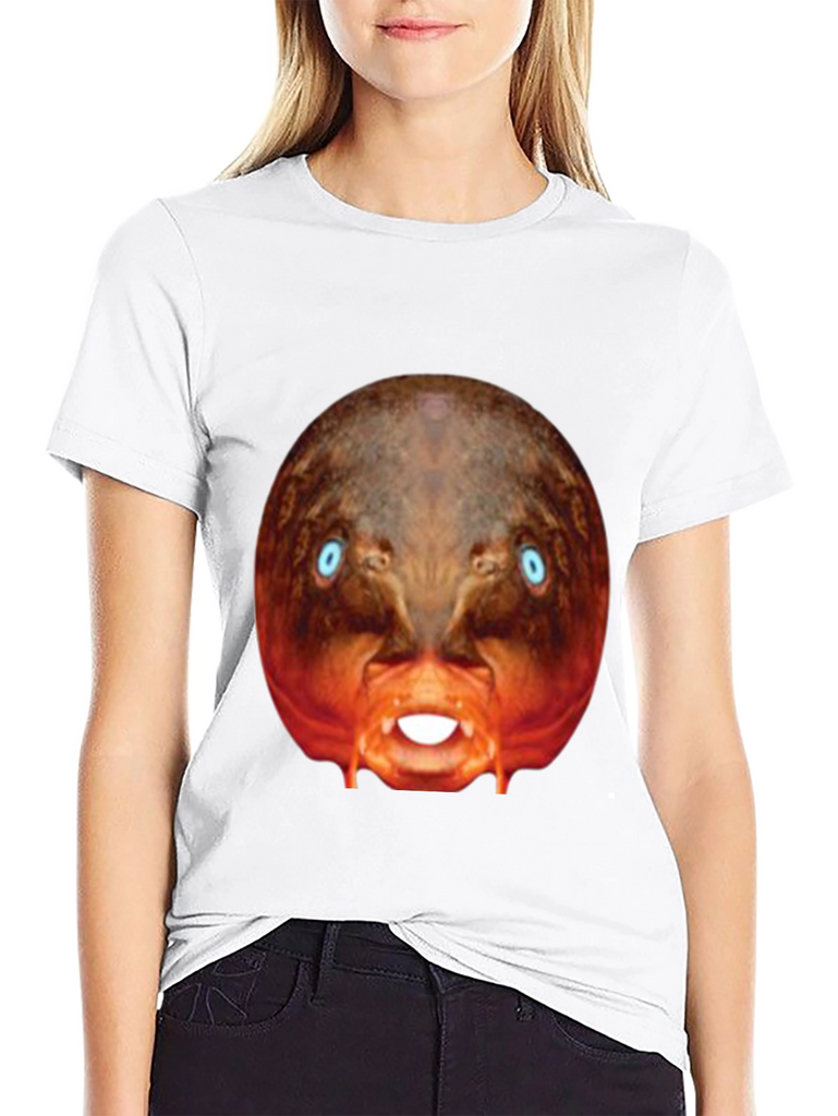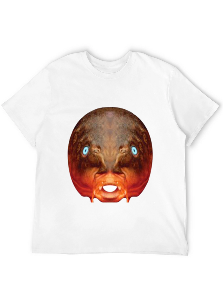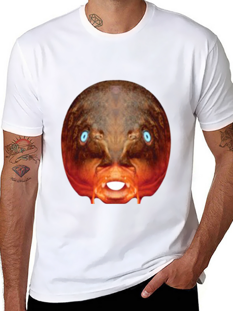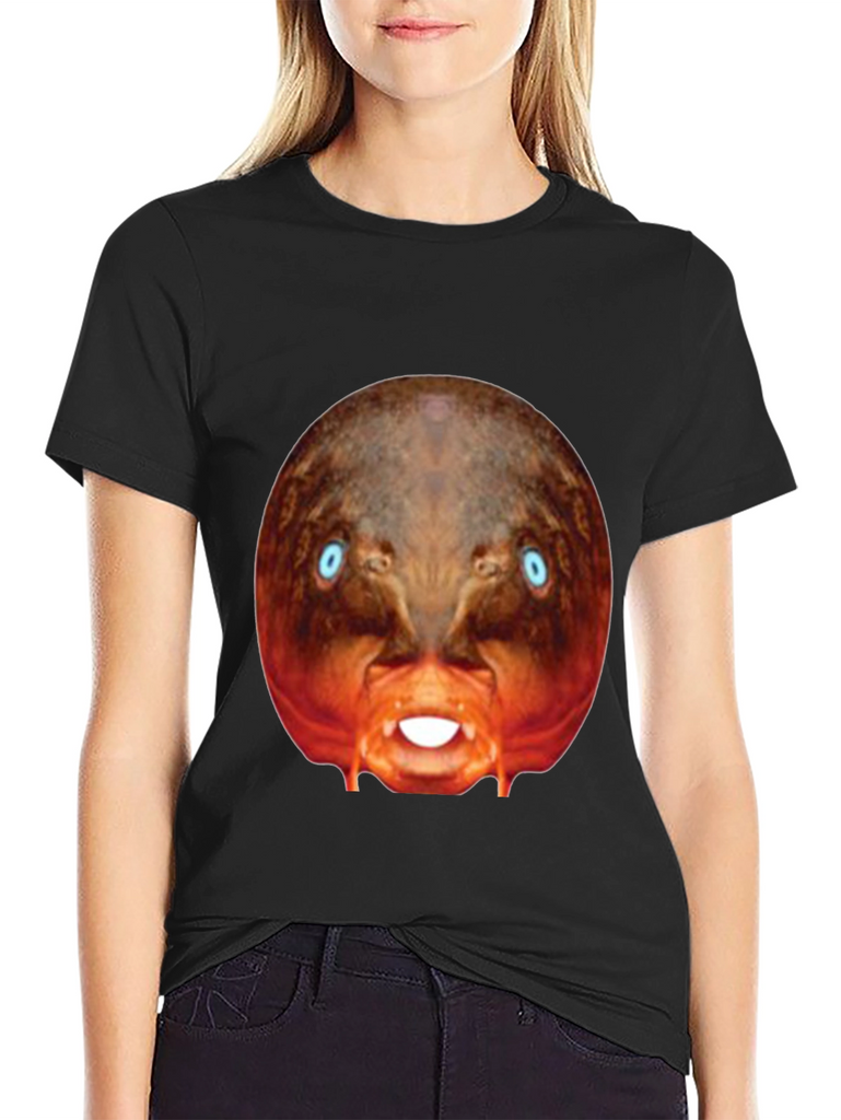 Make a bold statement with this eye-catching black t-shirt! This tee features a bizarre, digitally-rendered image of a creature with piercing blue eyes and exposed teeth, centered prominently on the chest. The surreal design stands out against the classic black backdrop. Made from what appears to be a soft, comfortable cotton blend, this shirt is perfect for casual wear, concerts, or adding a touch of the unexpected to your everyday style. Express your unique personality with this conversation-starting graphic tee. Perfect for those who appreciate distinctive designs and want to make a statement.