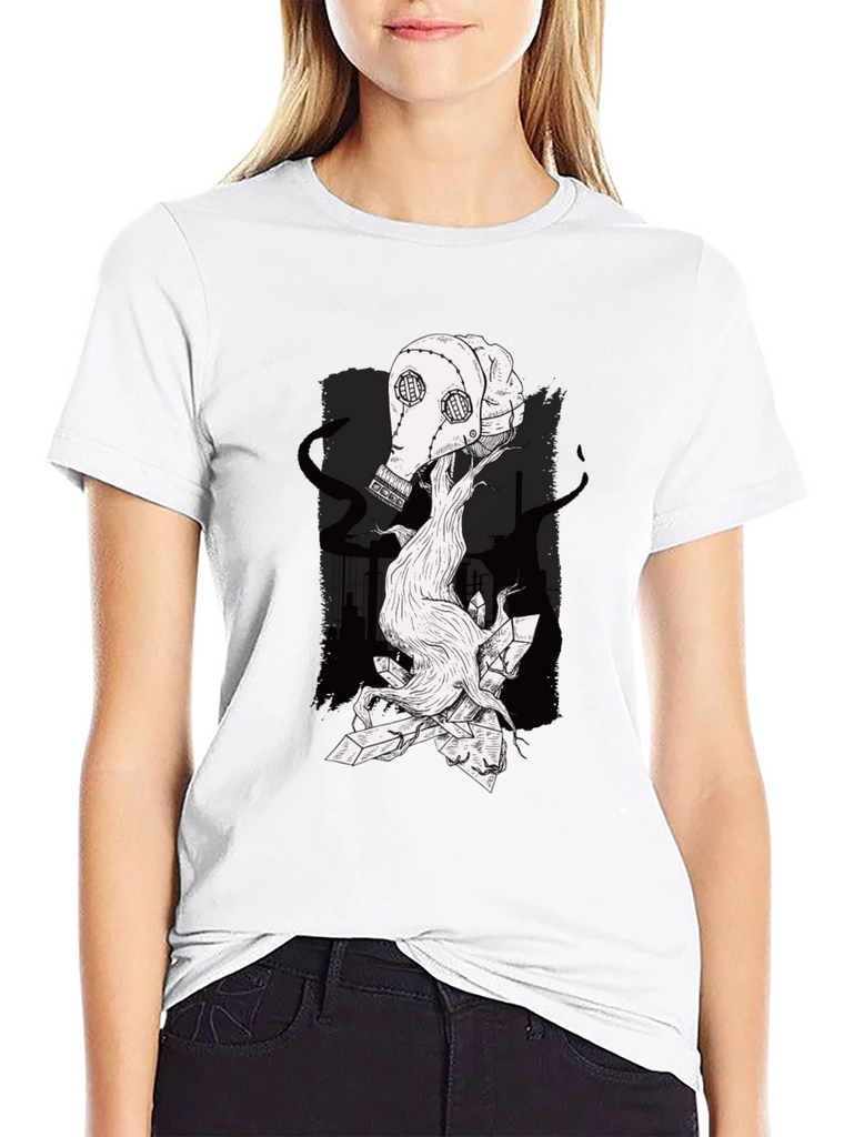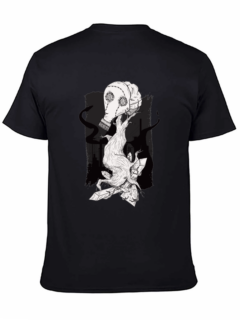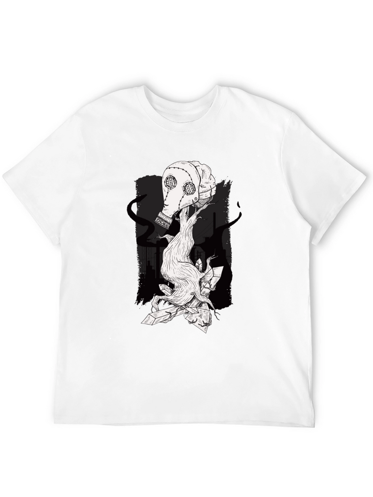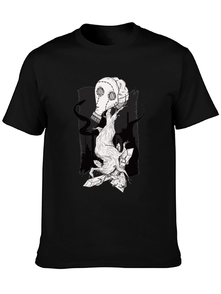 Embrace the unconventional with this striking black graphic tee. Featuring a surreal design, the shirt showcases a vintage-style gas mask atop crystal-like formations, all rendered in detailed black and white illustration. The contrasting art creates an eye-catching effect, perfect for expressing individuality. Made from a comfortable, breathable fabric, this tee is ideal for everyday wear or as a statement piece for casual outings. Add an edgy touch to your wardrobe with this unique and conversation-starting garment.