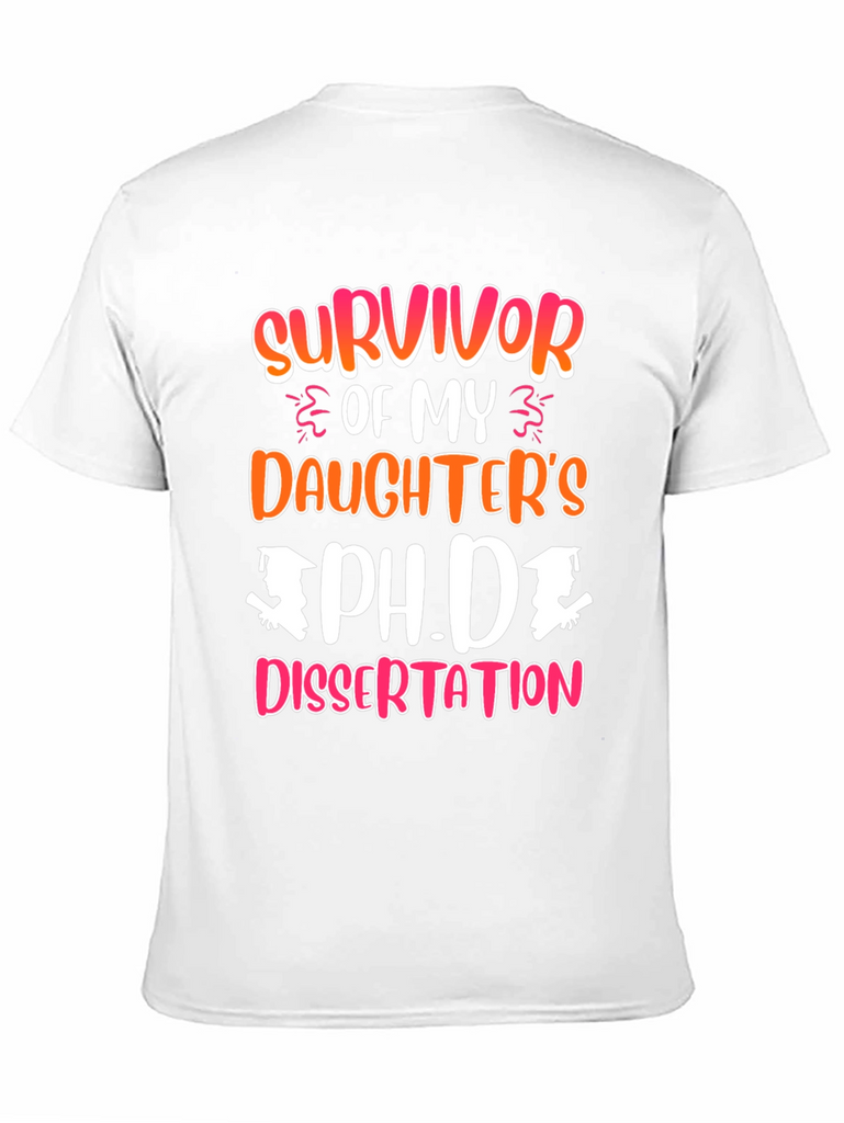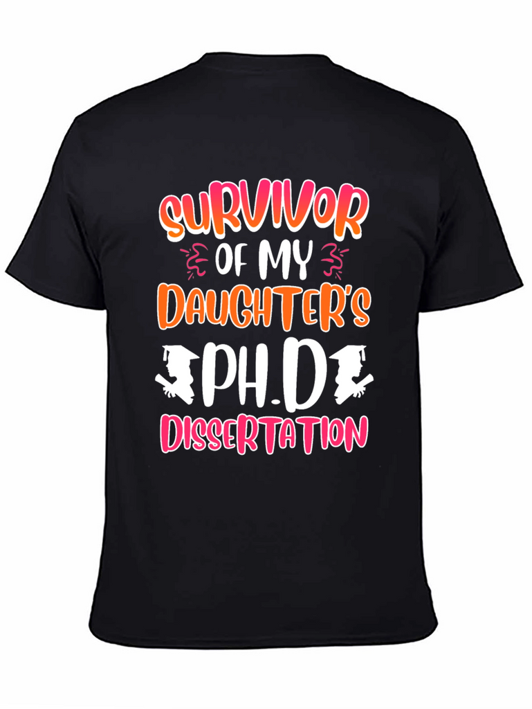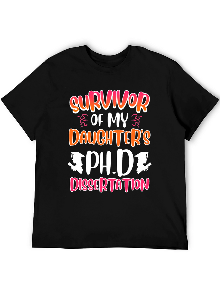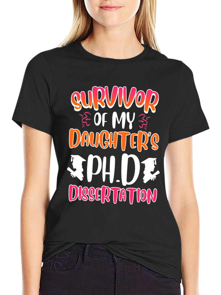 Celebrate a monumental achievement with this fun "Survivor of My Daughter's Ph.D. Dissertation" T-shirt. Made from comfortable, breathable cotton, this black tee features a vibrant, eye-catching design. The text is in a gradient pink and orange, with graduation cap accents on 'Ph.D.' Show your pride and humorously commemorate the journey with this memorable shirt. Perfect for graduation ceremonies, family gatherings, or casual wear, this T-shirt makes a great gift for supportive parents.