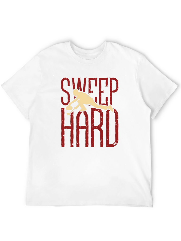 Show your passion for curling with this stylish black t-shirt! Featuring a unique graphic design with the phrase "SWEEP HARD" and a curling player silhouette, this tee is perfect for curling enthusiasts. Made from what appears to be a comfortable and breathable fabric, it's ideal for casual wear, sports events, or curling practice. The bold design and classic fit make it a standout piece in any wardrobe. Get ready to sweep hard and look great doing it!