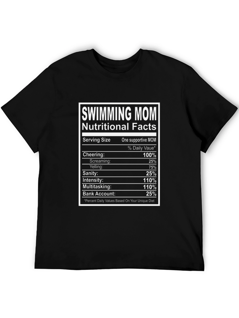 This black t-shirt features a humorous "Nutritional Facts" label design specifically for a "Swimming Mom." The graphic, presented in a white bordered box, mimics a nutrition label, listing stats such as "Cheering: 100%" and "Intensity: 110%." This shirt is perfect for swim moms who are passionate about supporting their kids. The novelty tee is a fun and lighthearted way to show your dedication and sense of humor. Wear it to swim meets, practices, or casual outings to let everyone know you're a proud and supportive swimming mom!
