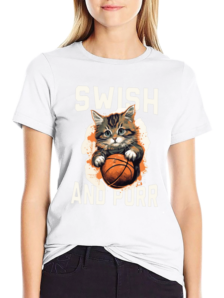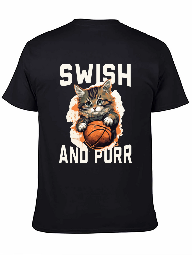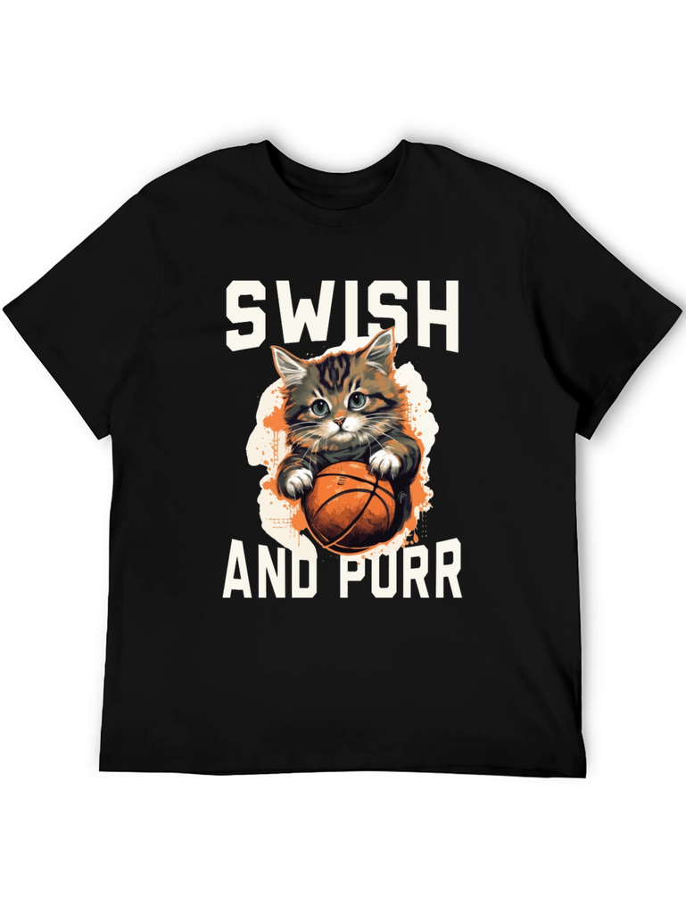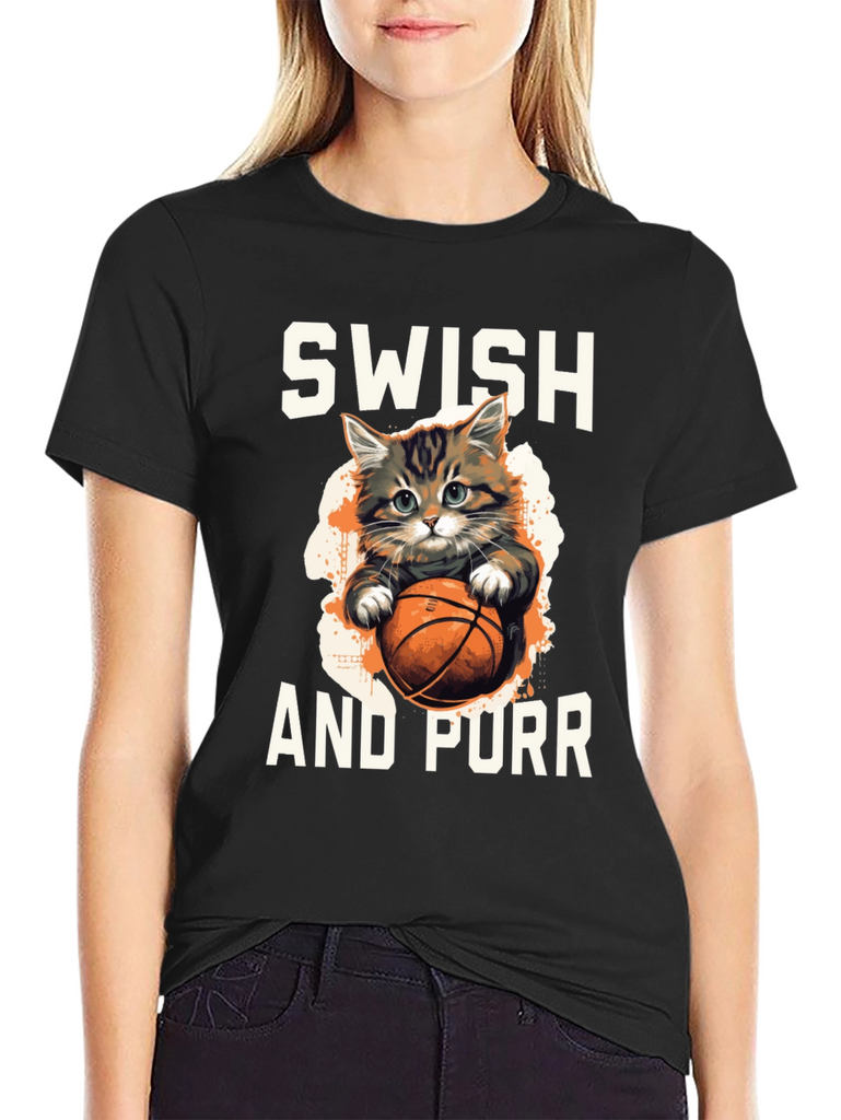 Score style points with this unique t-shirt! Featuring a playful kitten graphic clutching a basketball, this shirt is perfect for cat lovers and basketball fans alike. The design pops against the classic black backdrop, with bold "SWISH AND PURR" lettering above and below the feline athlete. Made from a comfortable-looking fabric, this tee is ideal for casual wear, sports events, or just lounging around showing off your fun personality. Get ready to turn heads and spark conversations with this one-of-a-kind piece.