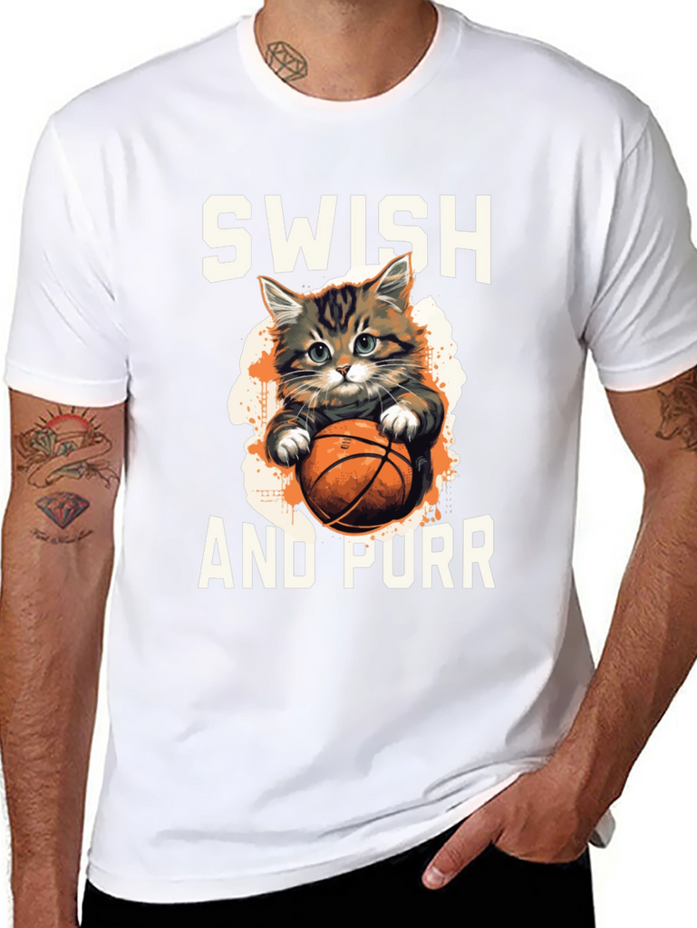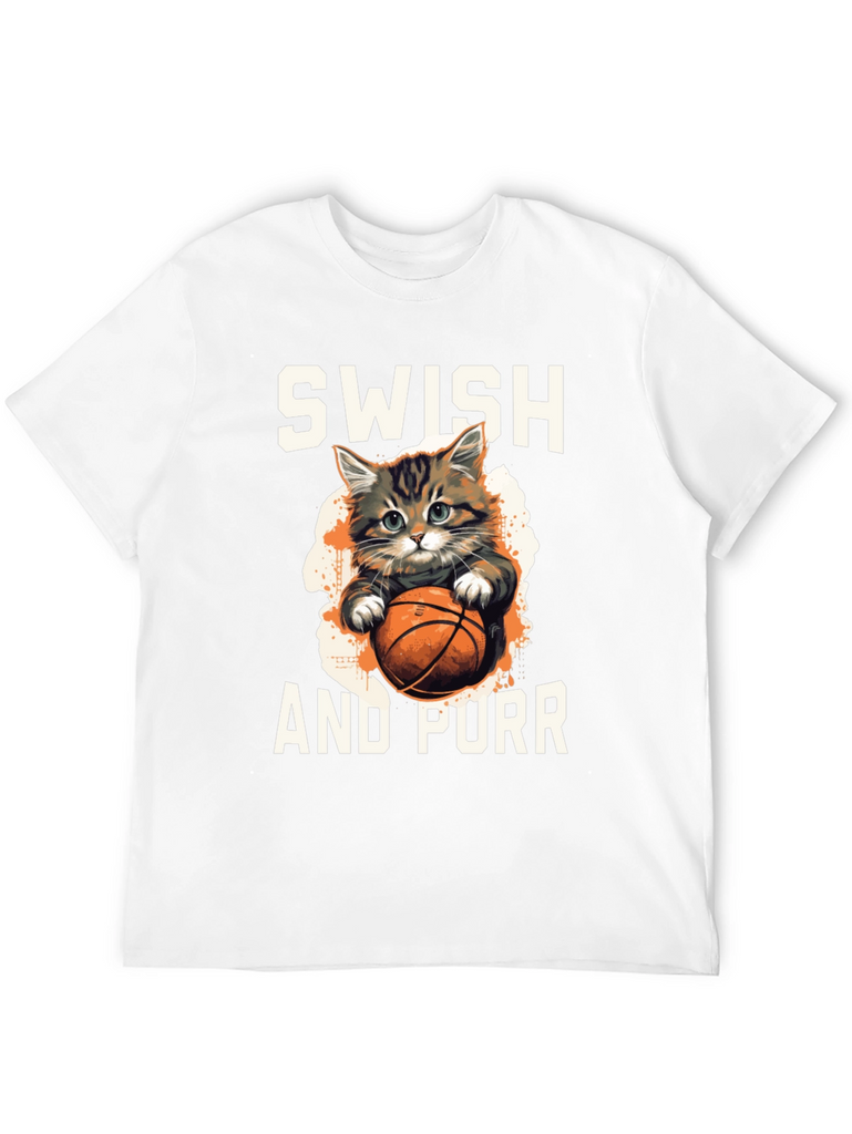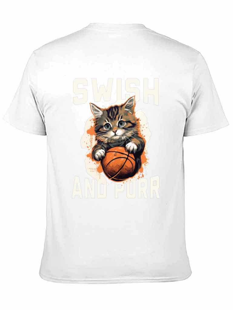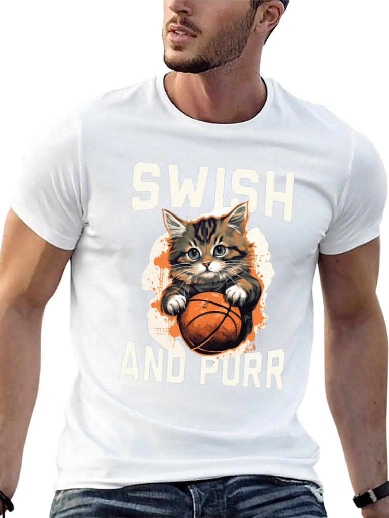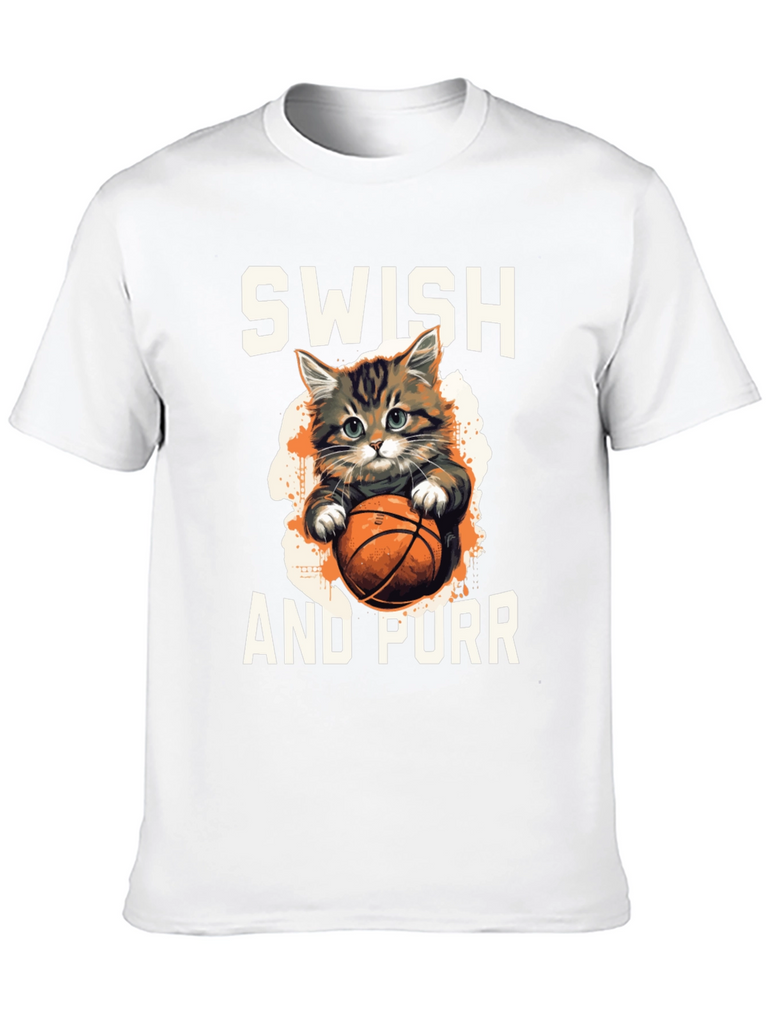 Score style points with this unique t-shirt! Featuring a playful kitten graphic clutching a basketball, this shirt is perfect for cat lovers and basketball fans alike. The design pops against the classic black backdrop, with bold "SWISH AND PURR" lettering above and below the feline athlete. Made from a comfortable-looking fabric, this tee is ideal for casual wear, sports events, or just lounging around showing off your fun personality. Get ready to turn heads and spark conversations with this one-of-a-kind piece.
