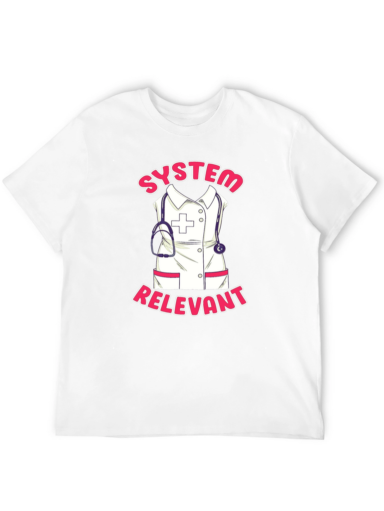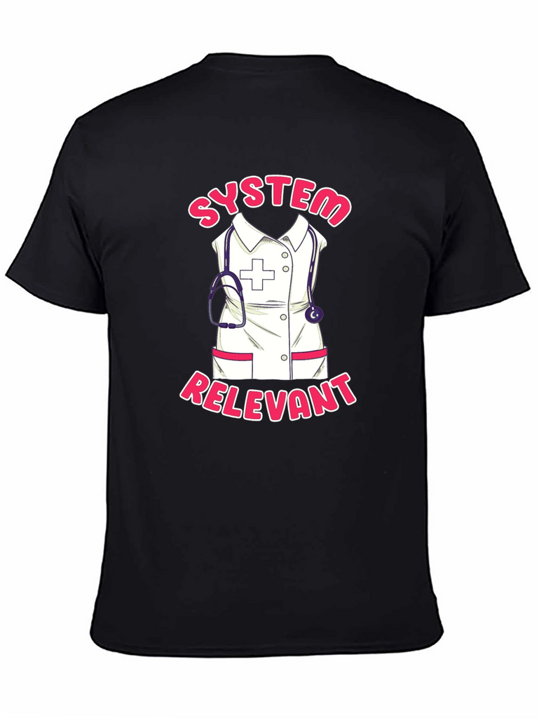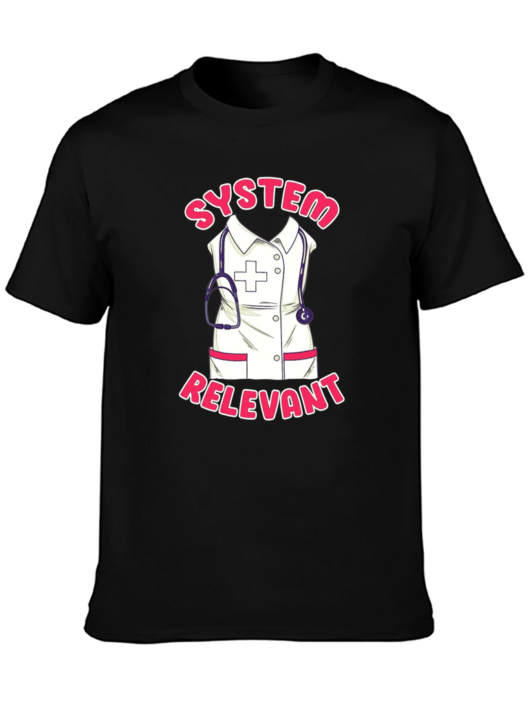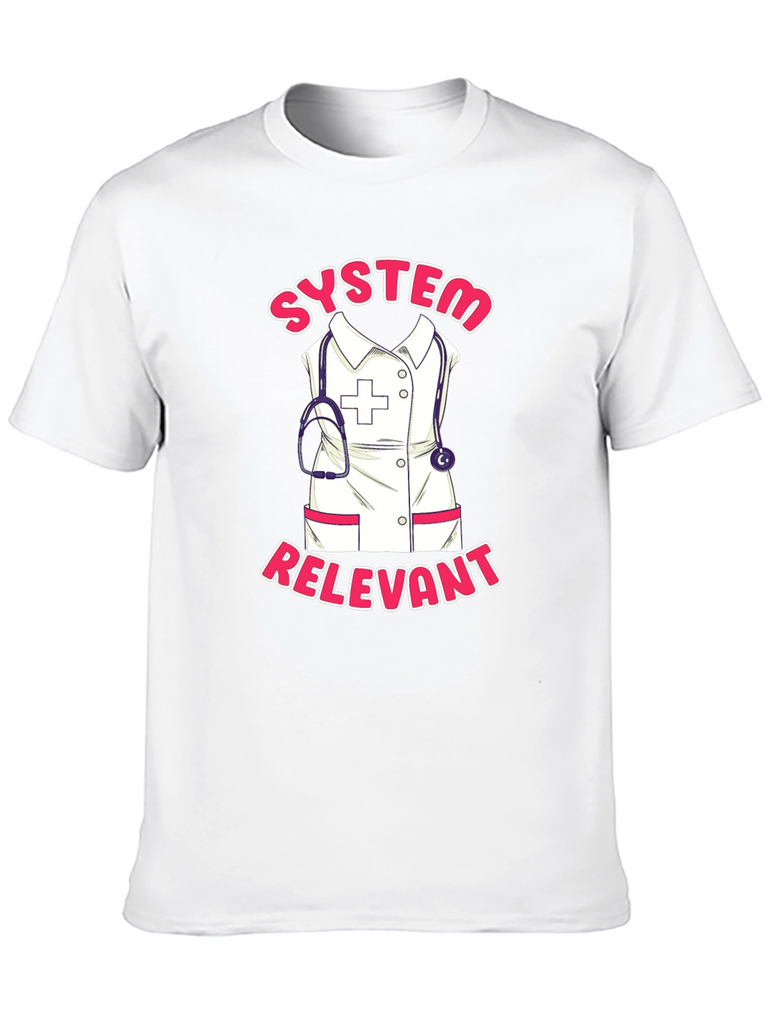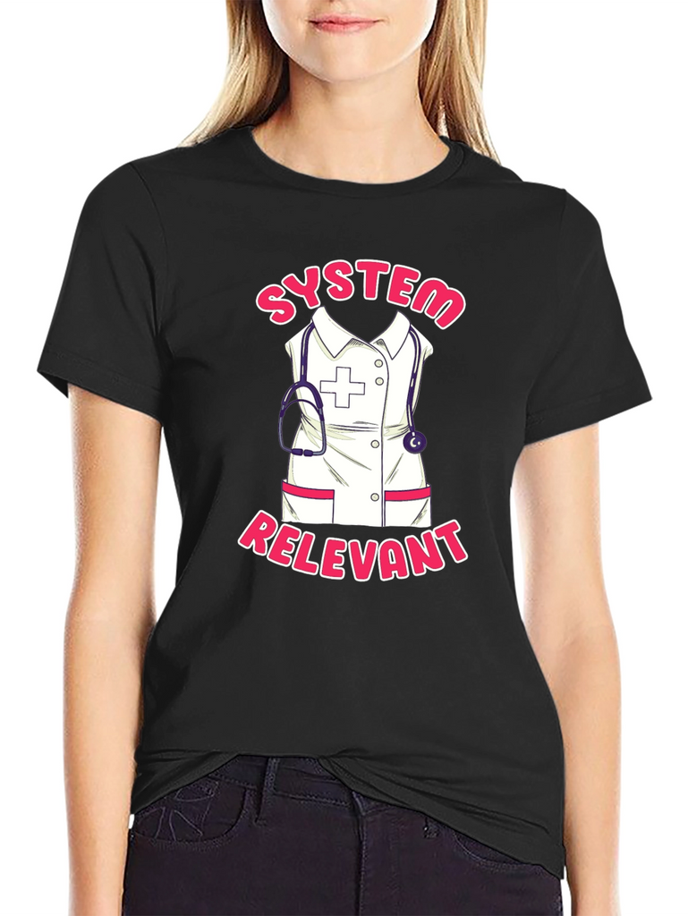 Show your support for nurses with this unique graphic t-shirt. The design features a stylized nurse uniform with a stethoscope, overlaid with the text "System Relevant". Made from comfortable, breathable fabric, this t-shirt is perfect for casual wear, medical professionals, or anyone who wants to show appreciation for healthcare workers. The bold graphic makes a statement, and the classic fit ensures a comfortable and flattering look. Wear it to work, events, or simply around town. A great gift idea for nurses and medical staff.