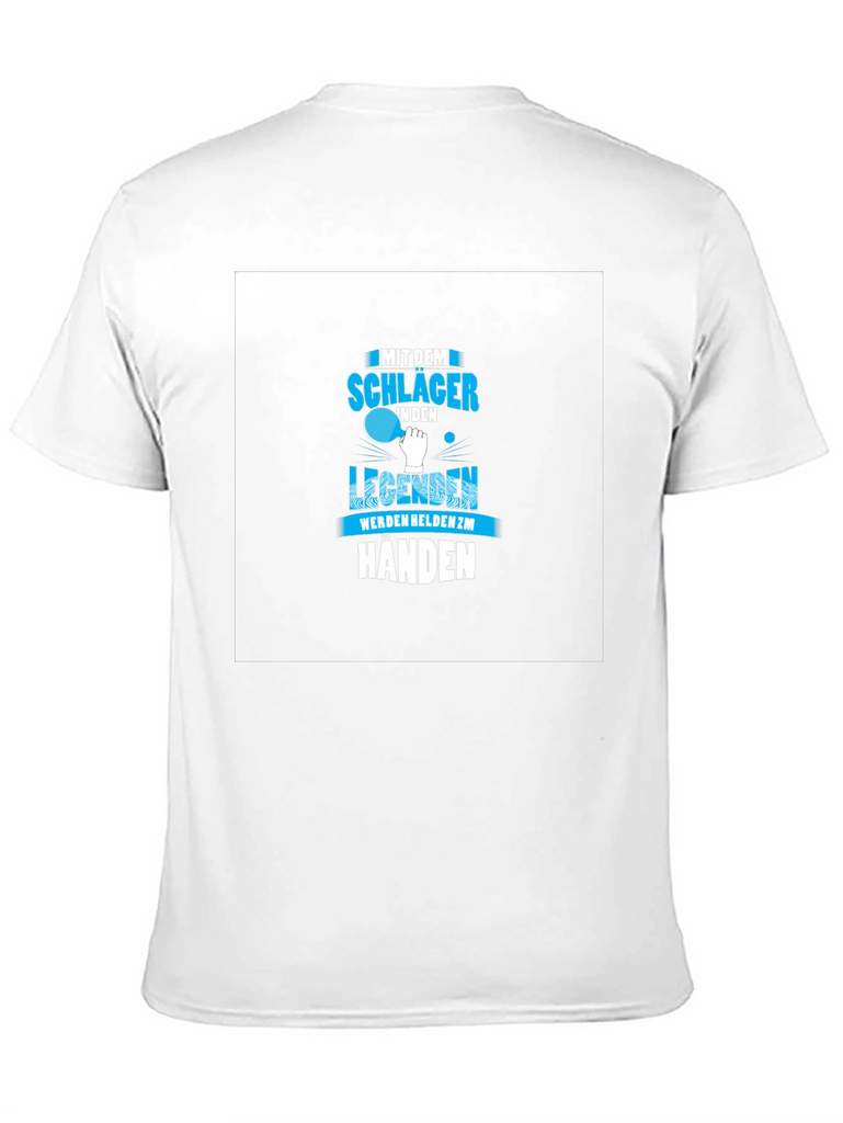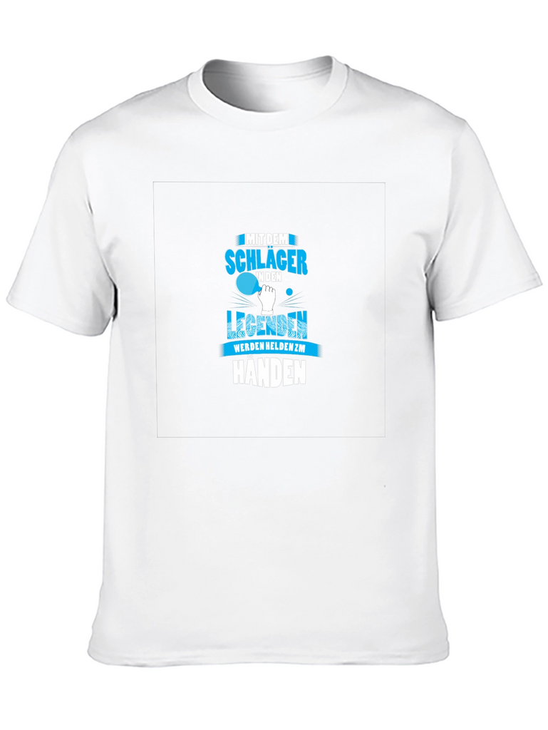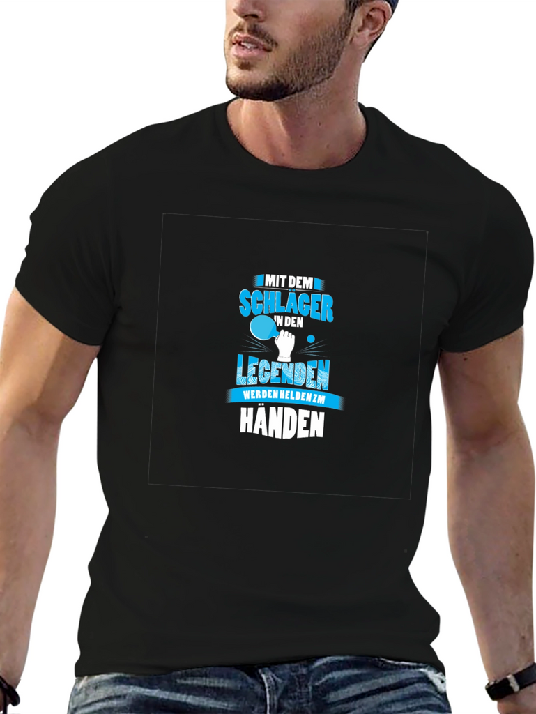 Show off your passion for table tennis with this stylish black t-shirt. The shirt features a unique graphic design with the text "Mit dem Schläger in den Legenden werden Helden zum Händen". Made from comfortable fabric, this tee is perfect for casual wear or hitting the table tennis court. The design showcases your love for the game. Get yours today and let everyone know you're a table tennis enthusiast!
