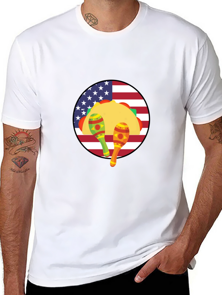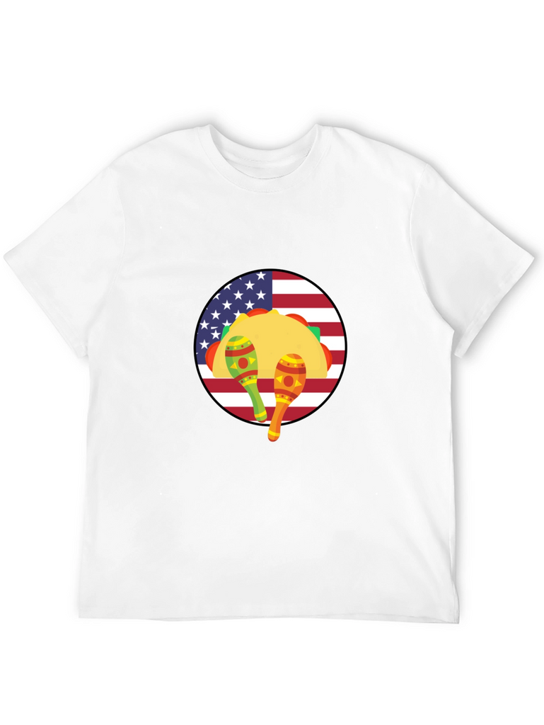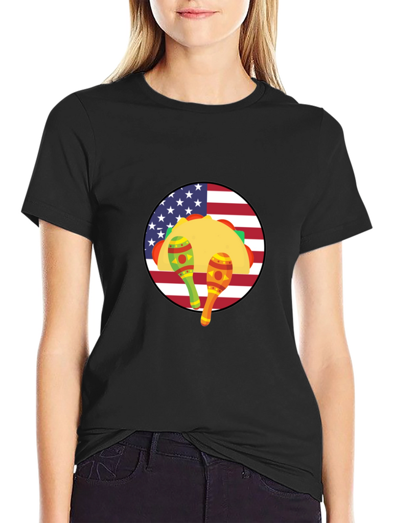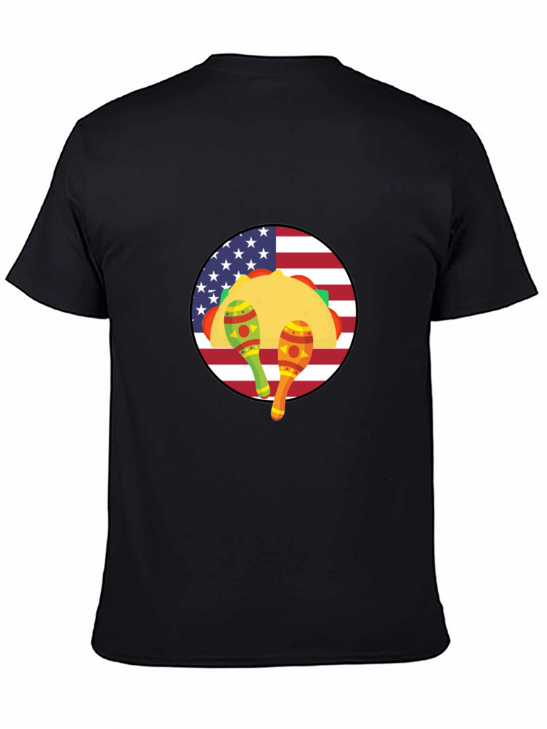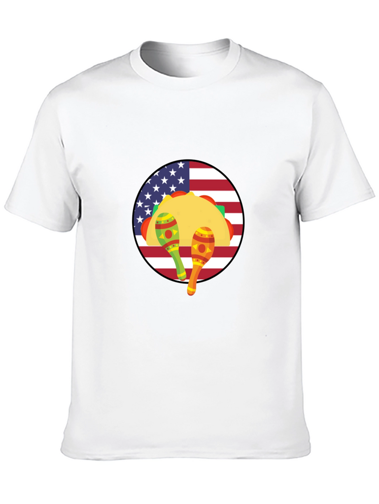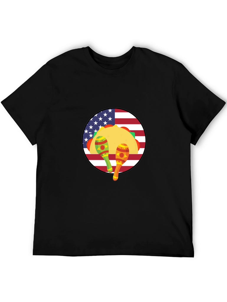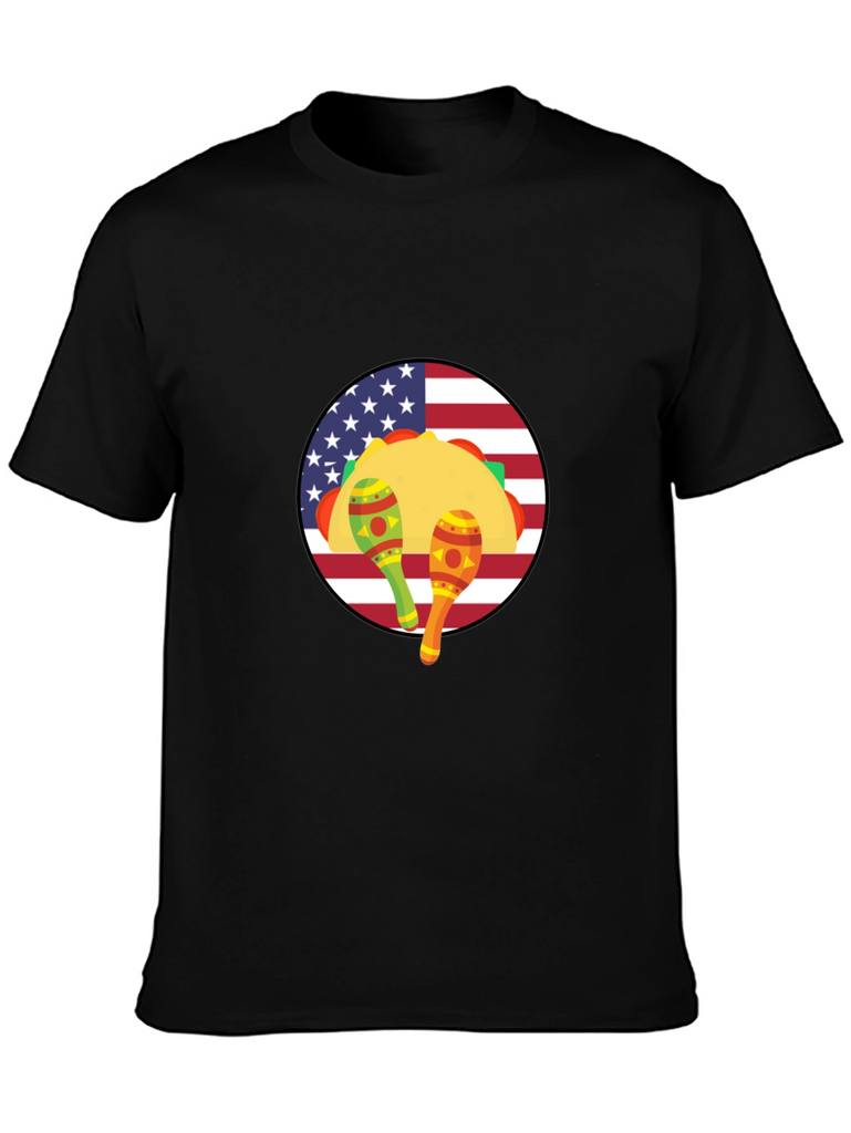 Show your love for tacos and America with this unique graphic t-shirt. The design features a delicious-looking taco with maracas, set against a background of the American flag. Made from a soft, comfortable fabric, this black tee is perfect for everyday wear. It's a fun and festive way to celebrate Cinco de Mayo, July 4th, or any day you're craving tacos. Whether you're heading to a barbecue, a fiesta, or just hanging out with friends, this t-shirt is sure to be a conversation starter. Get yours today and spice up your wardrobe!