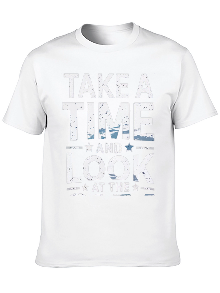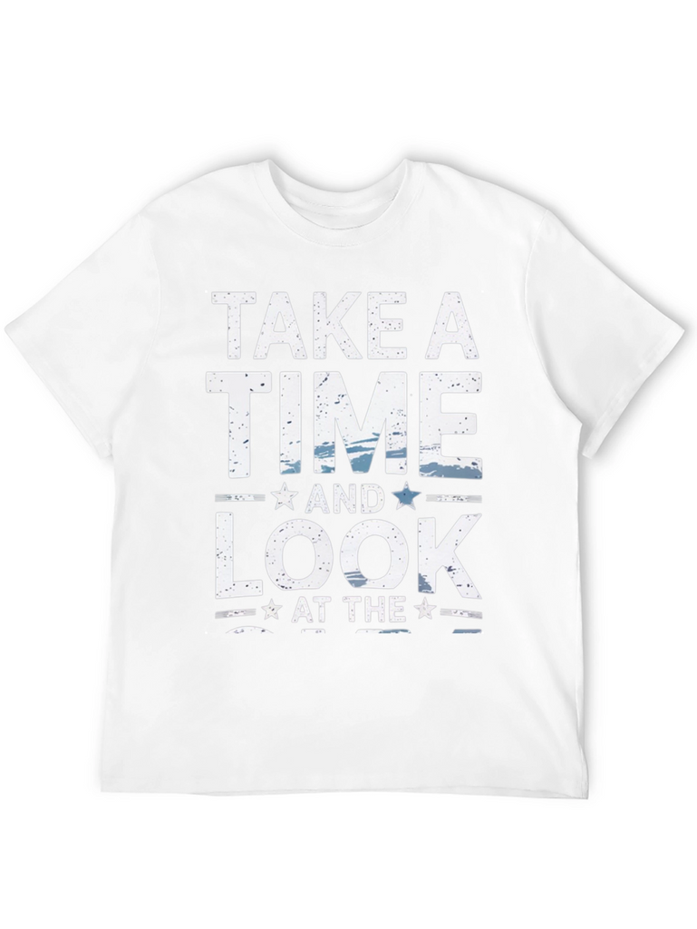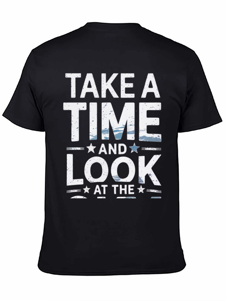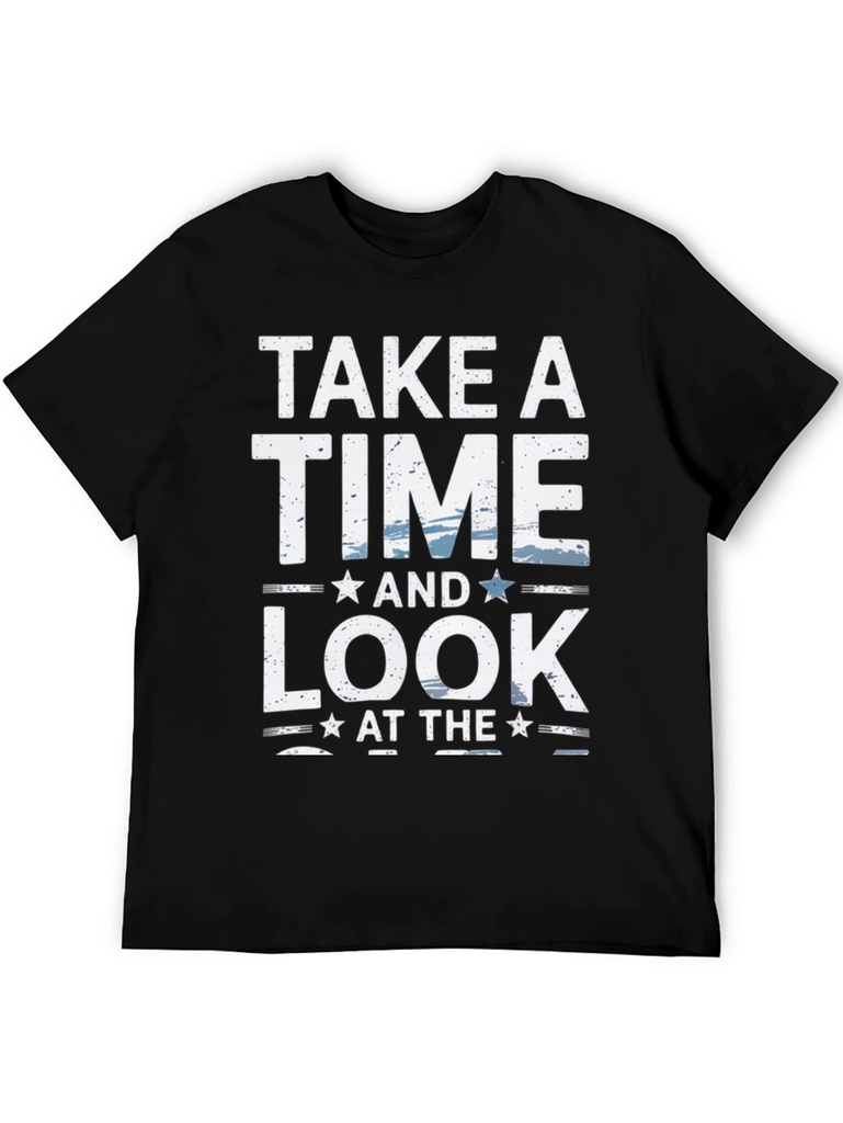 This black t-shirt features a bold, distressed graphic print that reads "TAKE A TIME AND LOOK AT THE". The design incorporates stars and stripes, giving it a patriotic feel. Made from a comfortable-looking fabric, this tee is perfect for casual wear. Its eye-catching design is sure to spark conversation and turn heads. Wear it on the 4th of July, to a political rally, or for everyday style. The durable print and soft fabric make this shirt a long-lasting addition to your wardrobe. This tee offers a stylish and comfortable way to express yourself.