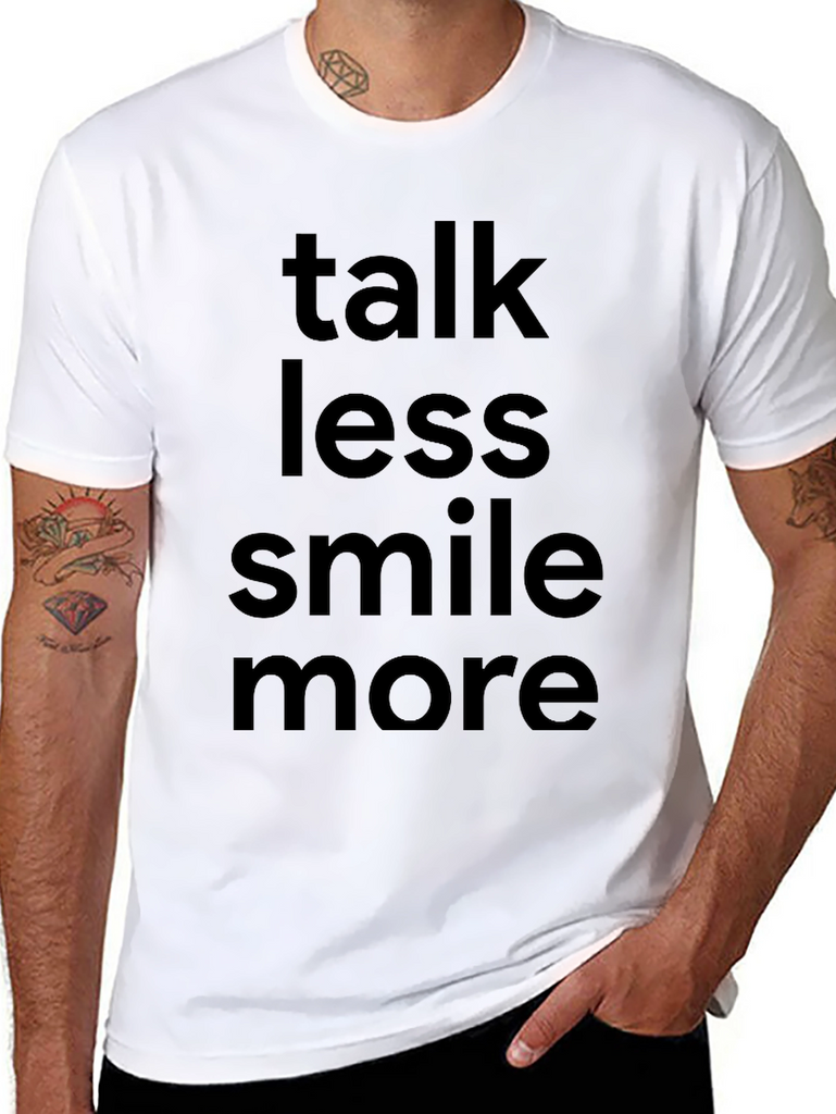 This stylish black t-shirt features a bold and minimalist design with the phrase "talk less smile more" printed prominently on the front. The shirt appears to be made of soft, breathable fabric, possibly cotton or a cotton blend, ensuring comfortable wear. The design promotes a positive and introspective message. The shirt has a classic fit with short sleeves, making it versatile for various casual occasions. Pair it with jeans, shorts, or chinos for a relaxed and effortlessly cool look. It's perfect for expressing your personality and spreading good vibes wherever you go.