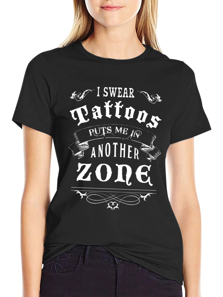Express your love for ink with this eye-catching black t-shirt. Featuring a bold, stylized graphic that reads "I SWEAR Tattoos PUTS ME IN ANOTHER ZONE," this tee is perfect for tattoo enthusiasts. The design is rendered in a clean white font, creating a striking contrast against the dark background. Crafted from a soft, comfortable fabric, this shirt is ideal for everyday wear. Whether you're hitting up a tattoo convention, hanging out with friends, or just relaxing at home, this t-shirt is sure to turn heads and spark conversations. Show off your passion for body art with this unique and stylish piece.