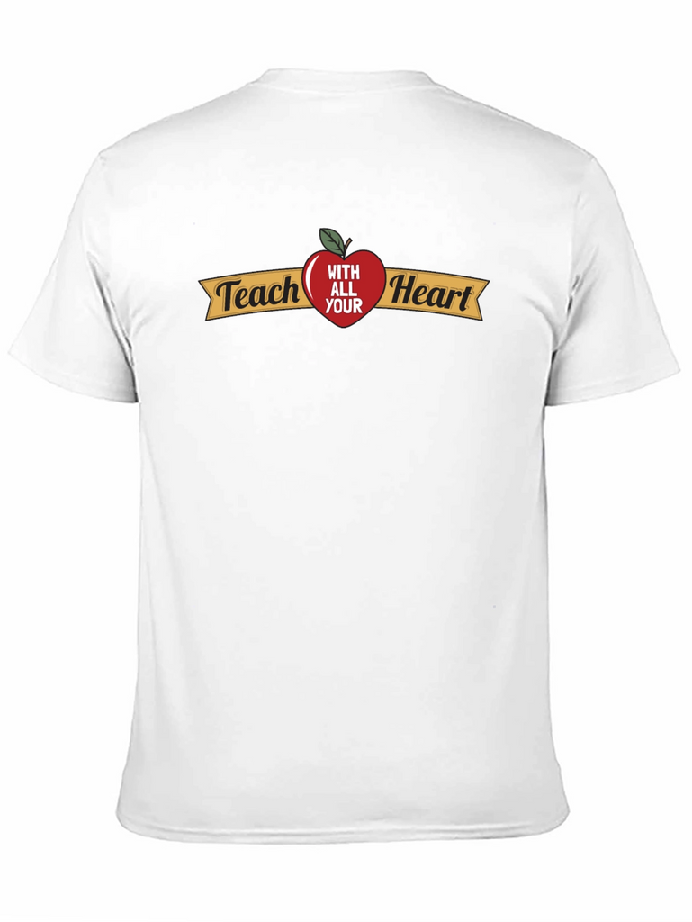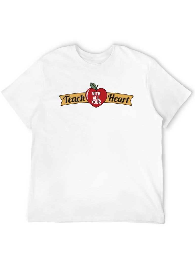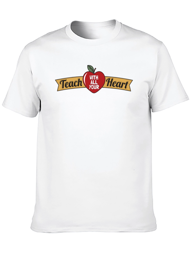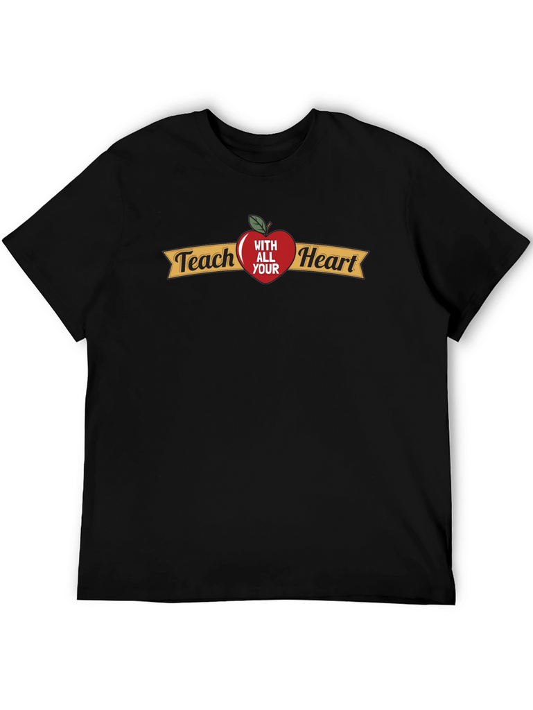 Show your passion for teaching with this stylish black t-shirt. The shirt features a creative graphic with the phrase "Teach with All Your Heart", adorned with a vibrant apple design. Made from comfortable, breathable fabric, this tee is perfect for everyday wear, whether you're in the classroom or out and about. The design is eye-catching and positive, making it a great conversation starter and a unique way to express your dedication. This t-shirt is a must-have for educators who want to showcase their love for teaching in a fashionable way.