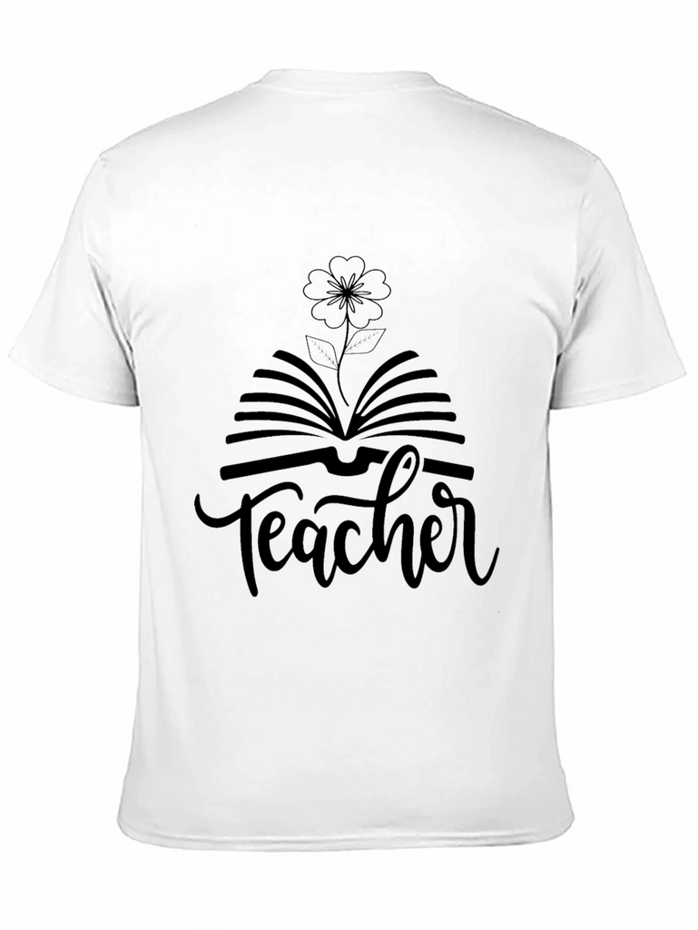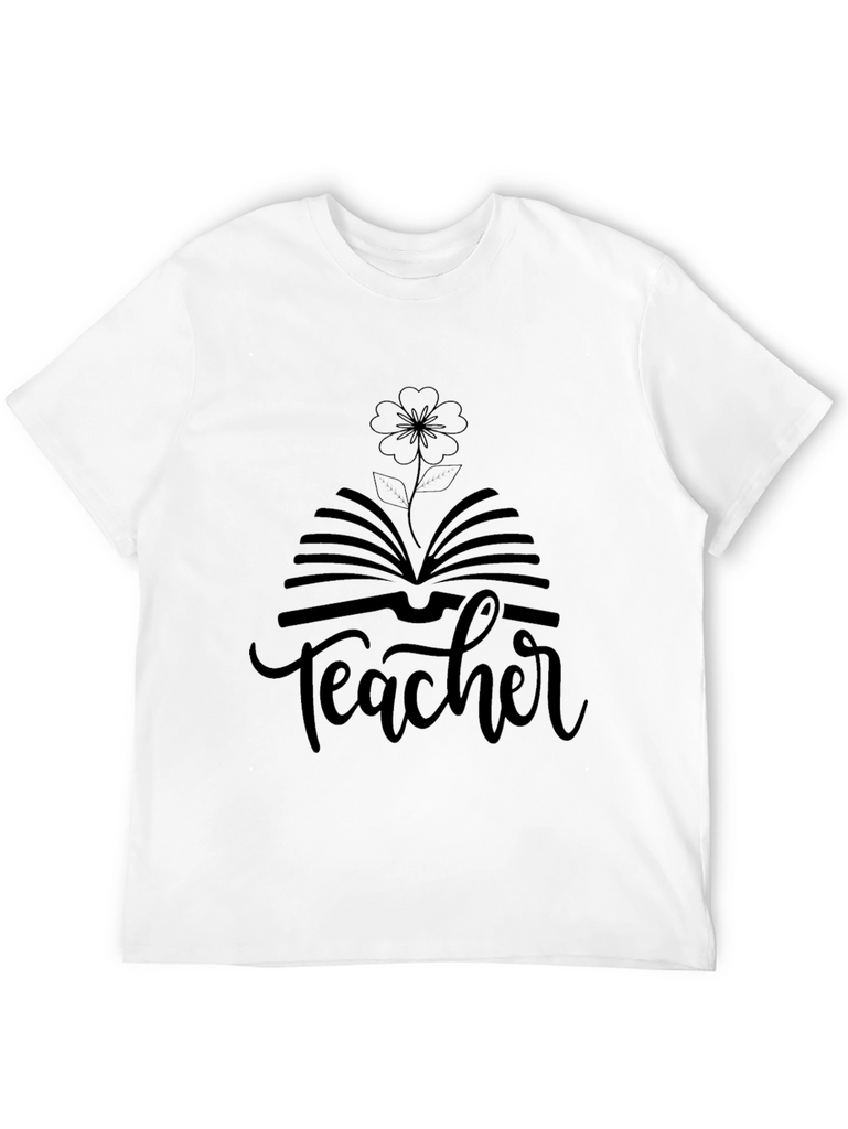 Show your appreciation with this stylish black t-shirt featuring a unique design. The shirt showcases an open book with a flower rising from its pages, accompanied by the word "Teacher" in an elegant script. Made from a soft, comfortable fabric, this tee is perfect for everyday wear, casual outings, or as a thoughtful gift for educators. The bold black color makes the design pop, ensuring you'll stand out in style. Express your passion for teaching and learning with this eye-catching graphic tee. A must-have for any teacher's wardrobe.