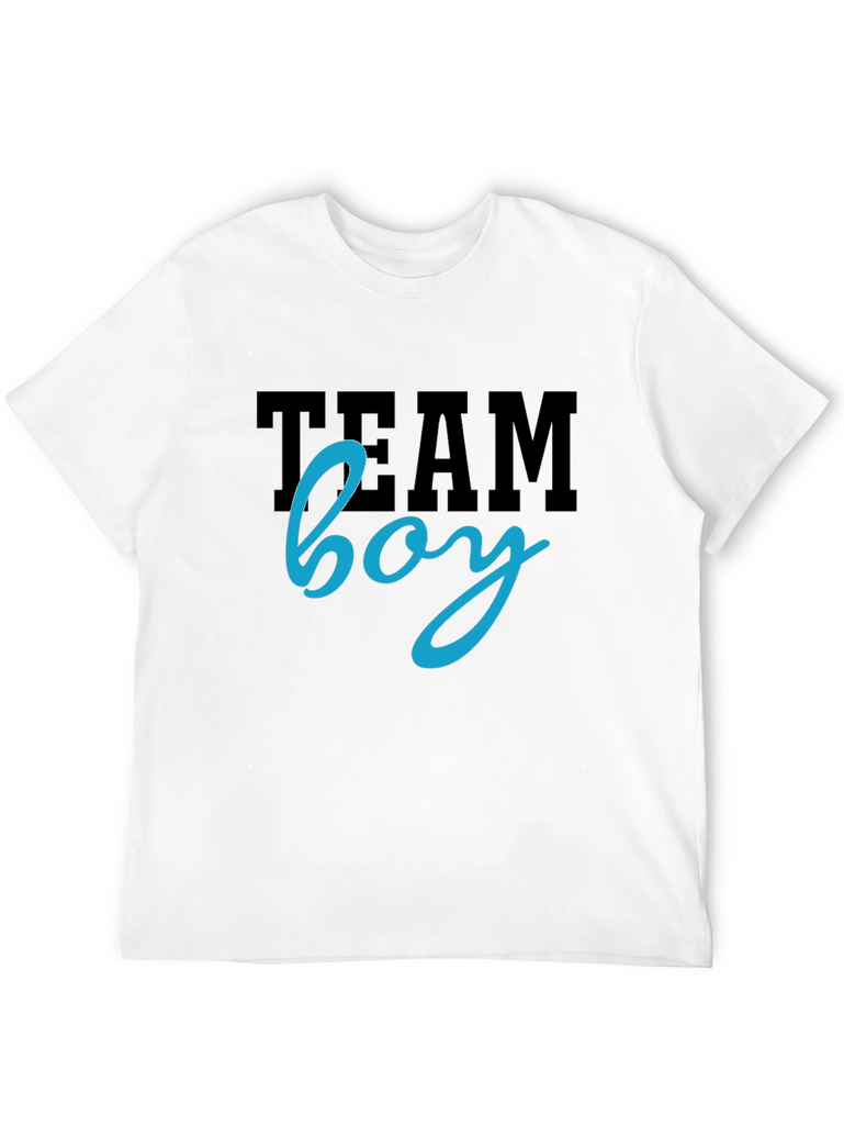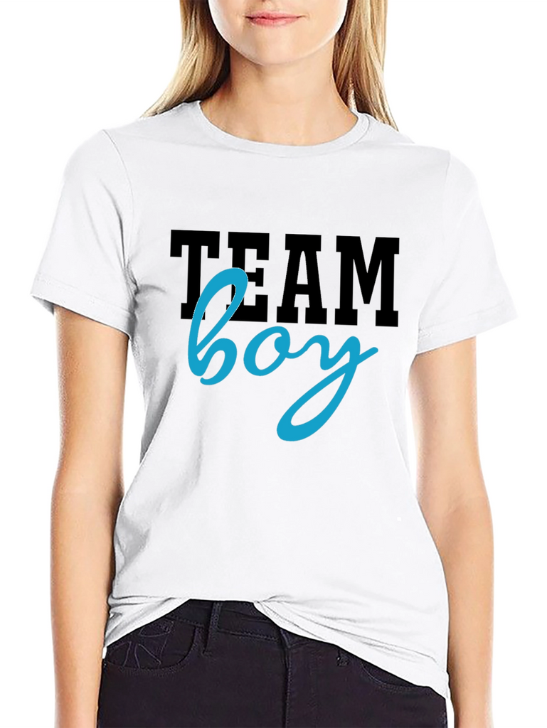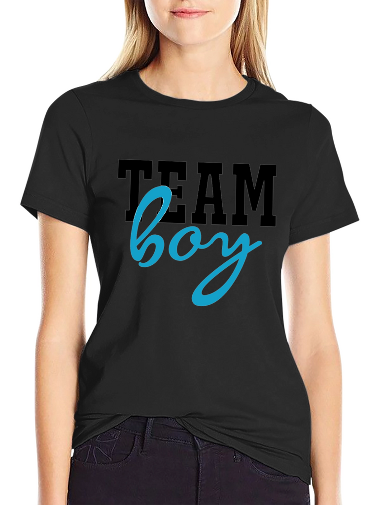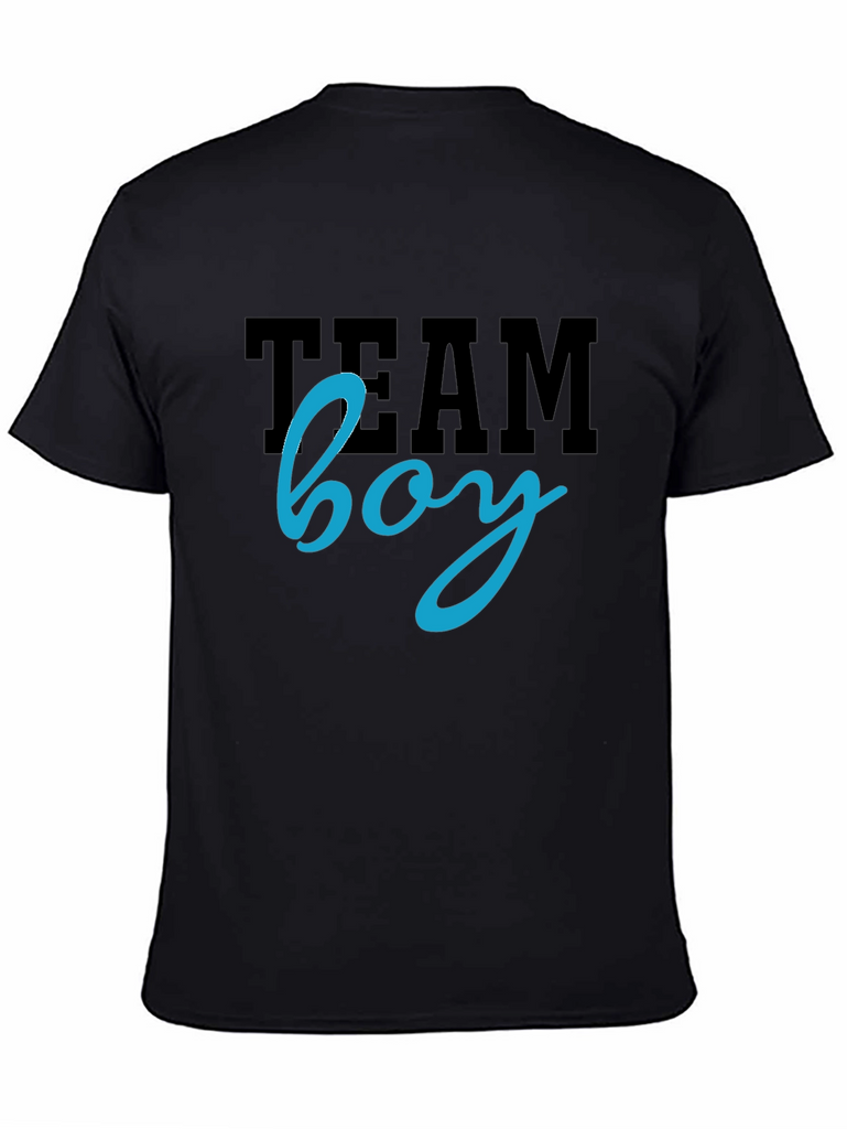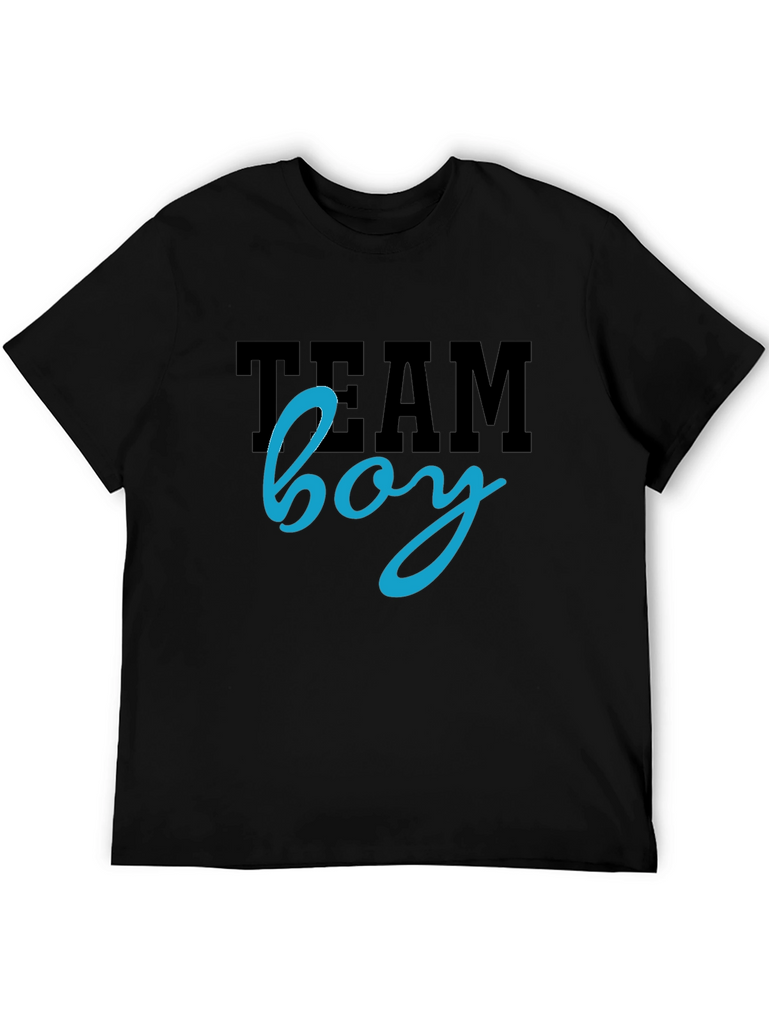 Celebrate your upcoming baby boy with this stylish black t-shirt. Featuring the bold text "TEAM" in a blocky font and the word "boy" in a flowing, cursive-style script, this shirt is perfect for gender reveal parties or baby showers. The comfortable fabric and classic fit make it ideal for all-day wear. Show your excitement and team spirit with this must-have addition to your wardrobe, or give it as a memorable gift for expecting parents. Get ready to welcome your little boy in style!