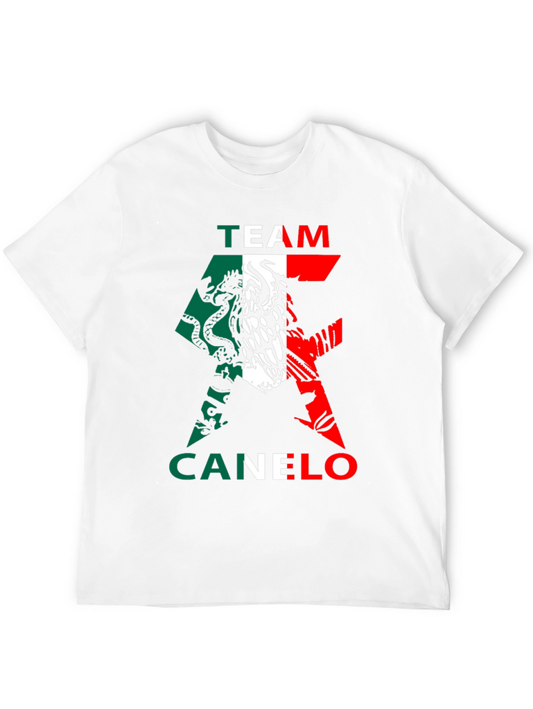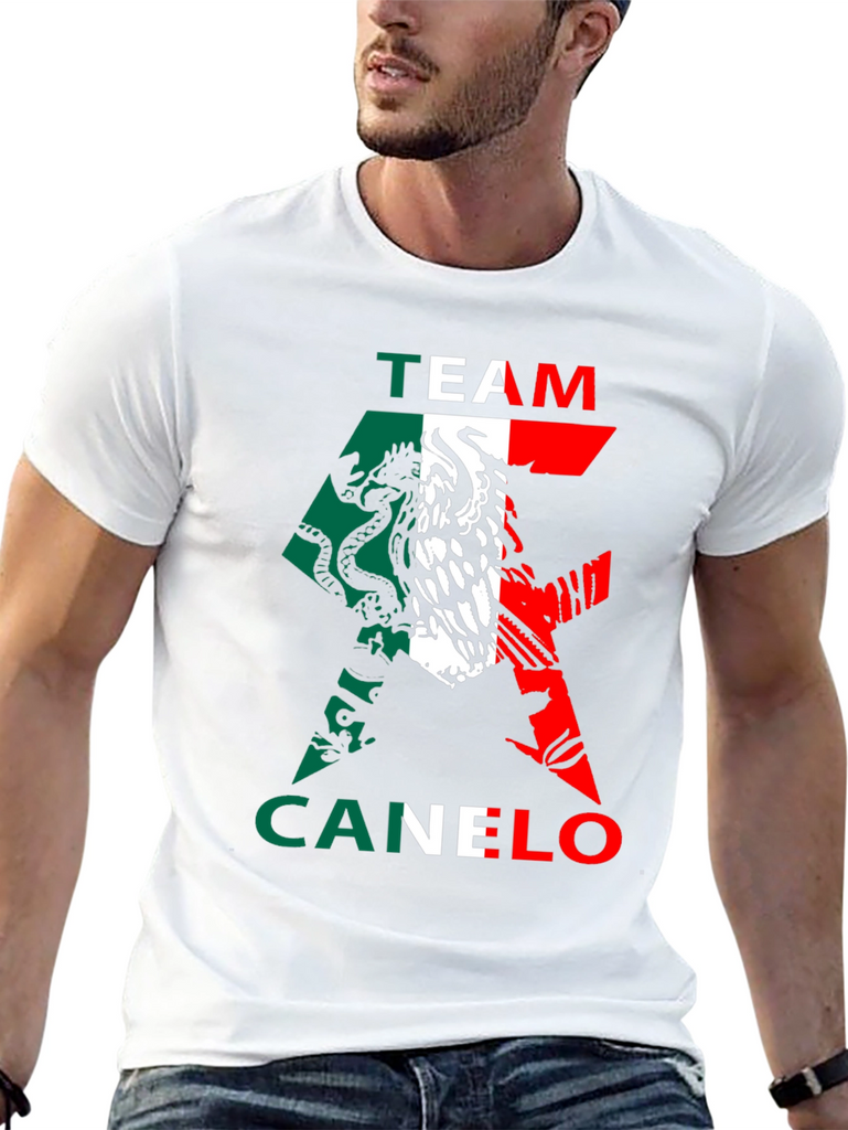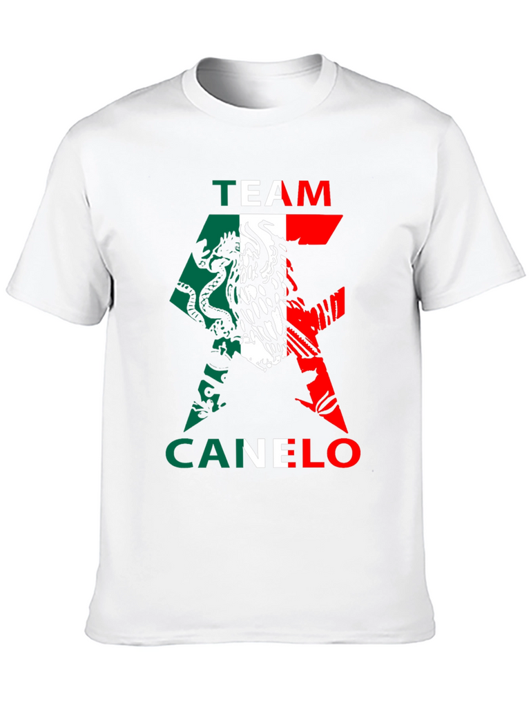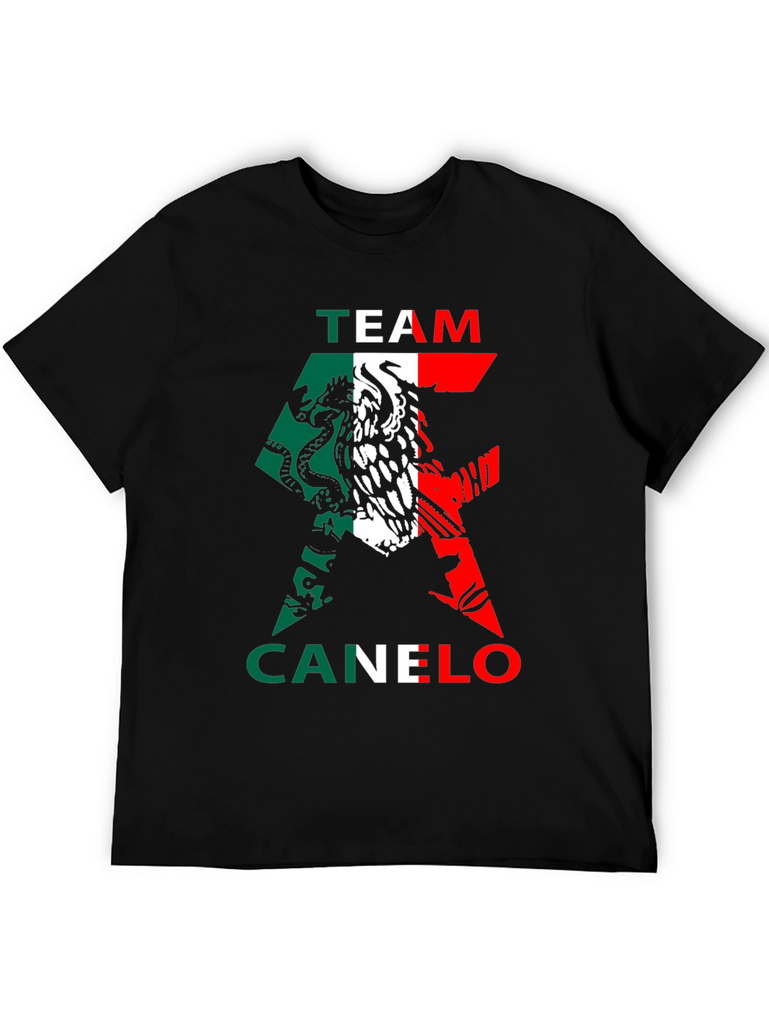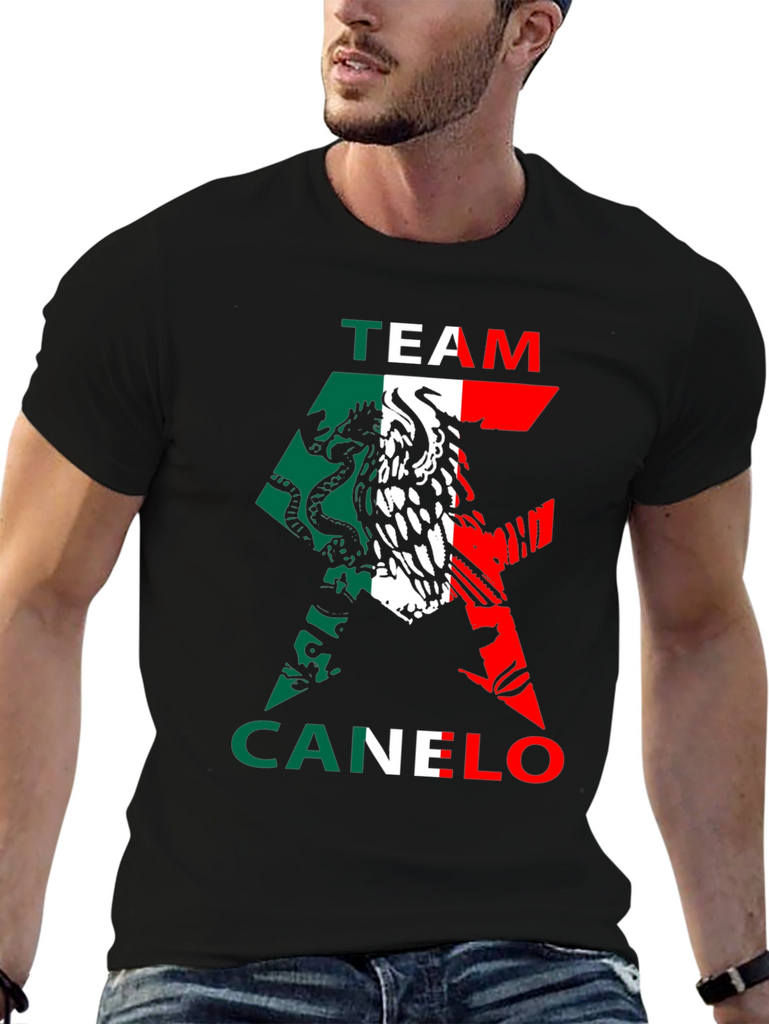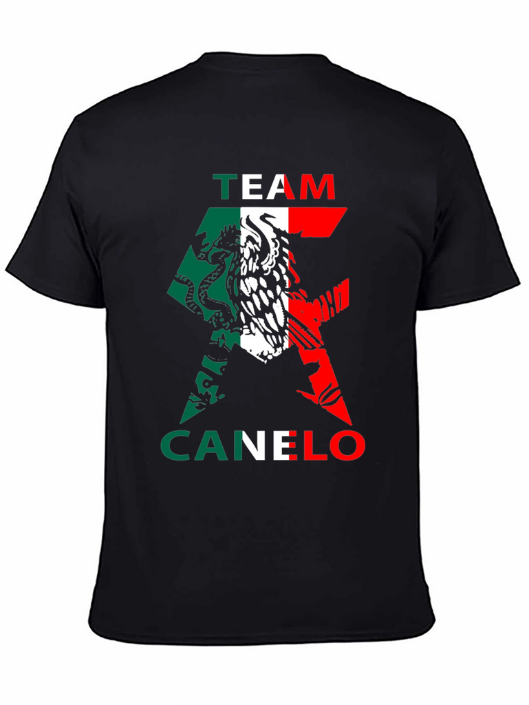 Show your support for Canelo with this stylish black t-shirt! Featuring a bold graphic incorporating the Mexican flag colors, the design spells out "TEAM" and "CANELO." The vibrant green, white, and red details are eye-catching. Made from what appears to be a soft, comfortable fabric, this tee is perfect for casual wear, sporting events, or any occasion where you want to display your love for boxing and Mexican pride. This shirt makes a great gift for any Canelo fan and is sure to be a favorite in their wardrobe!